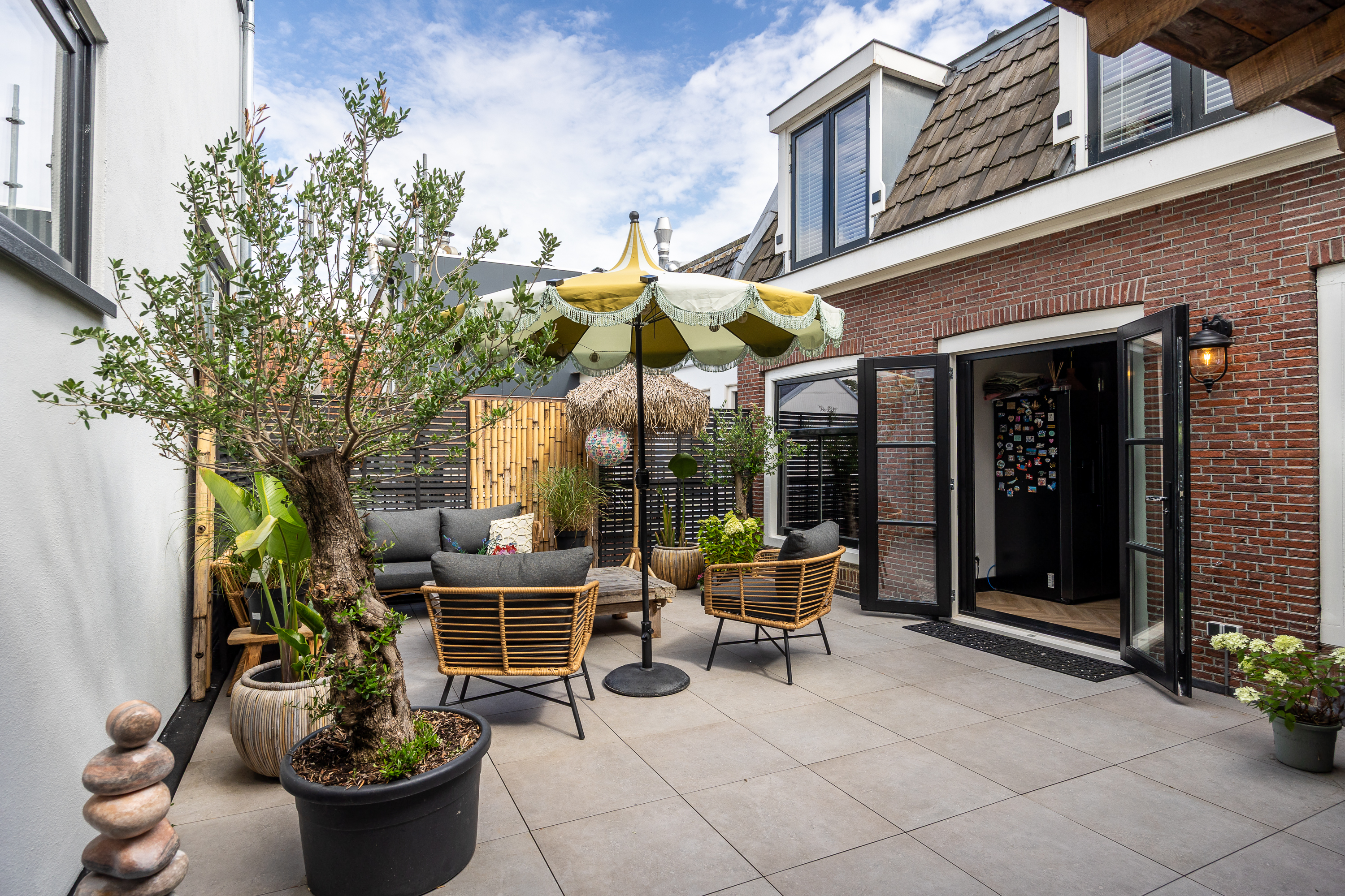 Through a hallway with built-in cupboards and space for an extra refrigerator, you step right onto the roof terrace. This spacious, sunny terrace is fully tiled and equipped with an attractive canopy, a fixed bench, and a custom-made table. Here you will experience complete peace and privacy, right in the center of town. A wonderful outdoor retreat, perfect for dinners, drinks, or a cup of coffee in the morning sun.