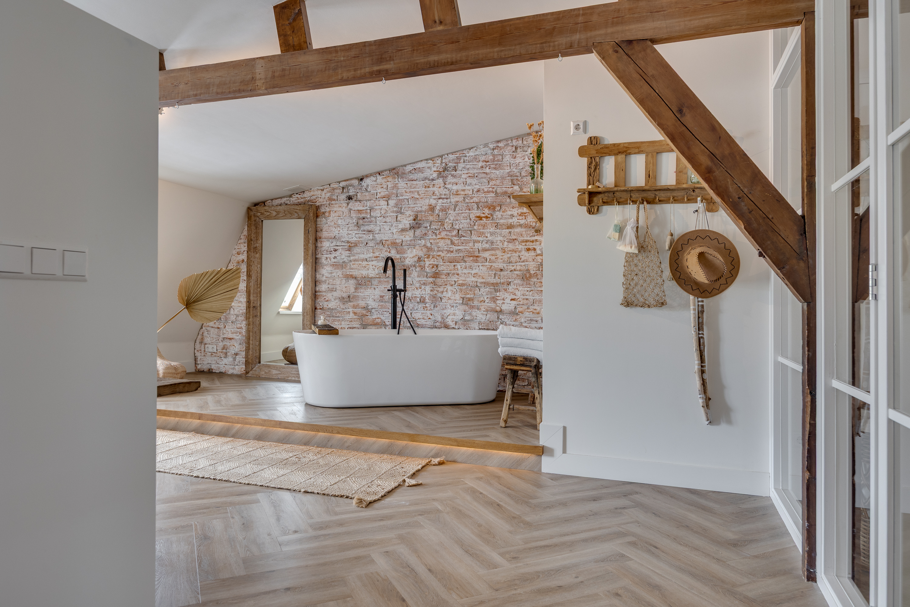 There is also a second bathroom with a walk-in shower, washbasin, toilet, and space for a washing machine and dryer. An additional separate toilet is located on the landing. Authentic wooden beams have been left exposed and provide an attractive contrast to the modern finish.