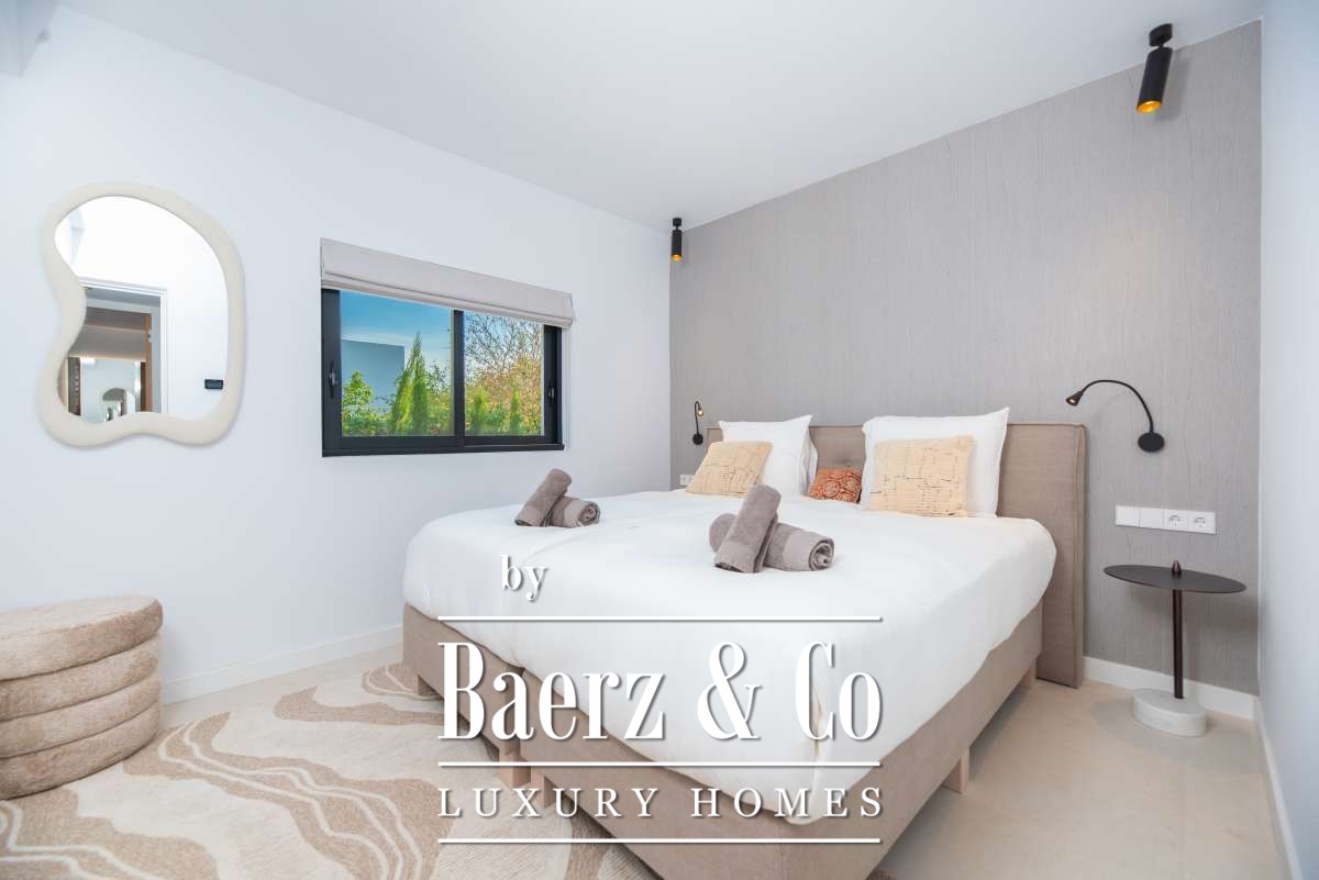 Each of the 5 spacious bedrooms includes an en suite bathroom, with marble finishes, gold fixtures, and walk-in showers. The master suite offers a freestanding bath and serene countryside views. Open living spaces are complemented by a modern fireplace, a sleek marble kitchen bar, underfloor heating, and air conditioning for year-round comfort.