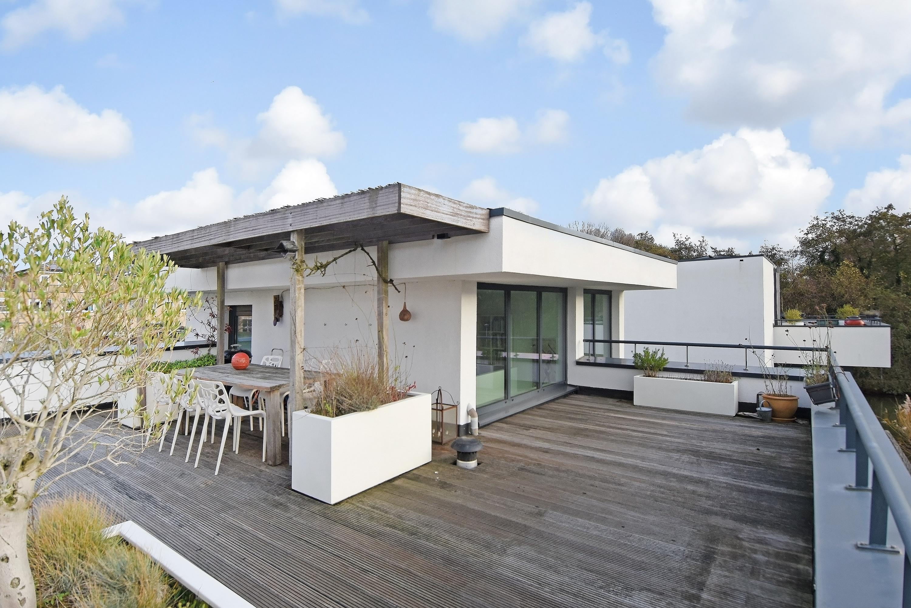 From the kitchen, a staircase leads up to the mezzanine, which can be used for various purposes (e.g. workspace, library, TV room). The biggest surprise is the beautifully landscaped and spacious roof terrace with lots of privacy and atmosphere, where you can enjoy the sun throughout the entire day.