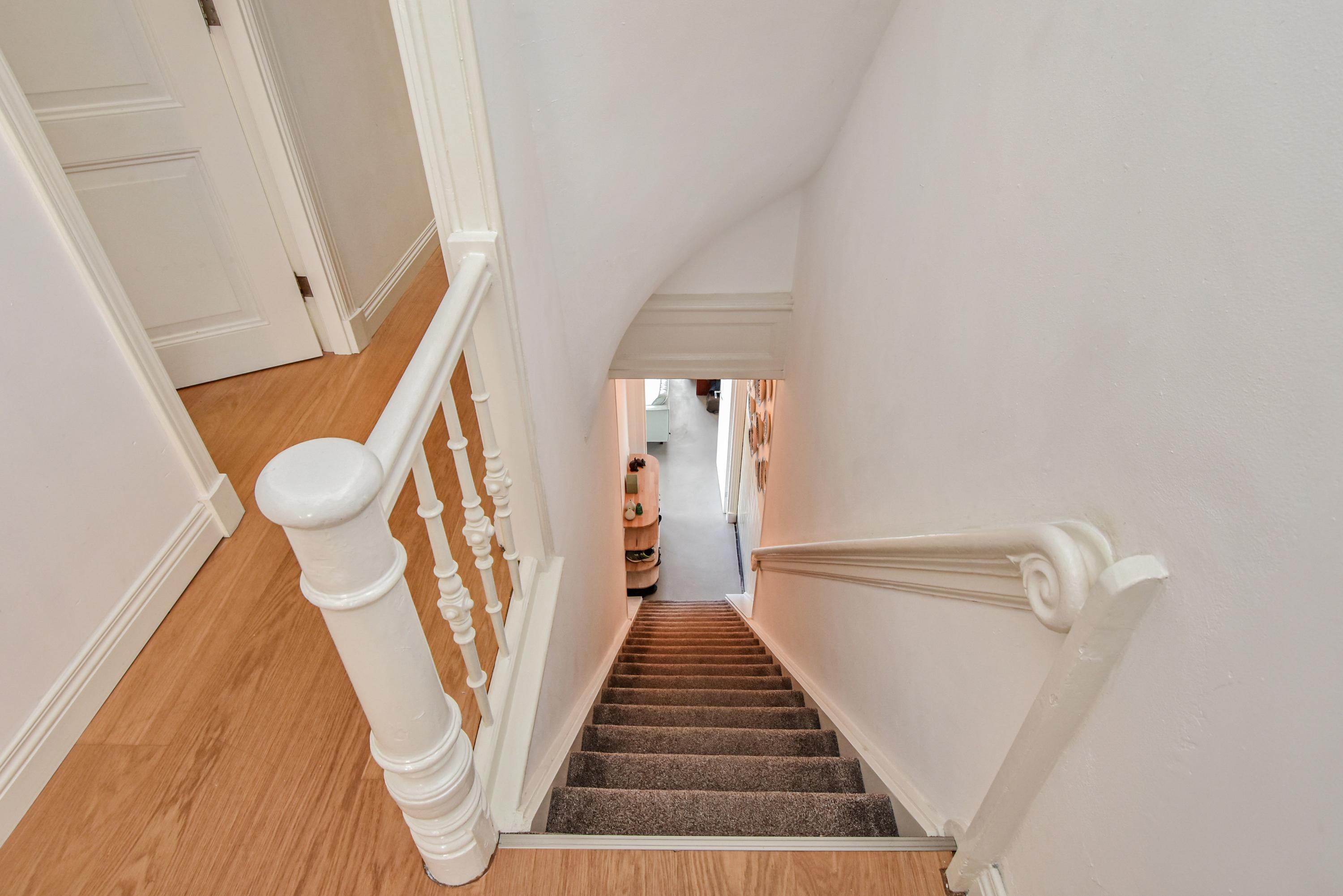 The landing provides access to a separate toilet with washbasin and additional storage space. The spacious and bright front bedroom features a high ceiling and a beautiful view over the canal. There are two additional large bedrooms, one with a walk-in shower and washbasin. All bedrooms are adorned with stained-glass windows. A separate laundry room gives access to the roof garden—a delightful, sheltered spot with optimal sunlight. From early morning until late evening, you can enjoy the sun, privacy, and a charming green setting. The terrace also includes a large wooden storage shed.