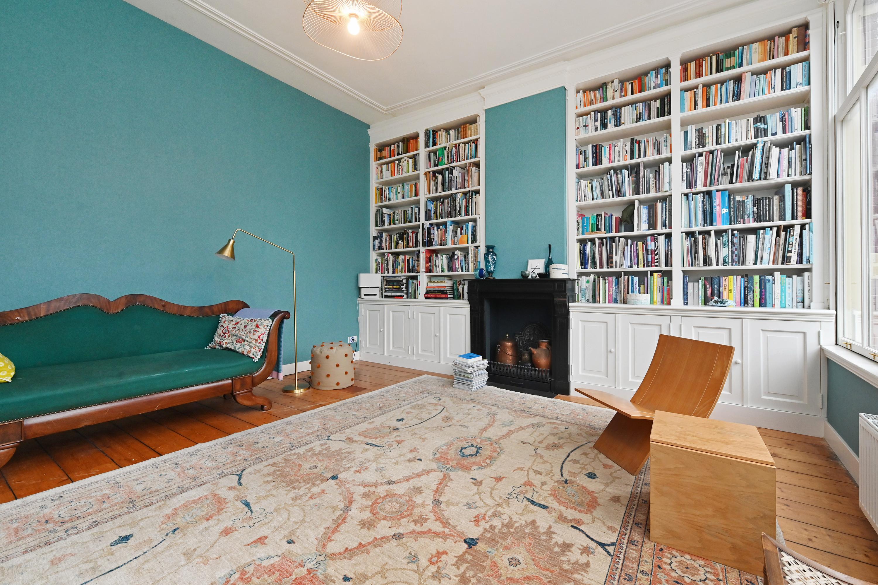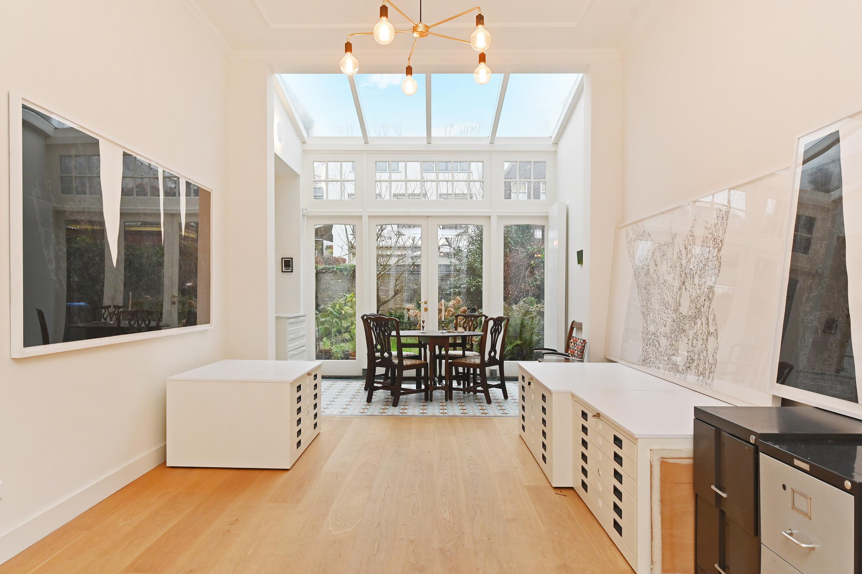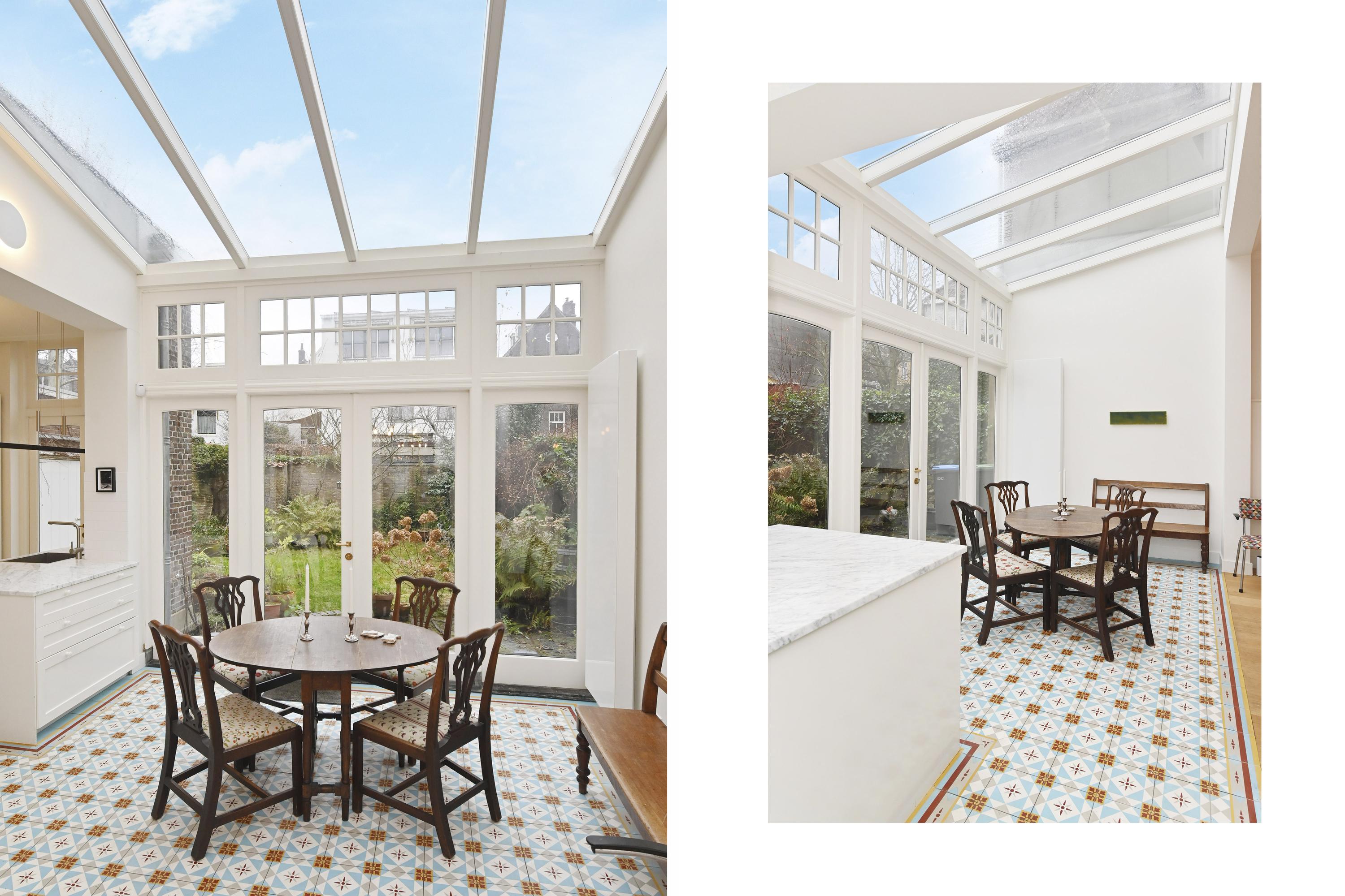 Through French doors in the dining room and kitchen, there is access to the extra-wide and 12-meter-deep, walled back garden. There's always a spot to sit out in the sun or shade, even into the evening.