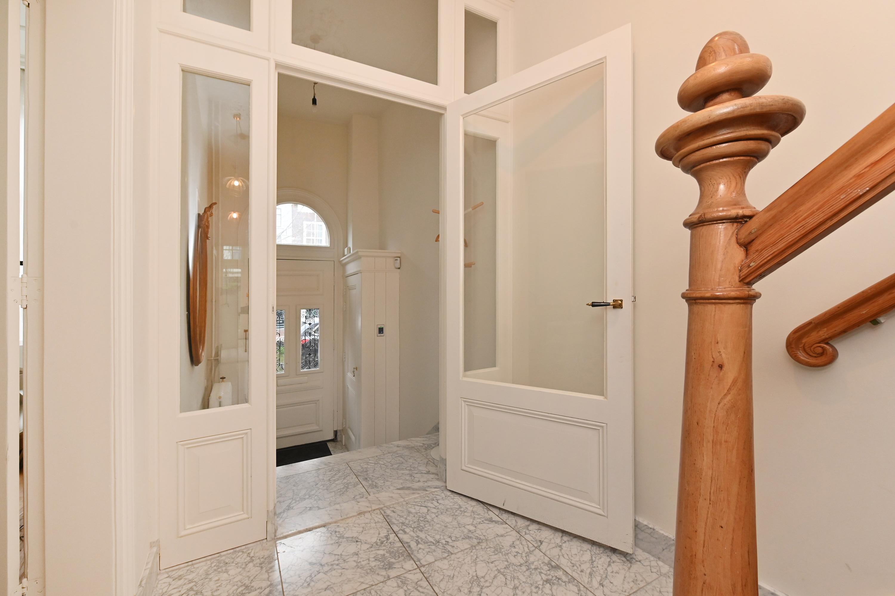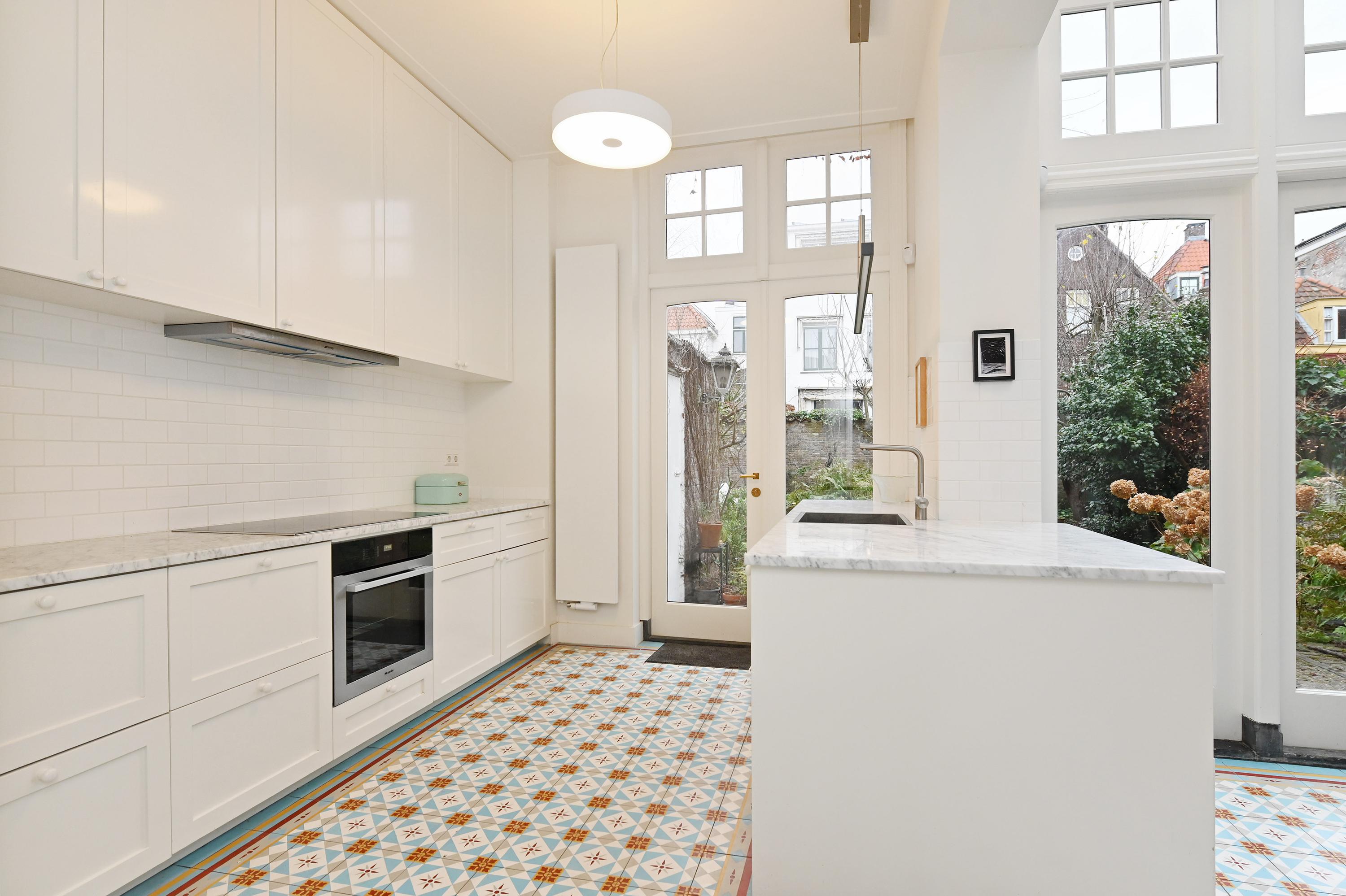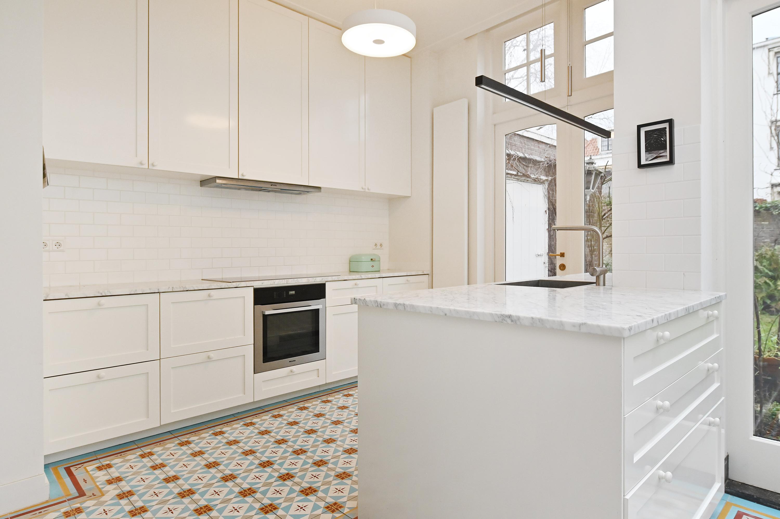Enter the house through the marble vestibule, up a marble staircase, through the glass door and into the hallway. The hallway includes a generous storage cupboard and a modern toilet. From the hallway, there is access to the open-plan kitchen, living and dining rooms. The living room is stylish, boasting high ceilings with moldings, built-in en-suite wardrobes, and beautiful sliding doors leading to the dining room. The dining room is particularly special thanks to the beautiful renovated rear extension, which floods the room with natural light, from the tall windows and glazed roof. The kitchen features a semi-island that opens onto the living room and offers a beautiful view of the garden. The butler-style kitchen has a modern finish with a marble countertop and is equipped with various built-in appliances.