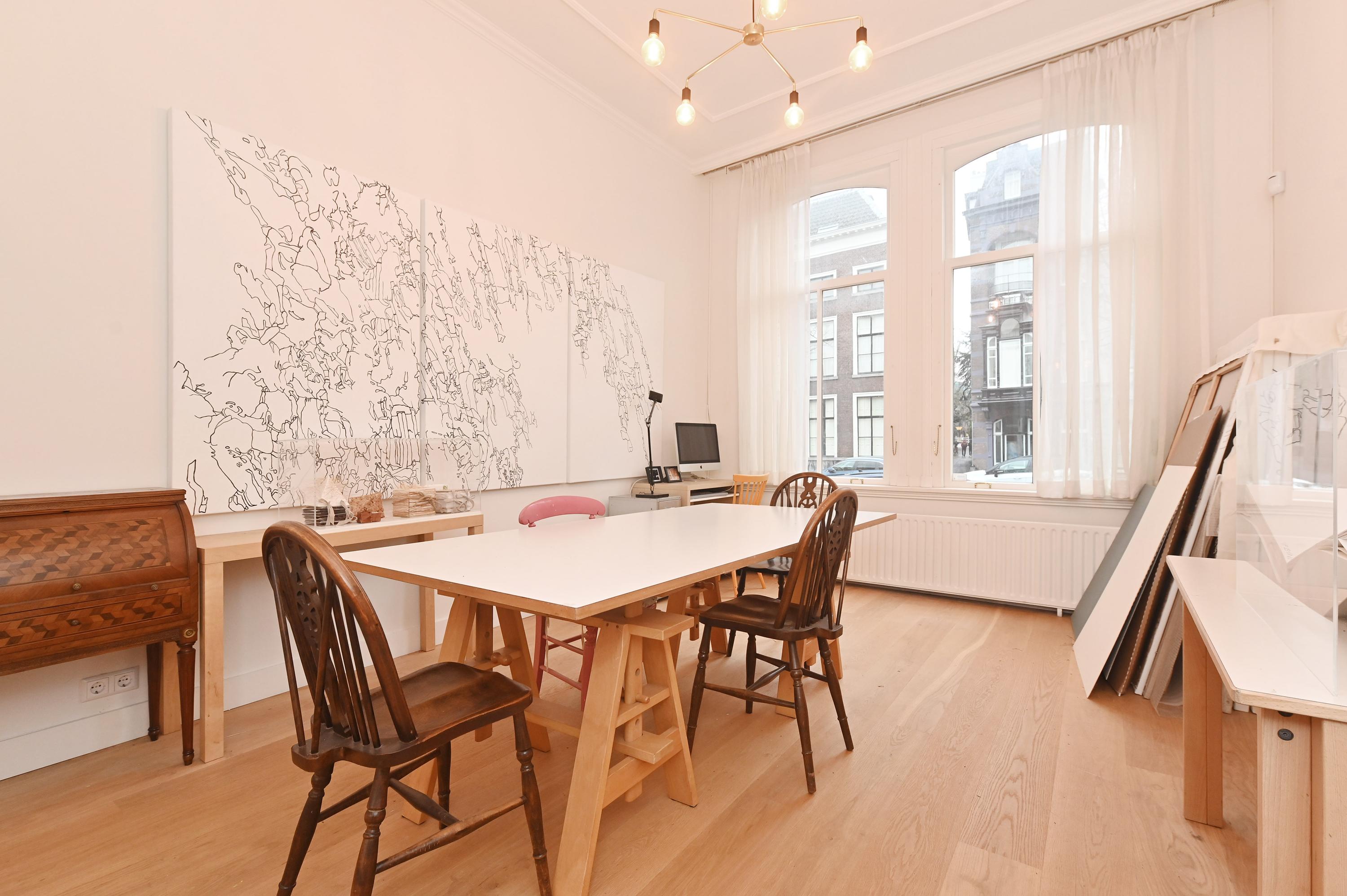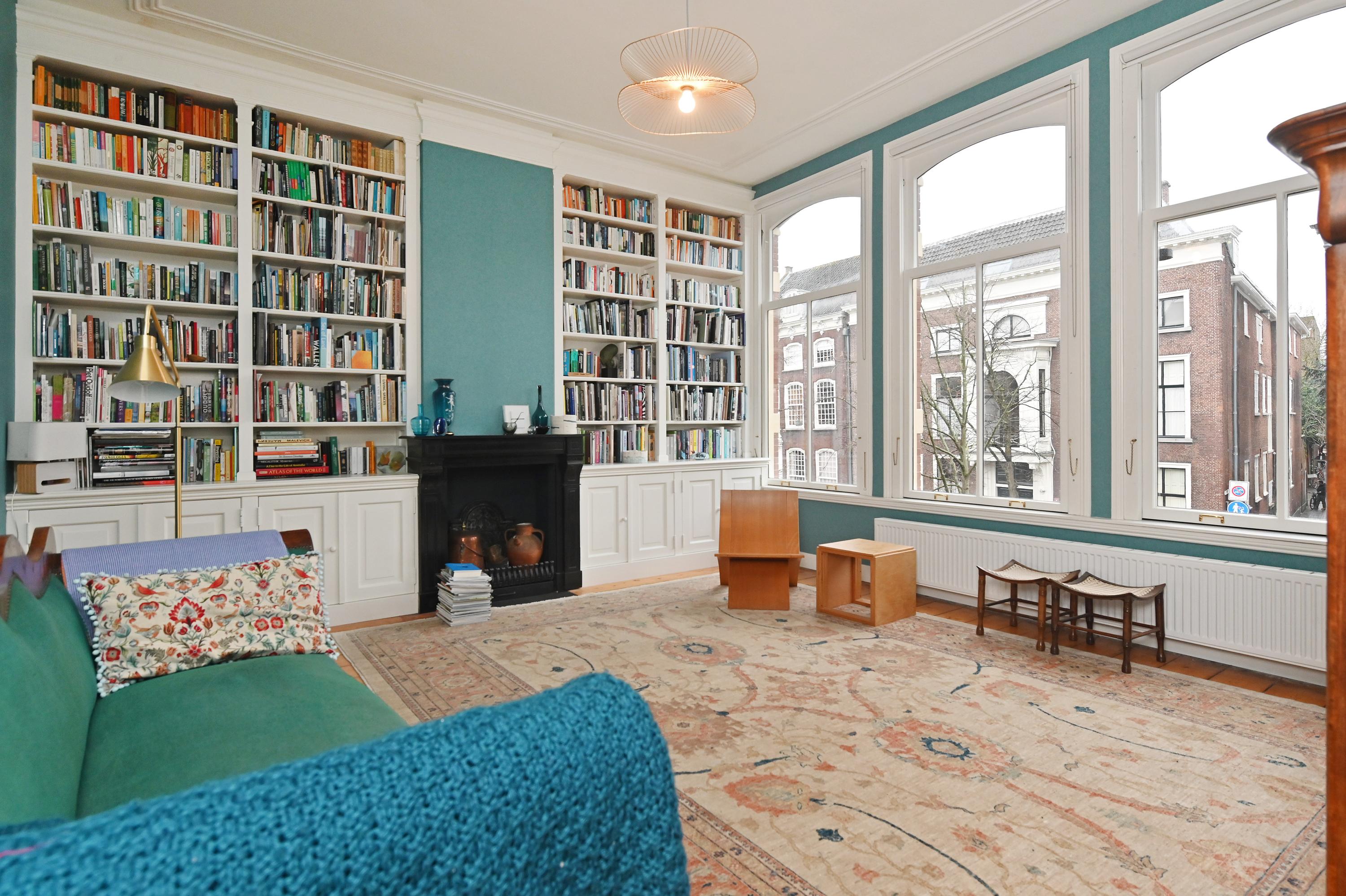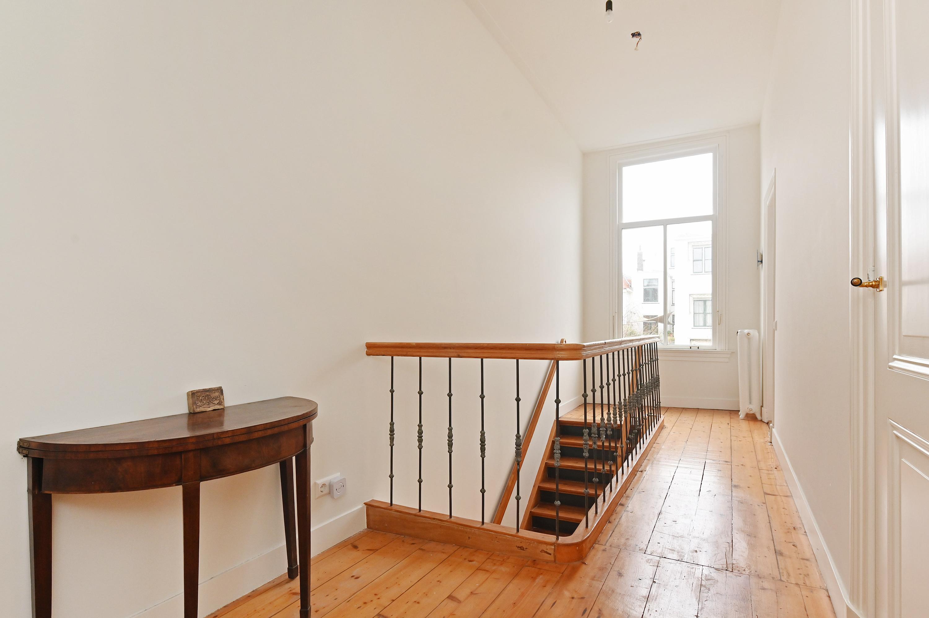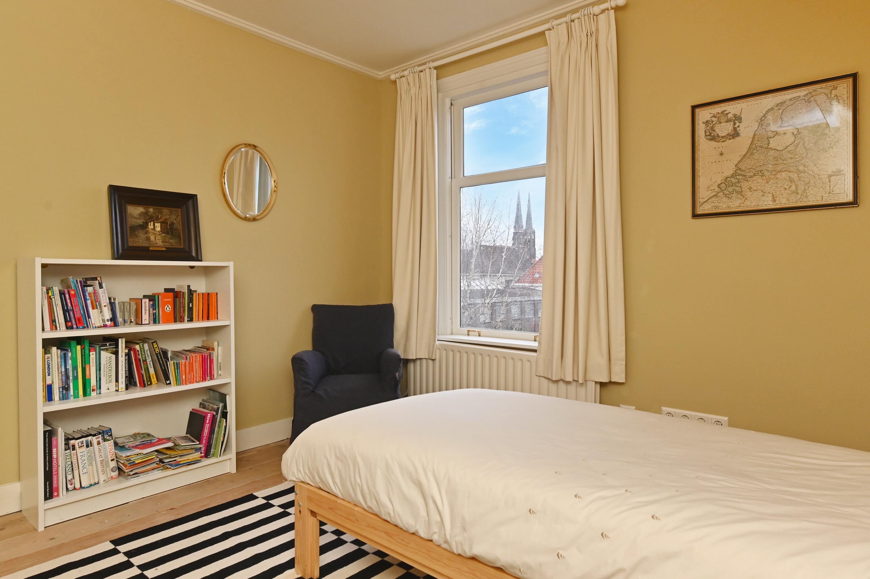 A wide landing with a built-in cupboard and access to the spacious front room with an inviting fireplace, a beautiful black marble mantelpiece, and wooden floors. The three tall windows offer stunning views of the Oude Delft canal. This room is currently used as a second living room, but could also serve as a lovely study, playroom, or bedroom.