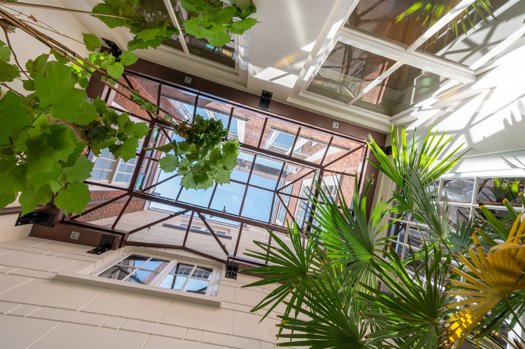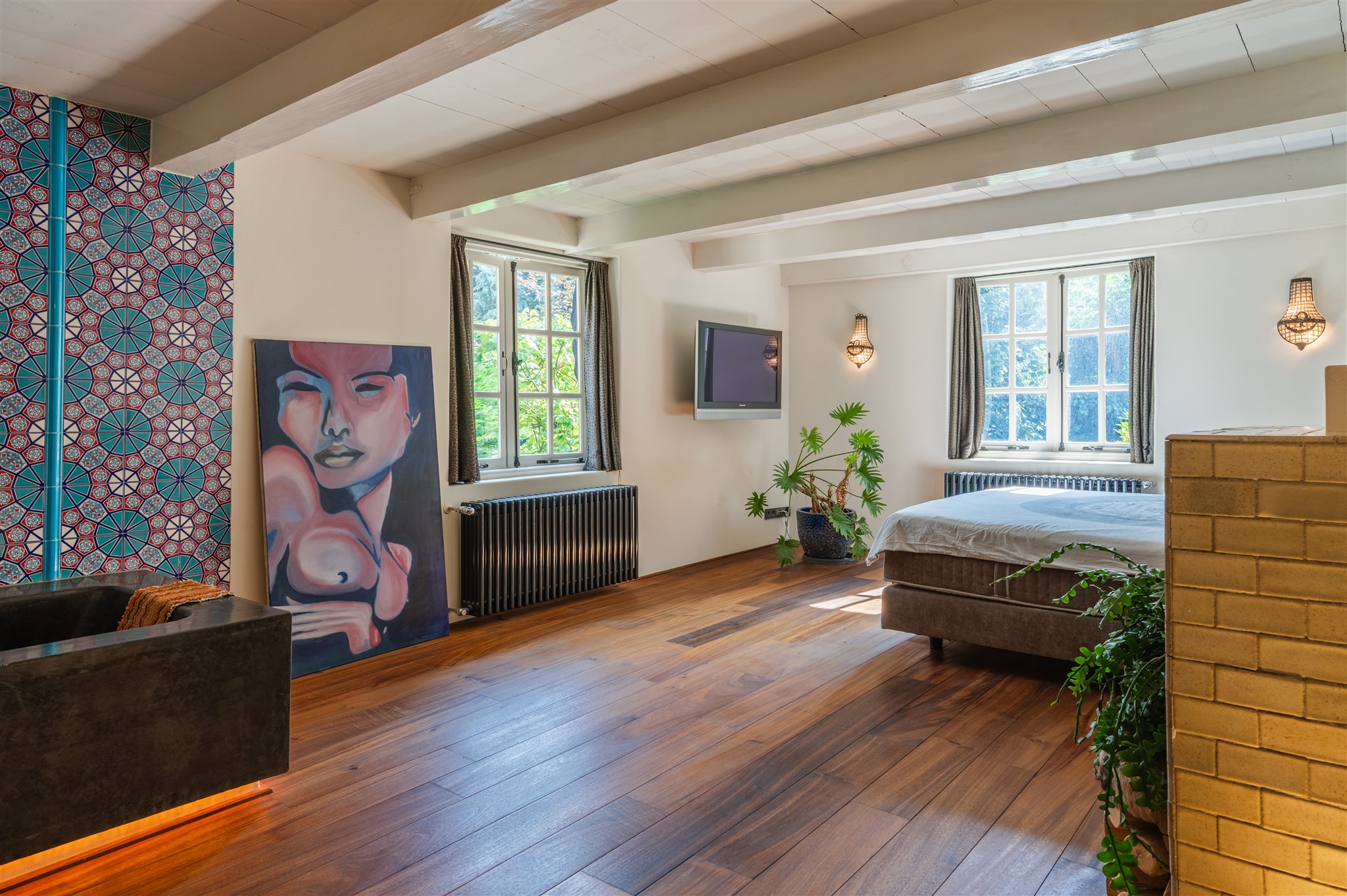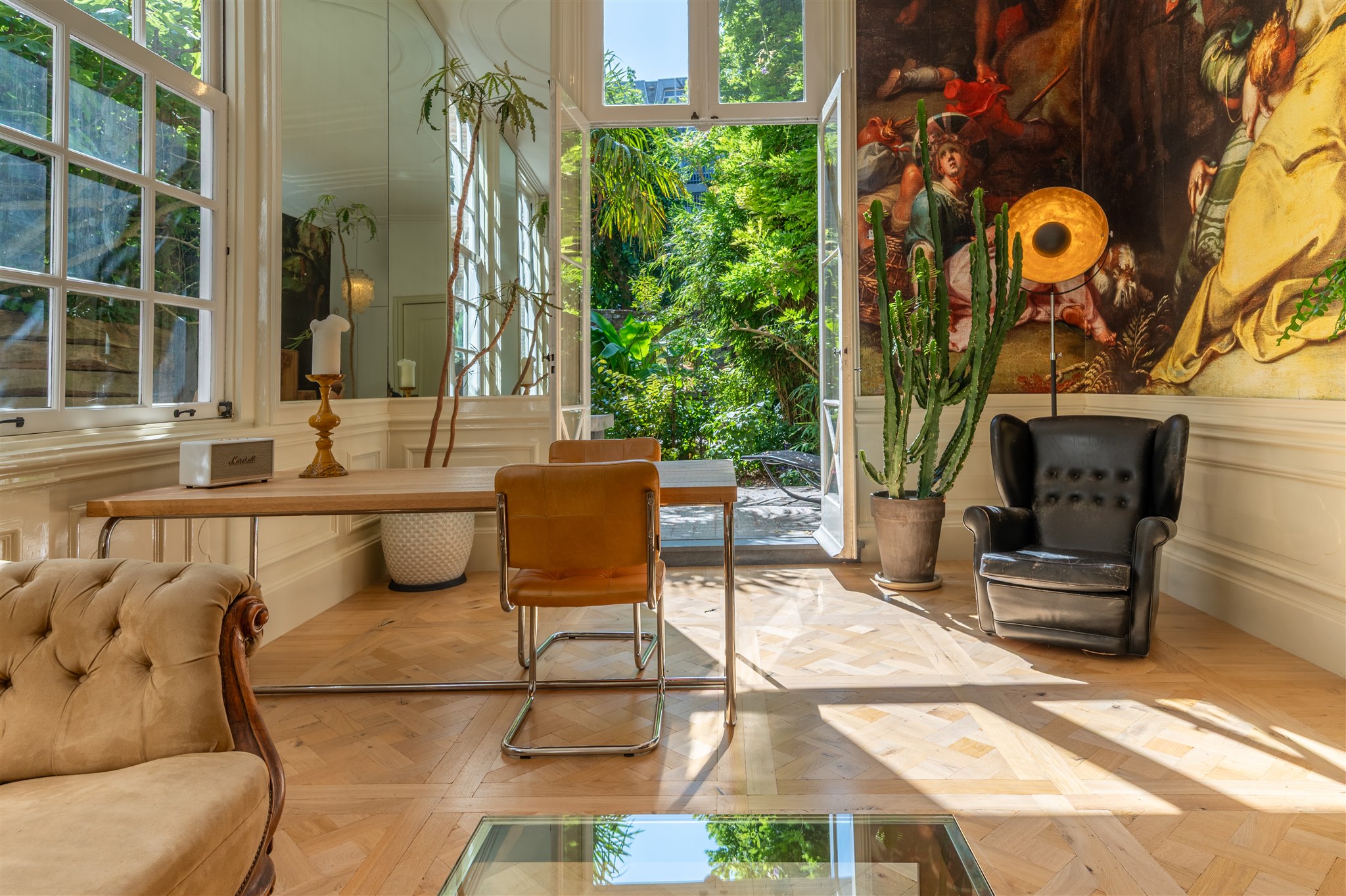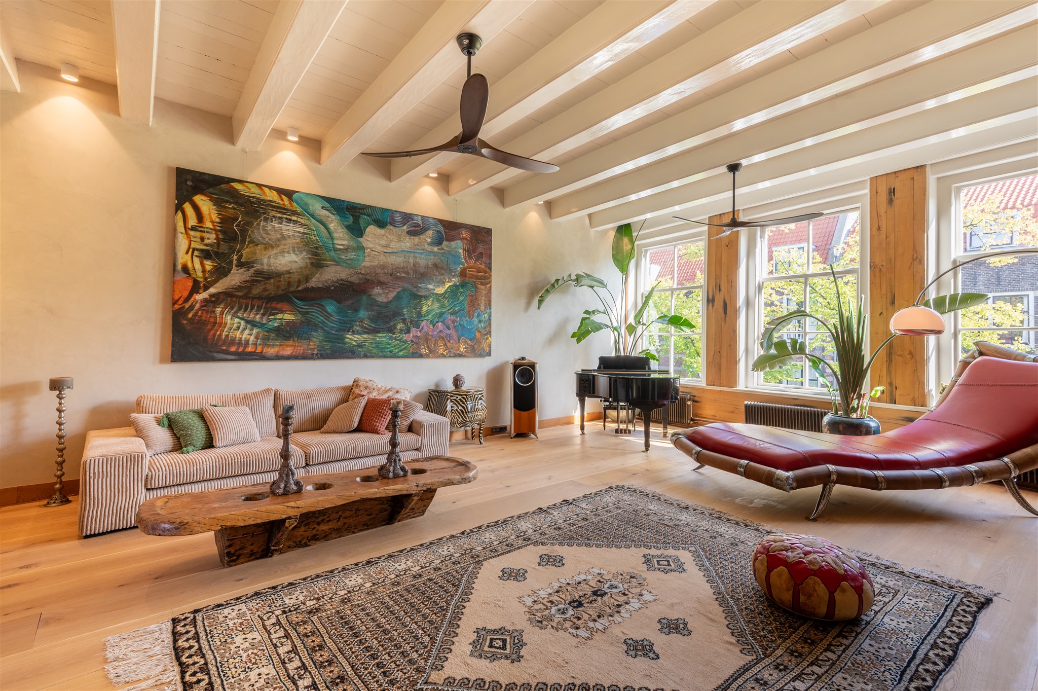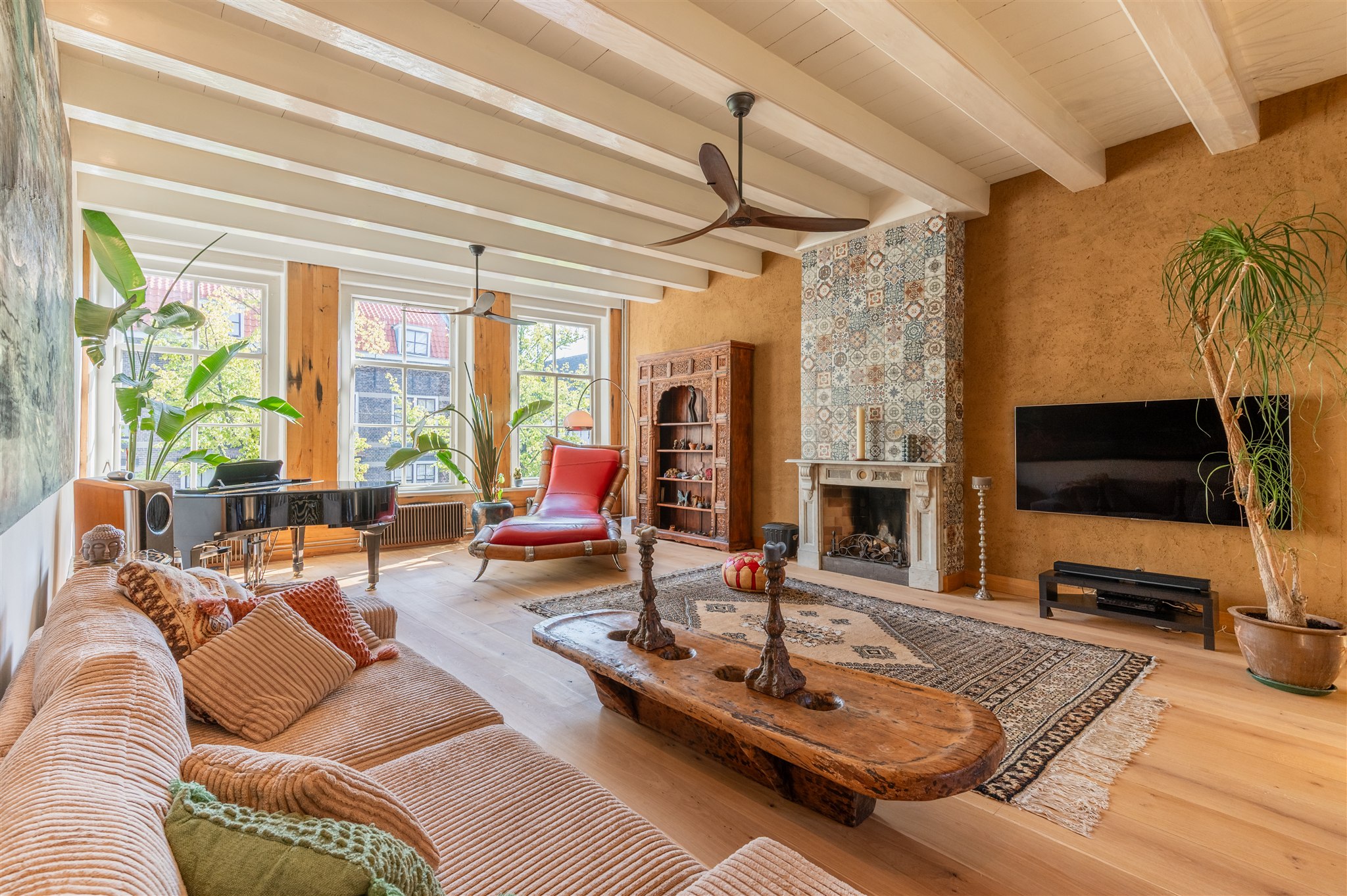 At the front: the grand living room with soaring four-metre ceilings, oak flooring, and a splendid view over the canal and the historic Armamentarium.