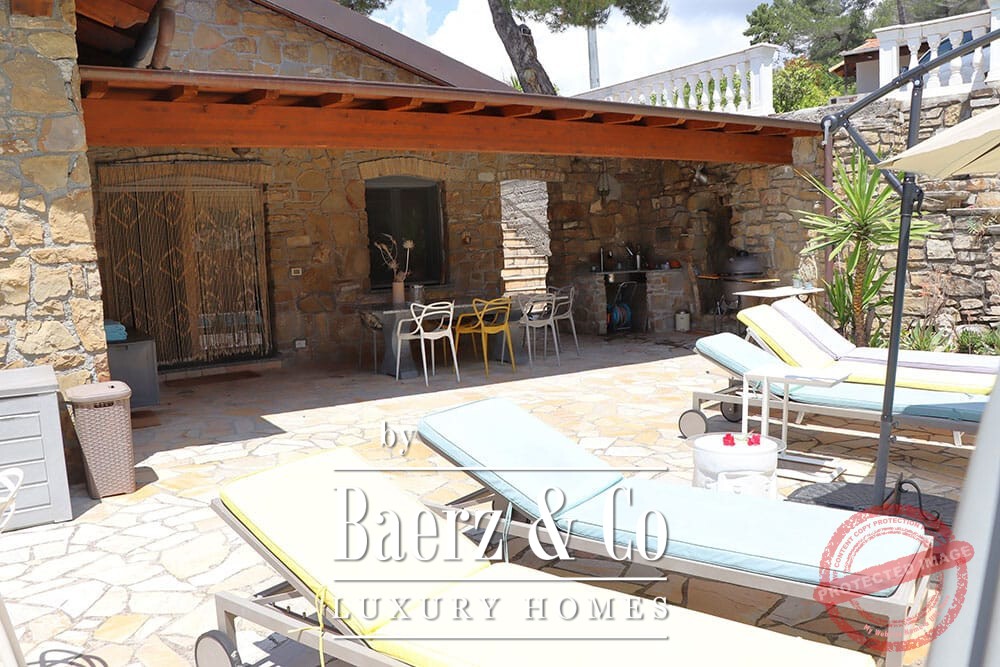 Access is through a private road with a remote-controlled gate, ensuring privacy and quiet. There is parking for several cars. The medieval village of Dolceacqua is less than ten minutes away, with the coast and towns such as Ventimiglia, San Remo, and Monte Carlo within easy reach. Direct hiking routes lead from the property into the surrounding hills and picturesque villages, while beaches and cultural events remain close at hand. This luxury villa for sale in Dolceacqua offers peace, provenance, and a distinct sense of place, allowing owners to embrace both seclusion and the richness of Ligurian life.