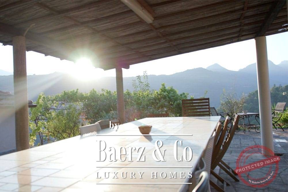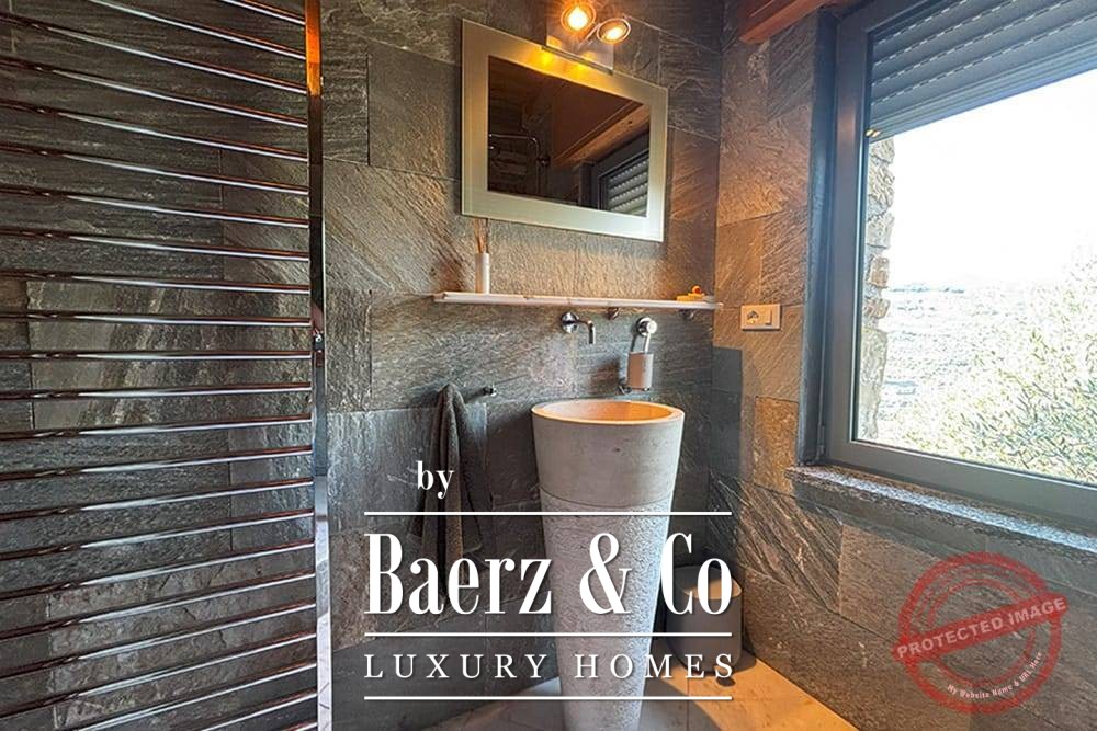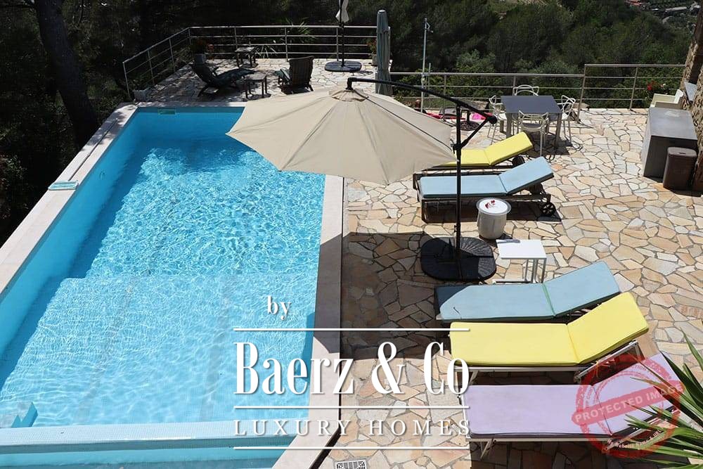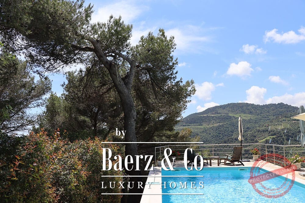 The 11 by 4 metre swimming pool, fully renovated in 2022, lies next to an expansive terrace, offering views over the valley and out to the sea. Multiple terraces, outdoor kitchens, and shaded pergolas invite relaxed dining through all seasons. Paths around the house are lined with olive groves, with hours of sun ensuring exceptional harvests.