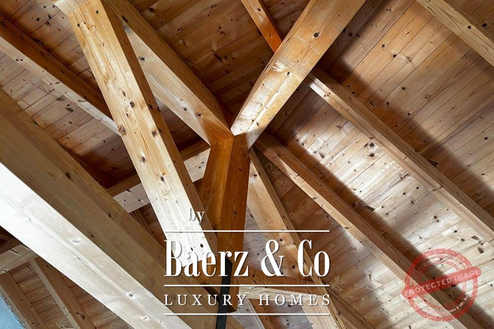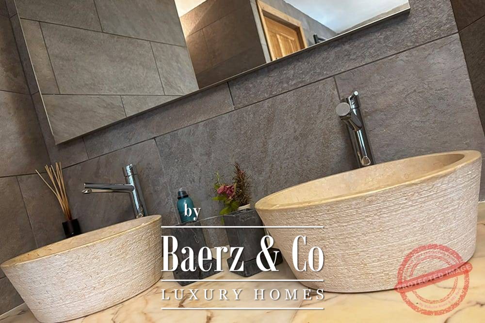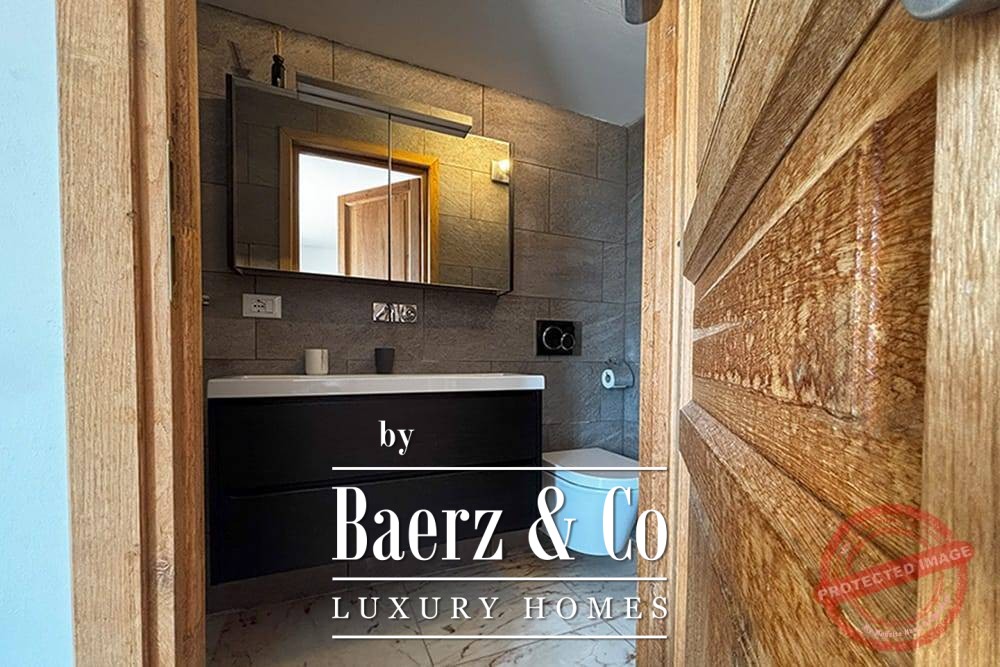 Within its two floors, the villa offers four bedrooms and four bathrooms. Three ground floor bedrooms, each with French doors, open to a lower terrace and mountain vistas. The master suite features a large bath, separate shower, twin marble basins, and designer fittings, defining a sense of sanctuary. The studio bedroom, with private entrance, enhances flexibility for guests or work. Upstairs, a beamed living room with fireplace adjoins a walnut and stainless steel kitchen equipped with premium Miele appliances. High glass doors lead to a lounge with a second fireplace and access to terraces finished with granite tables and Philippe Starck chairs.