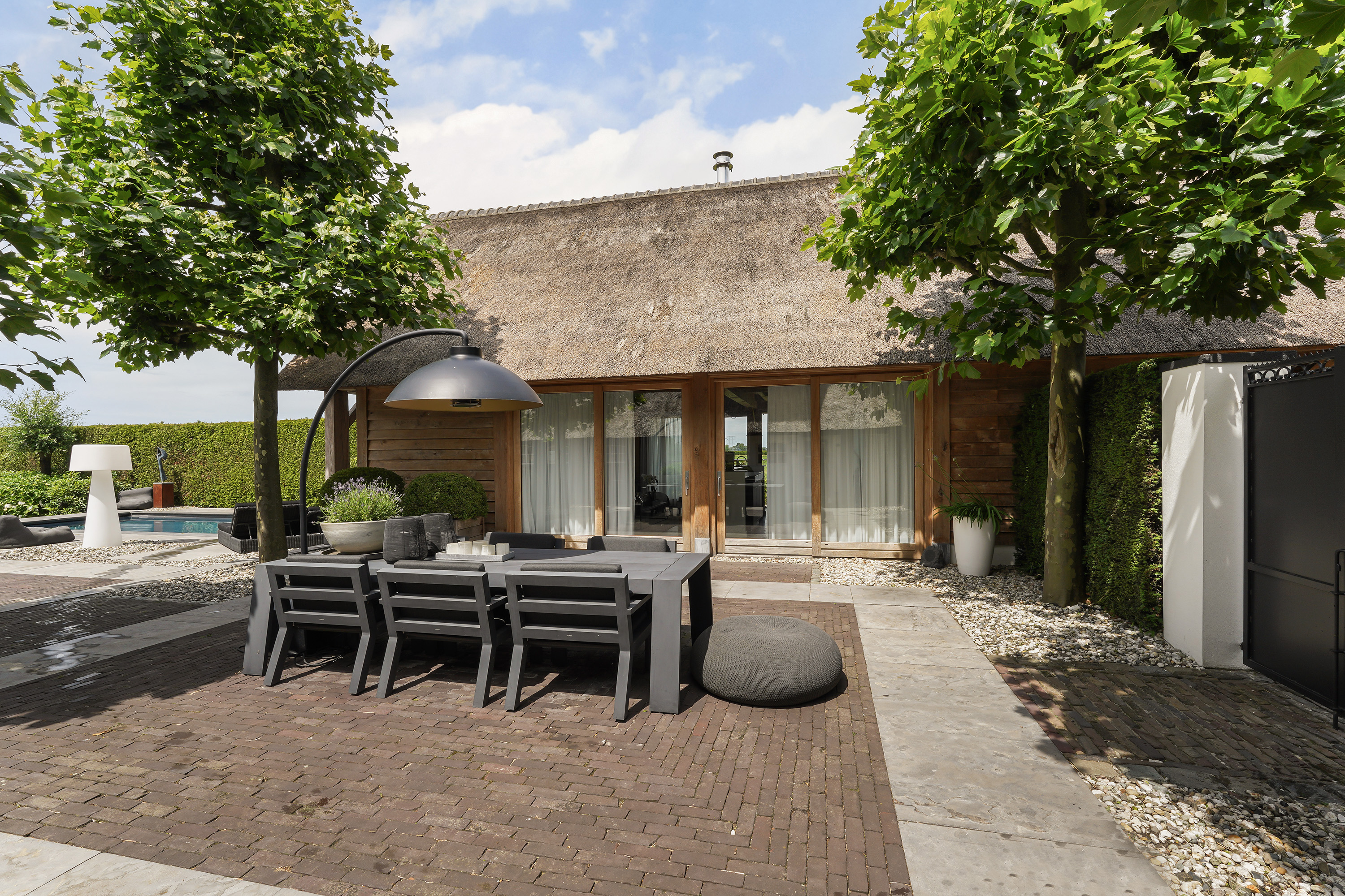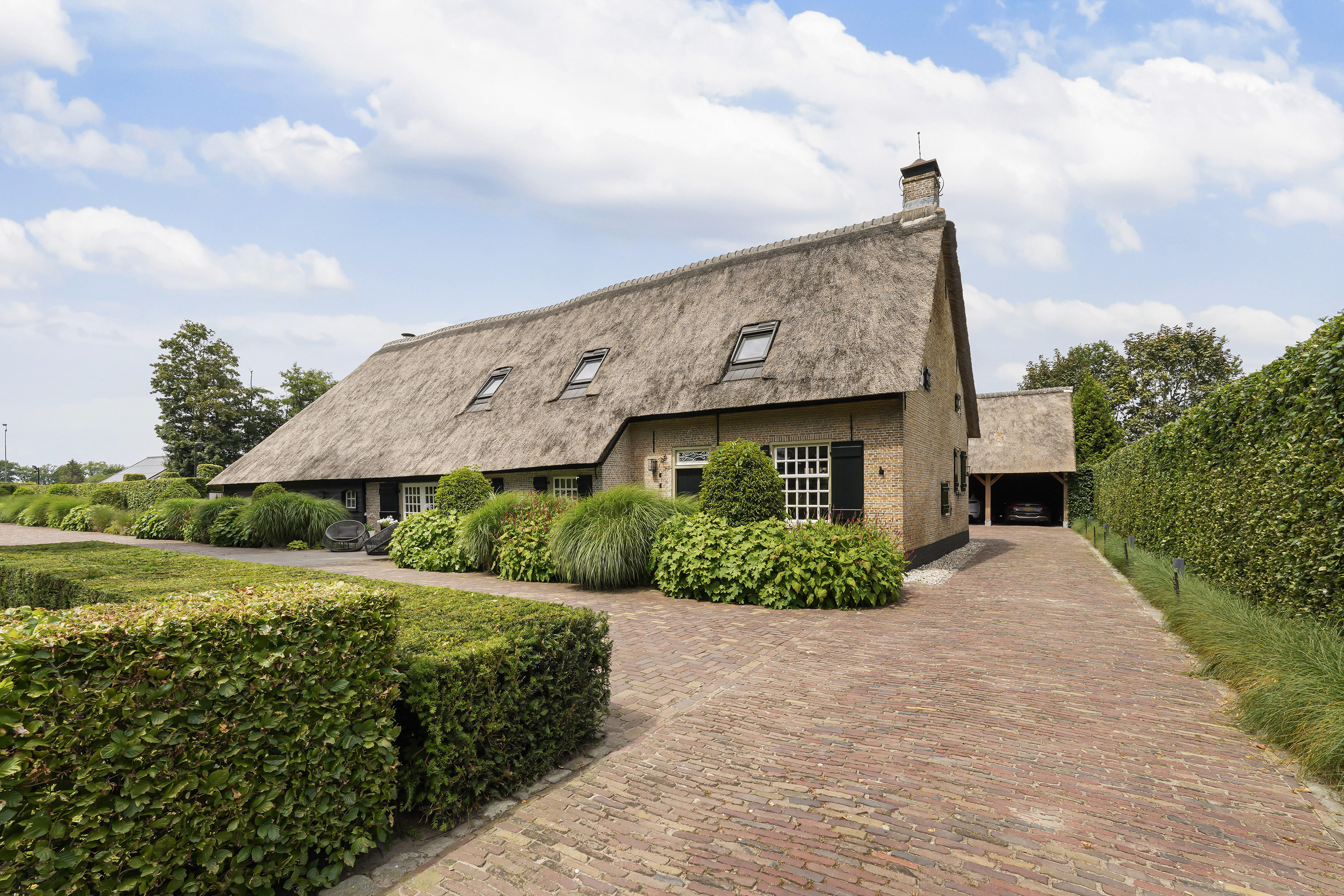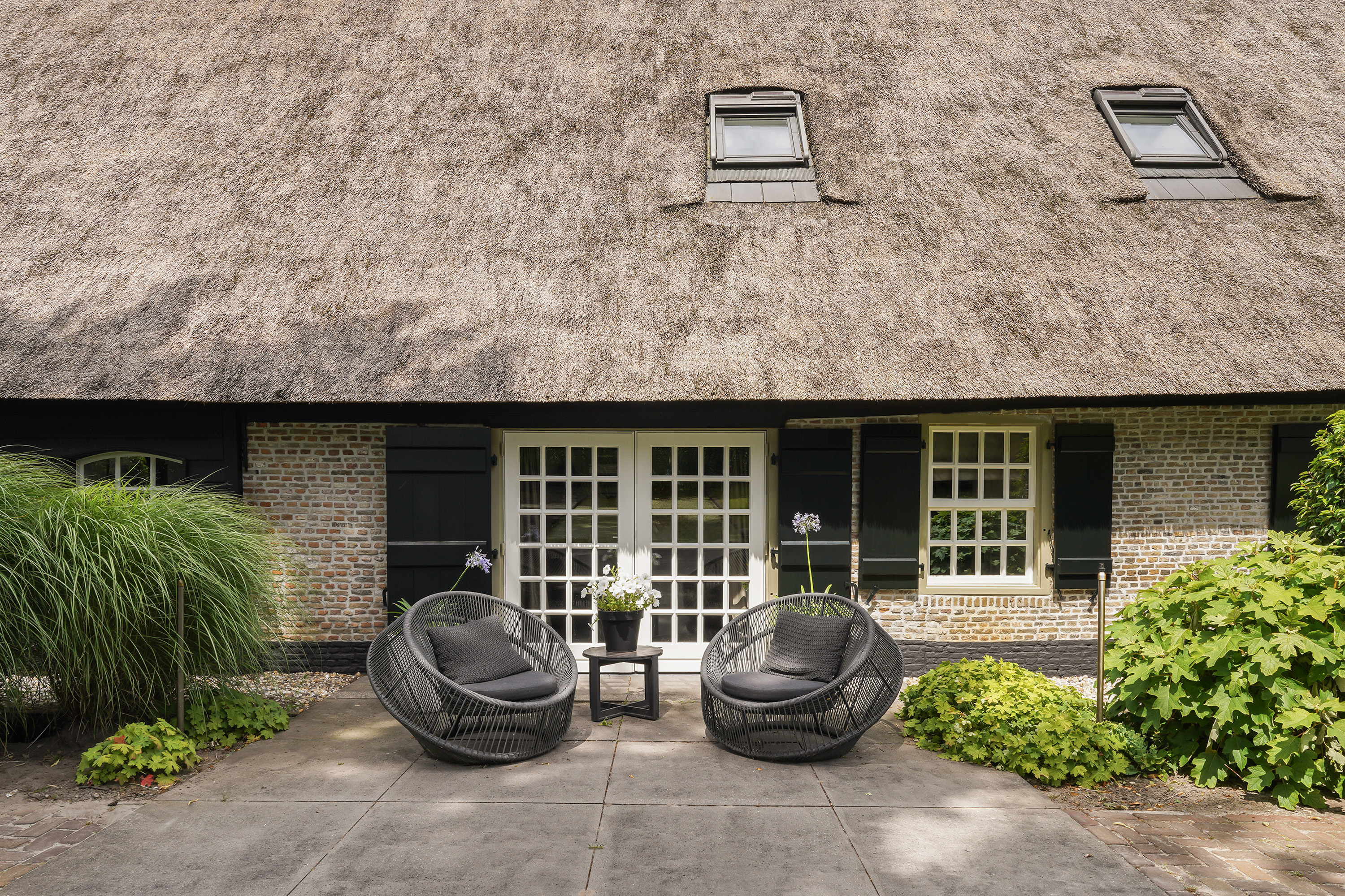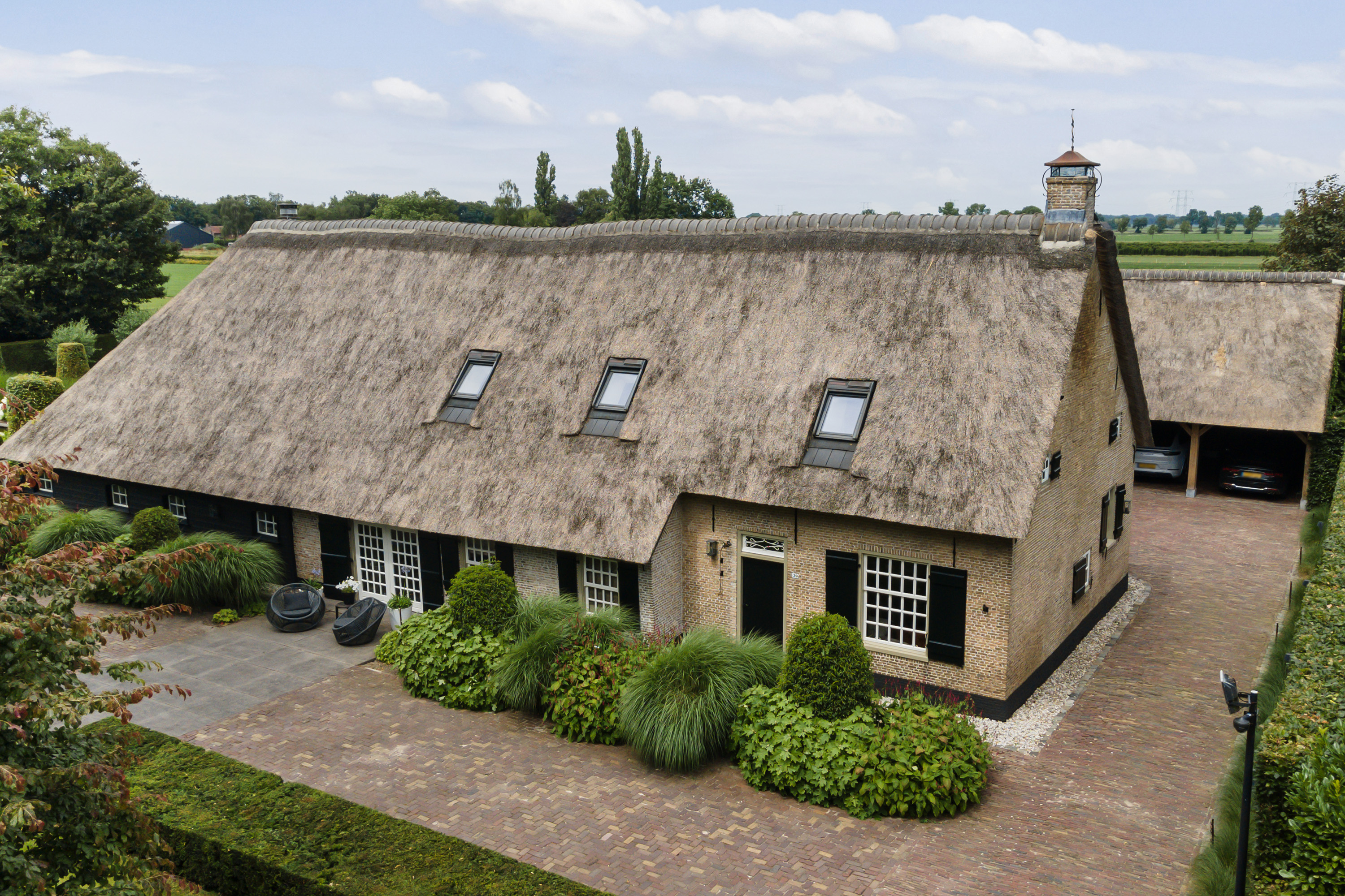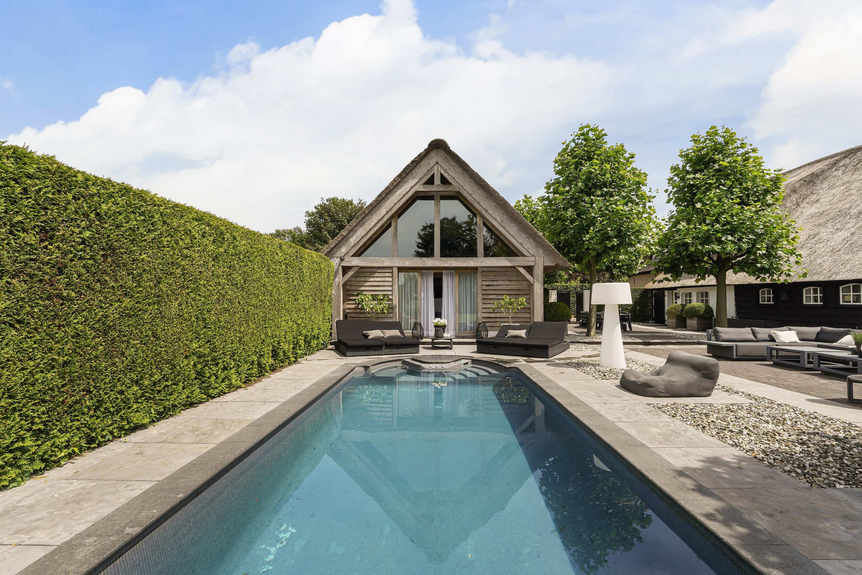 The “Handmade by Rasenberg” guesthouse is a true gem, with a spacious living area, a four-person sauna, a pantry kitchen, and an open fireplace. The guesthouse is beautifully insulated and features large sliding doors, allowing natural light to flood the space. A steel spiral staircase leads to the study and private bedroom on the upper floor. The high-quality thatched roof complements the farmhouse, creating a harmonious and luxurious atmosphere.