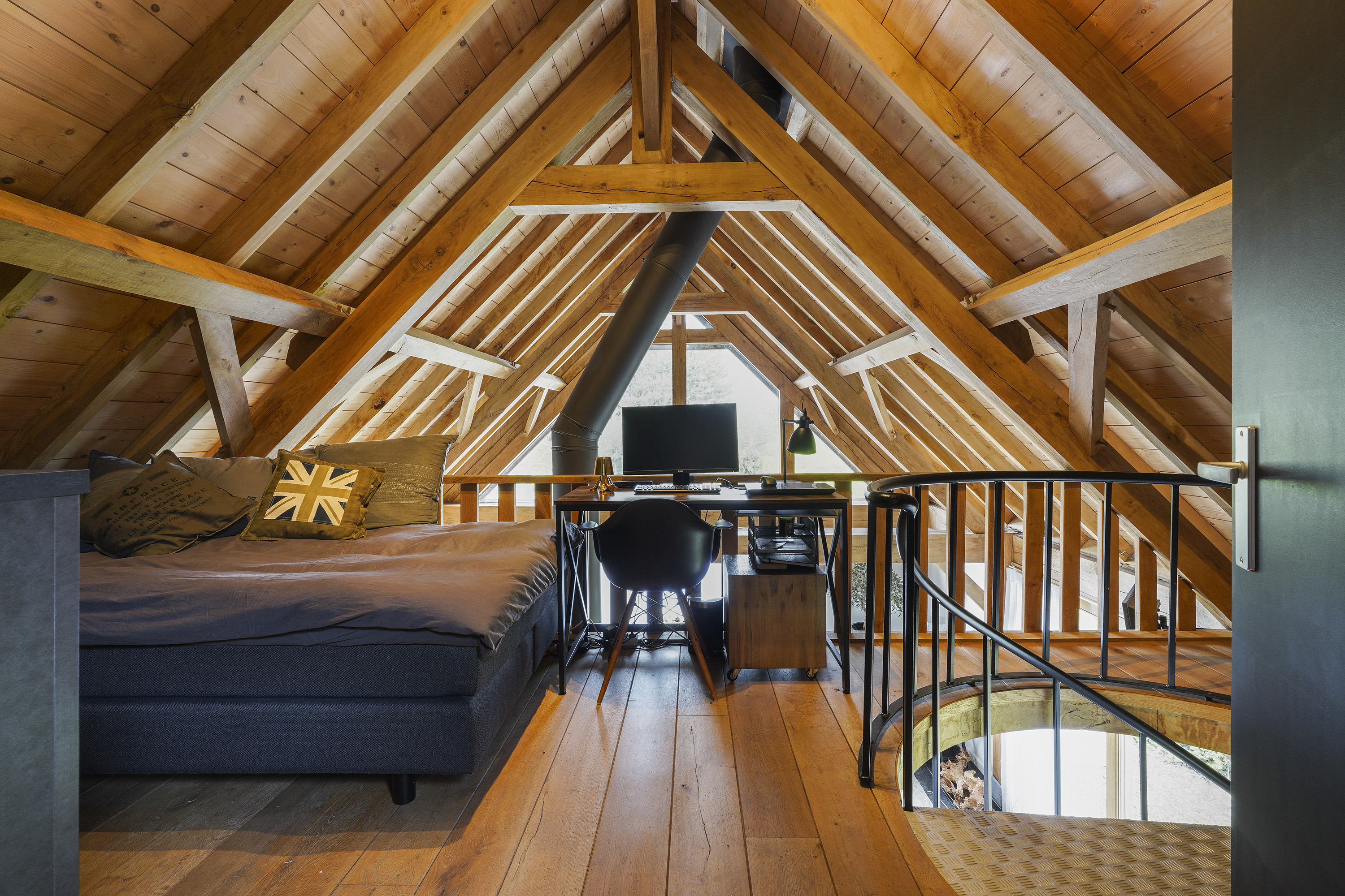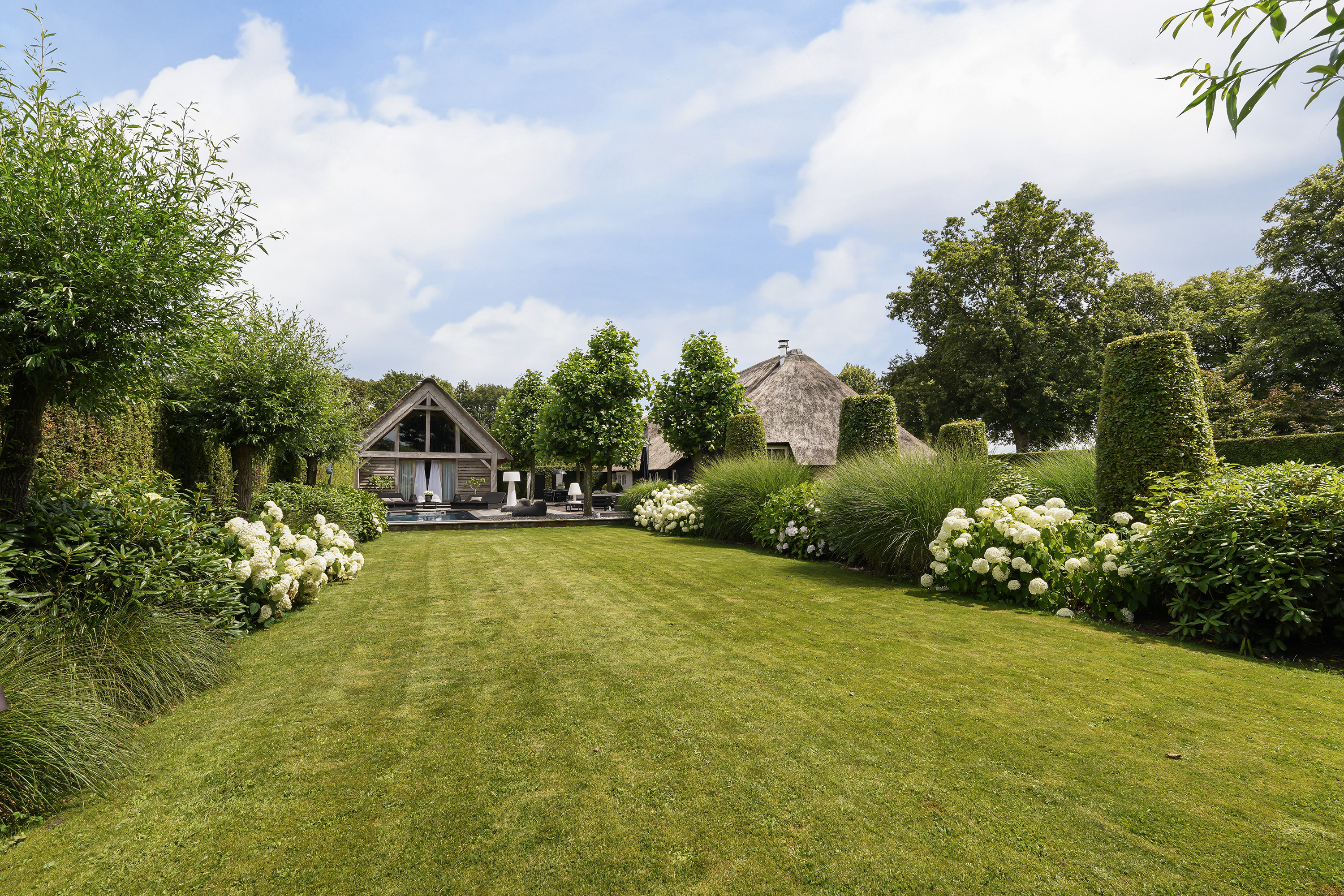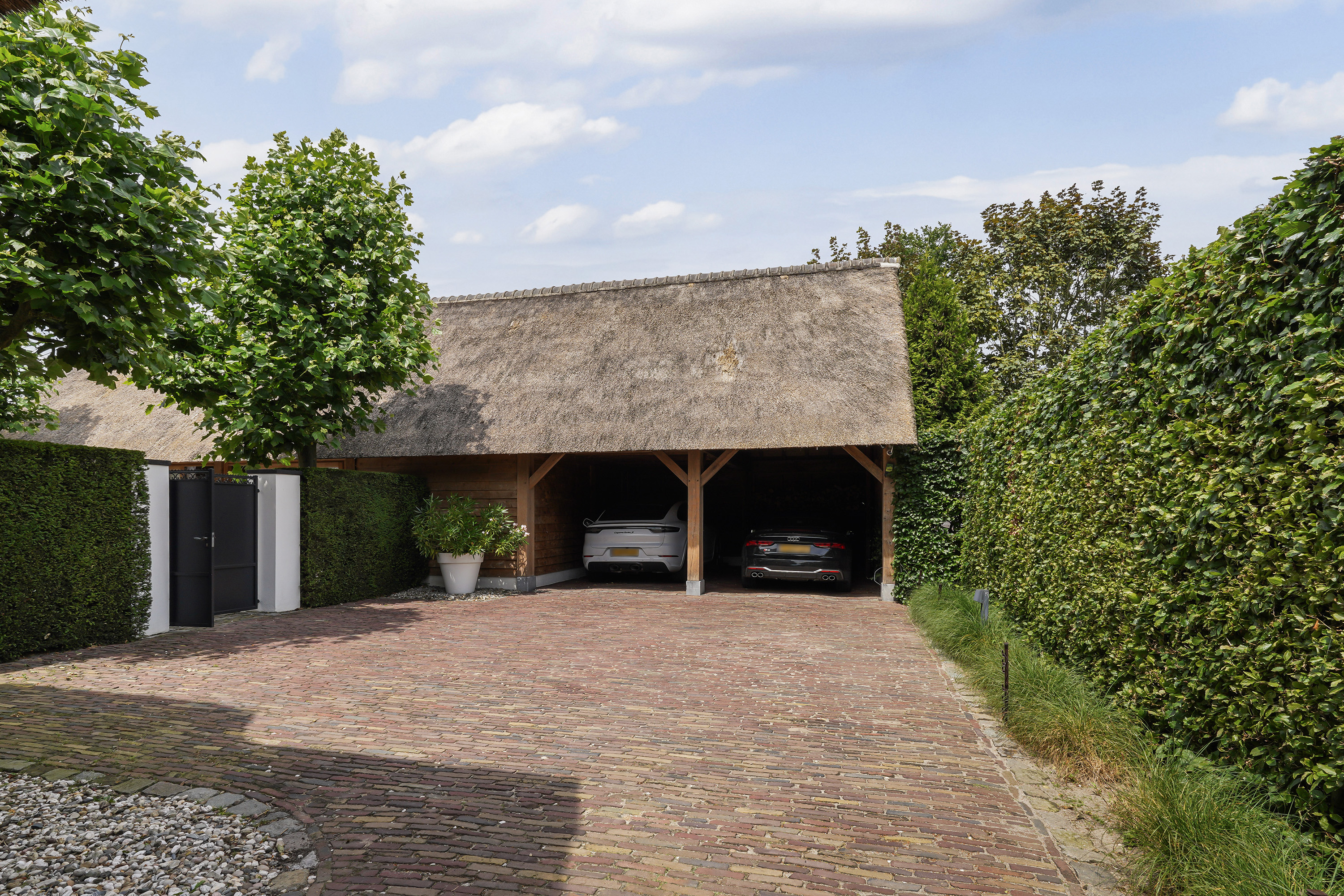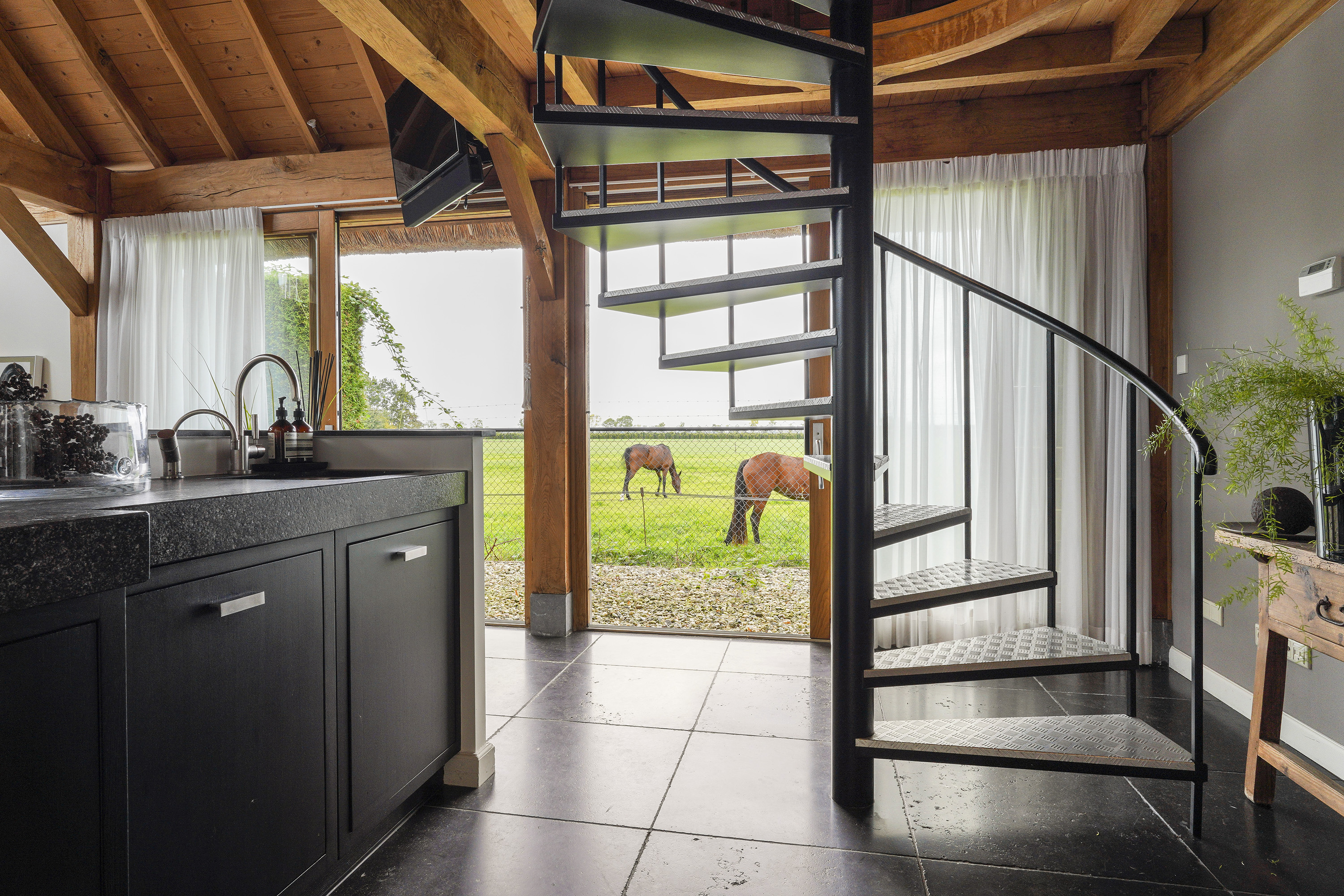 The “Handmade by Rasenberg” guesthouse is a true gem, with a spacious living area, a four-person sauna, a pantry kitchen, and an open fireplace. The guesthouse is beautifully insulated and features large sliding doors, allowing natural light to flood the space. A steel spiral staircase leads to the study and private bedroom on the upper floor. The high-quality thatched roof complements the farmhouse, creating a harmonious and luxurious atmosphere.