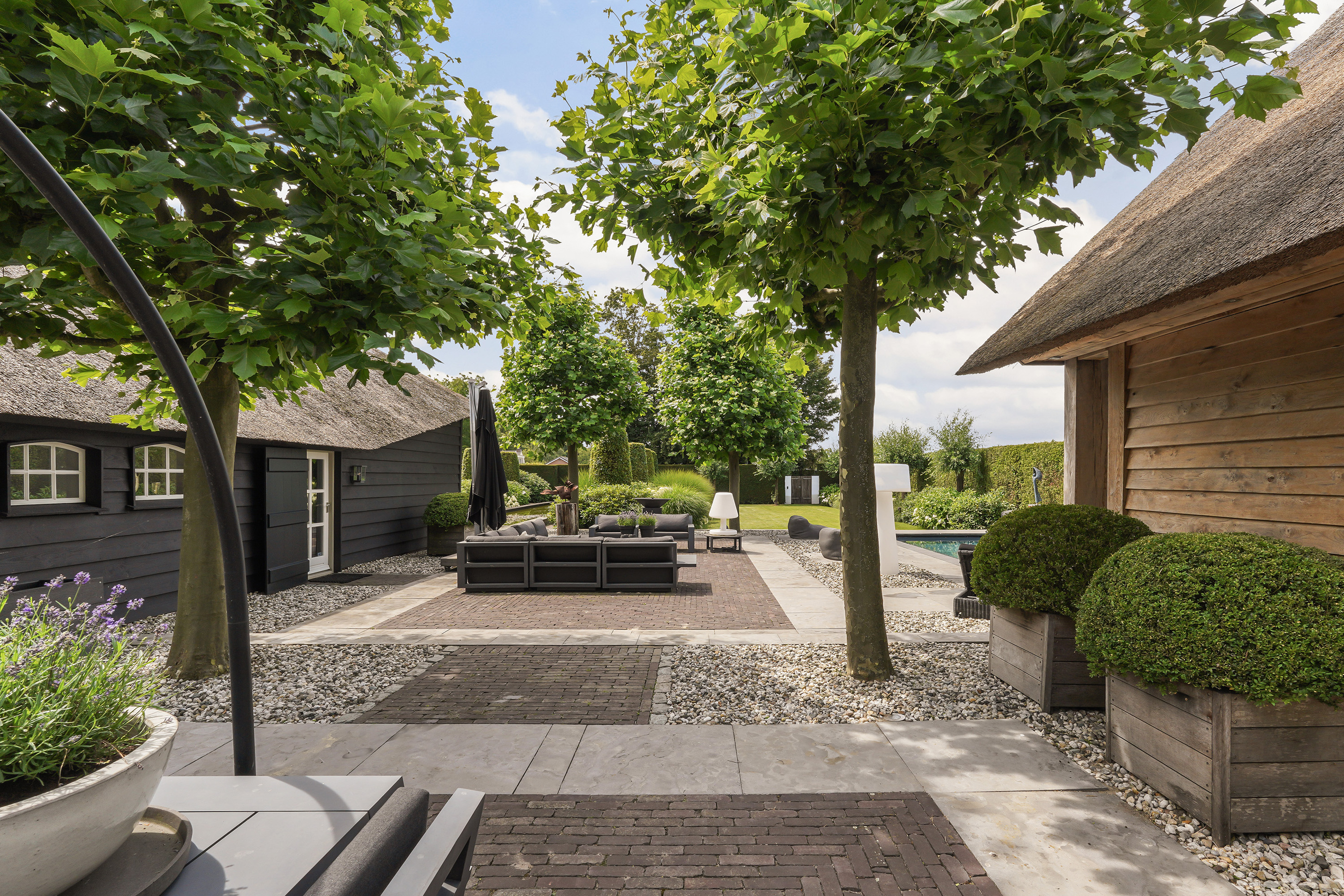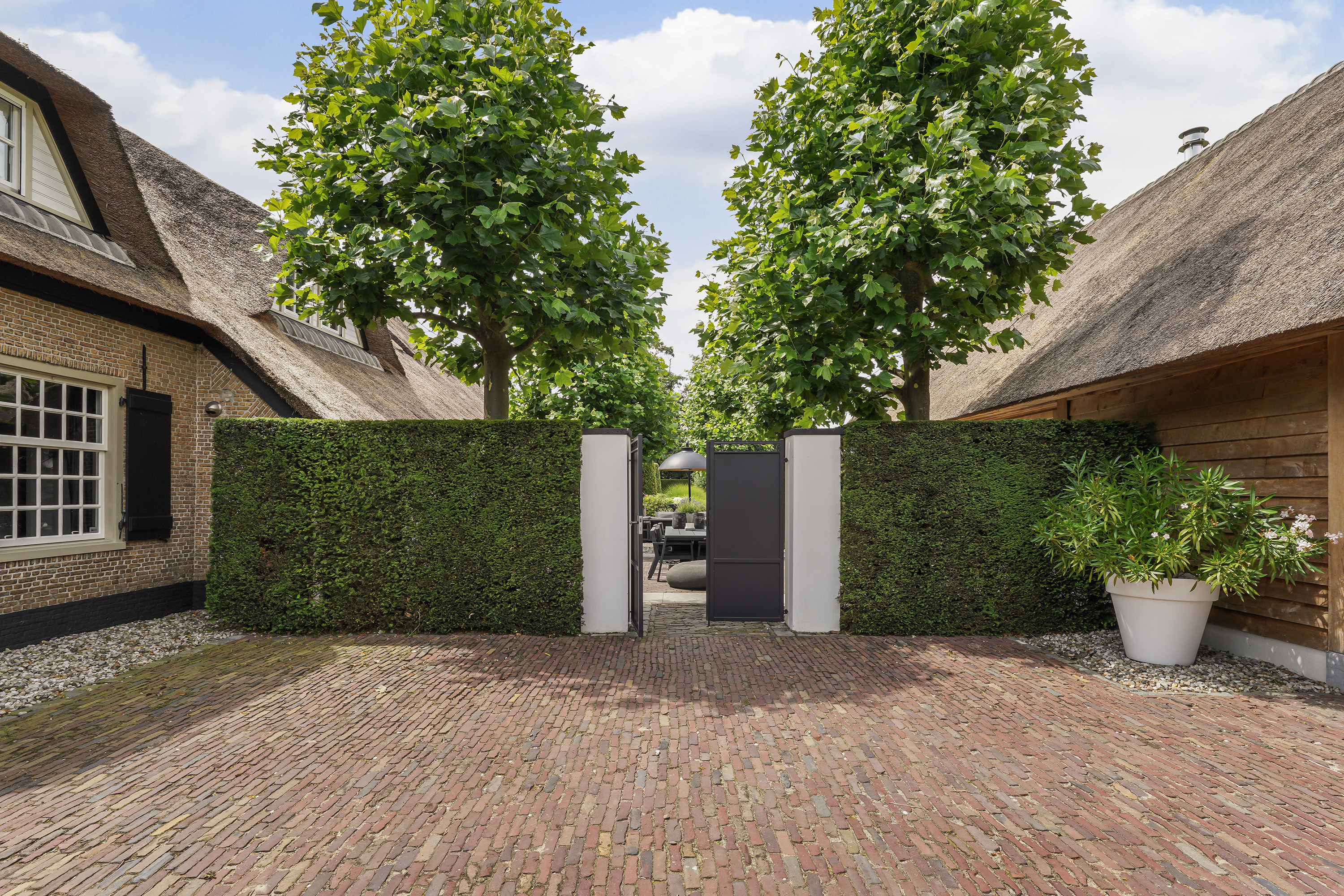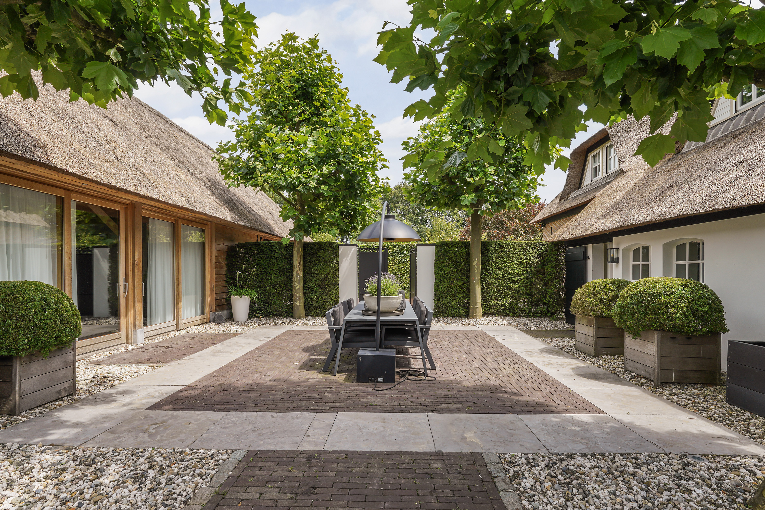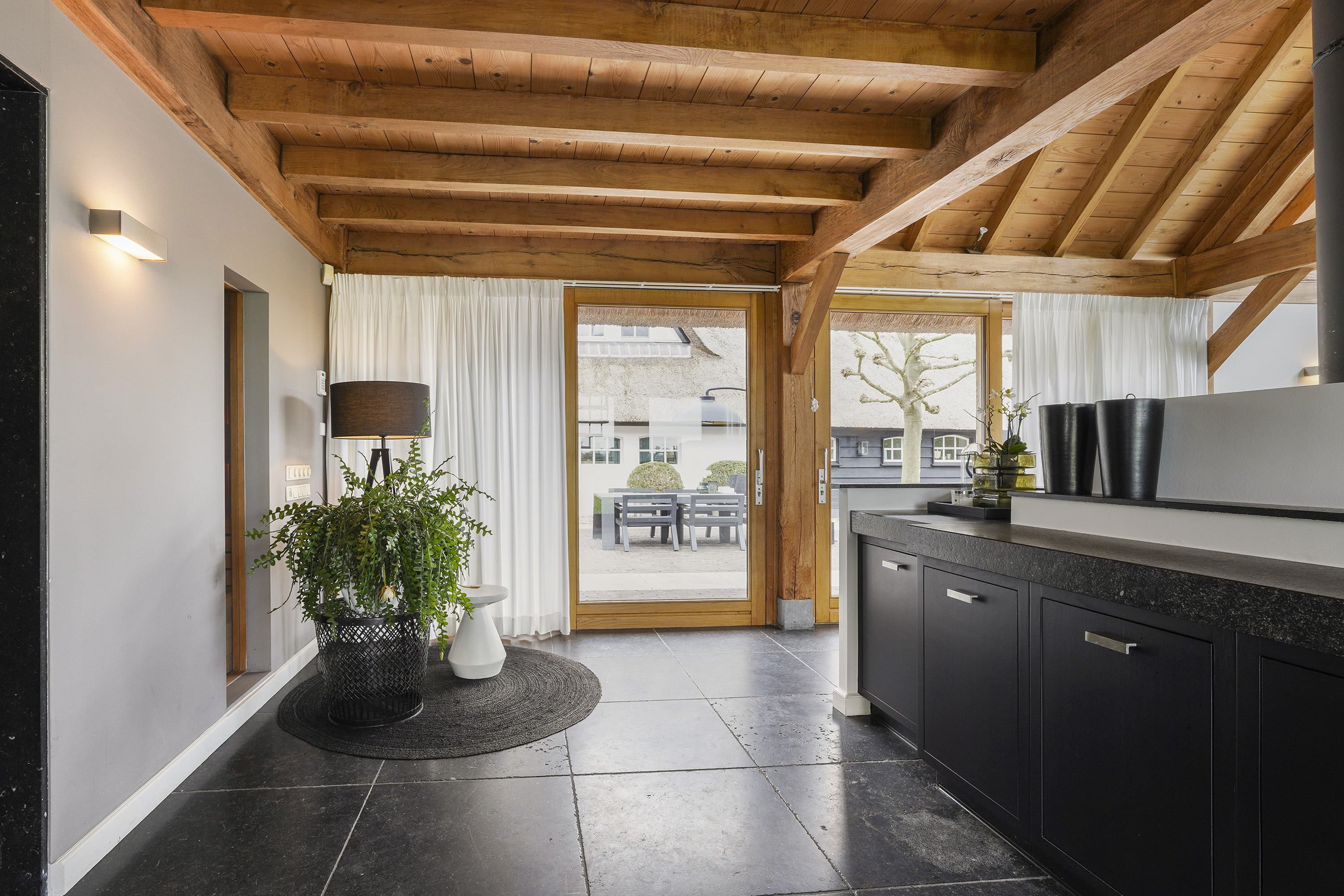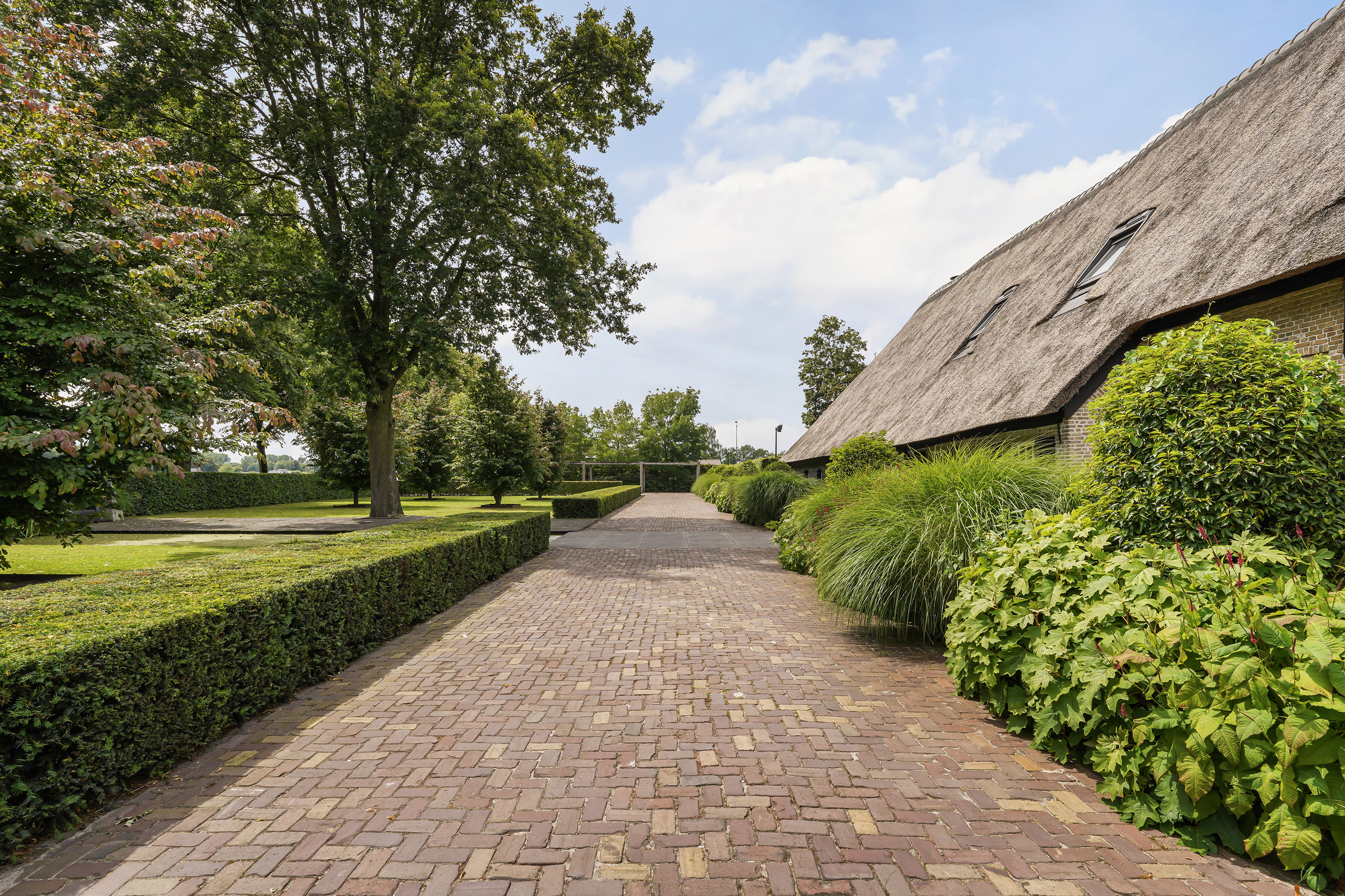 The “Handmade by Rasenberg” guesthouse is a true gem, with a spacious living area, a four-person sauna, a pantry kitchen, and an open fireplace. The guesthouse is beautifully insulated and features large sliding doors, allowing natural light to flood the space. A steel spiral staircase leads to the study and private bedroom on the upper floor. The high-quality thatched roof complements the farmhouse, creating a harmonious and luxurious atmosphere.