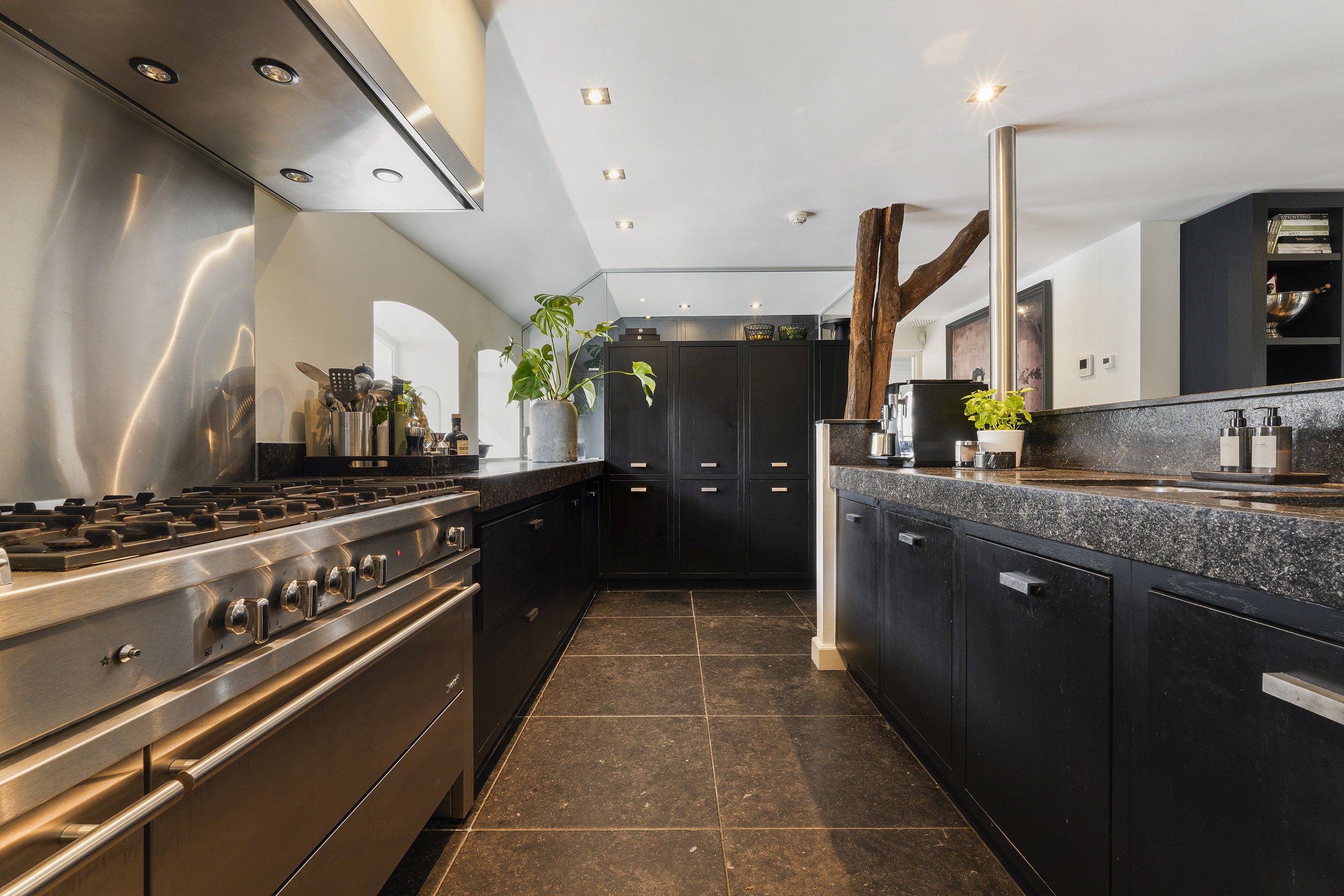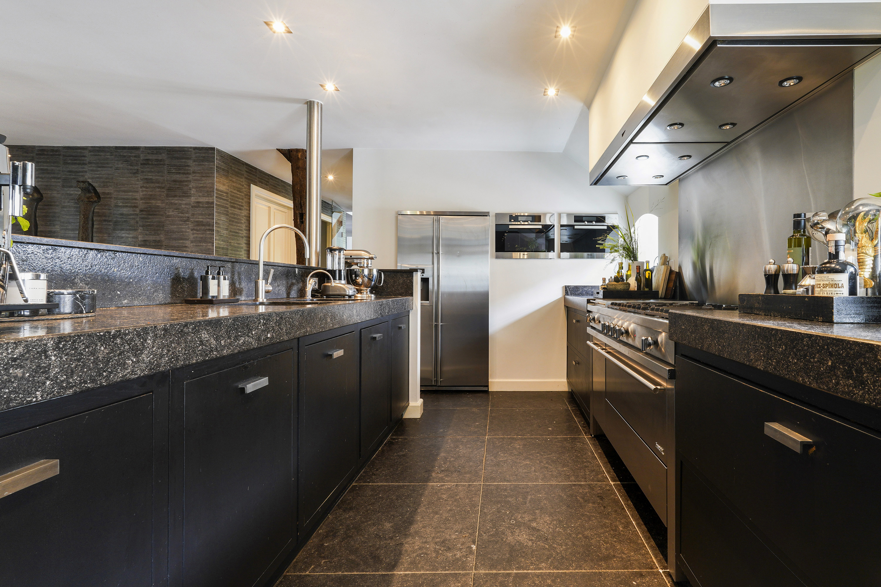 Living Kitchen: A spacious kitchen with a Belgian blue stone floor and a central island, equipped with modern appliances including a 5-burner gas stove, steam oven, and American fridge.