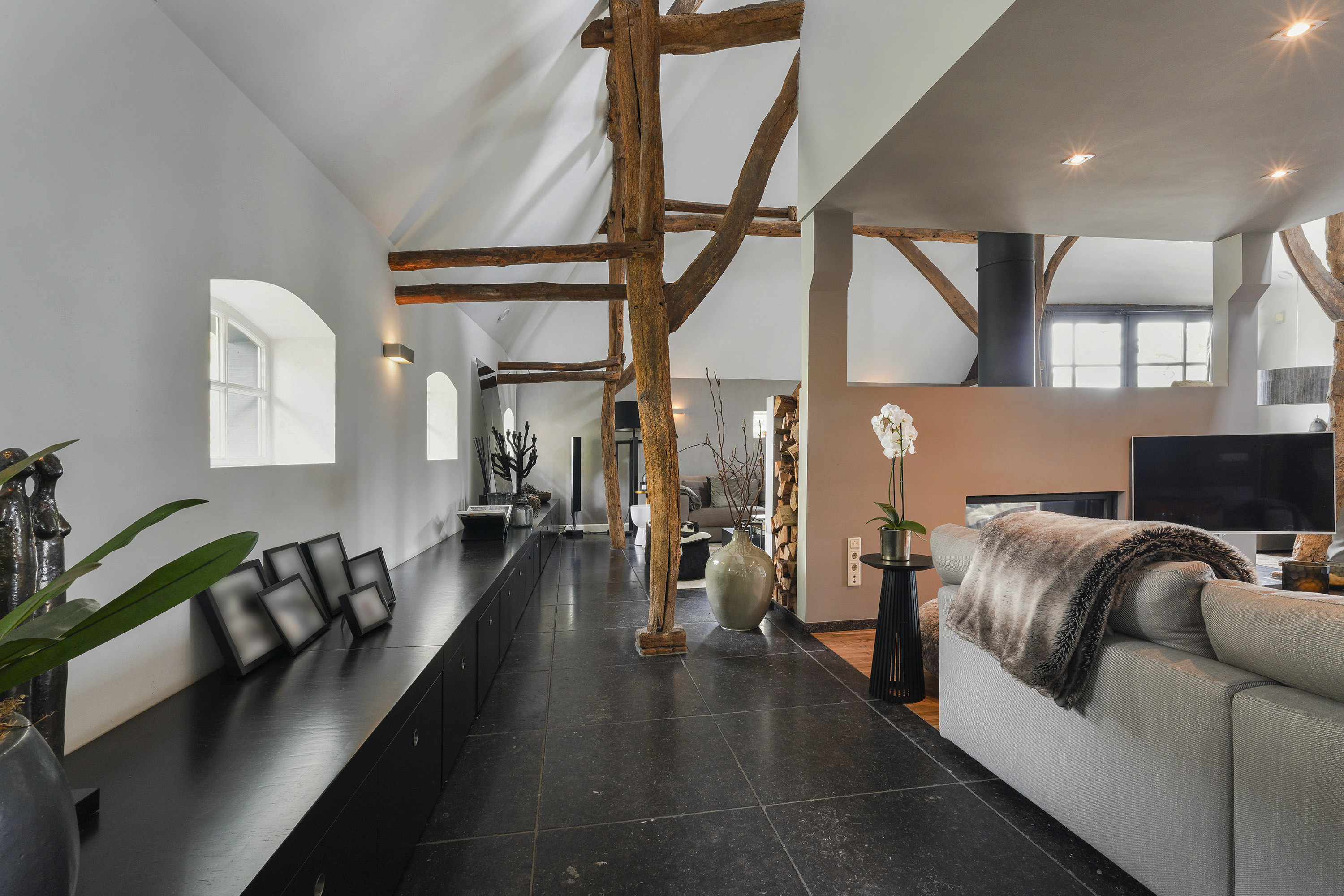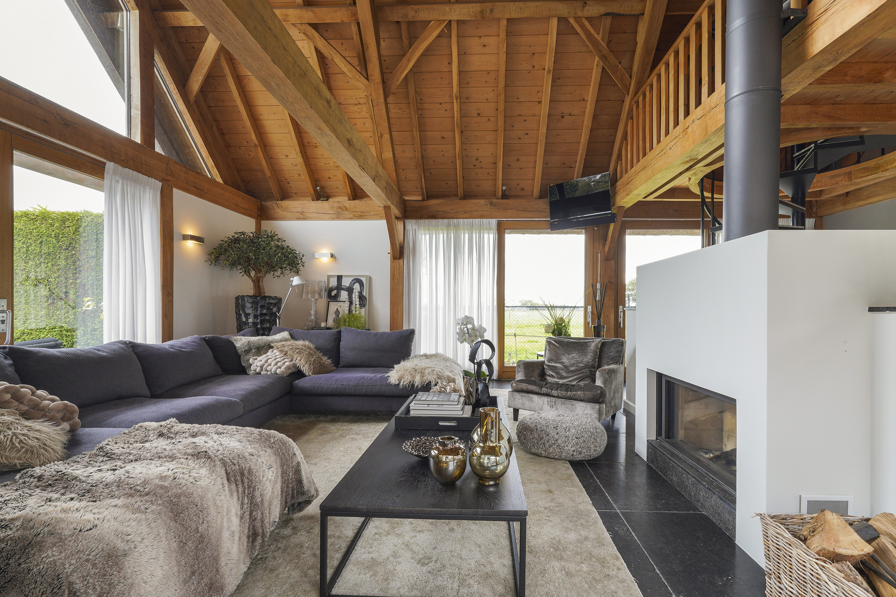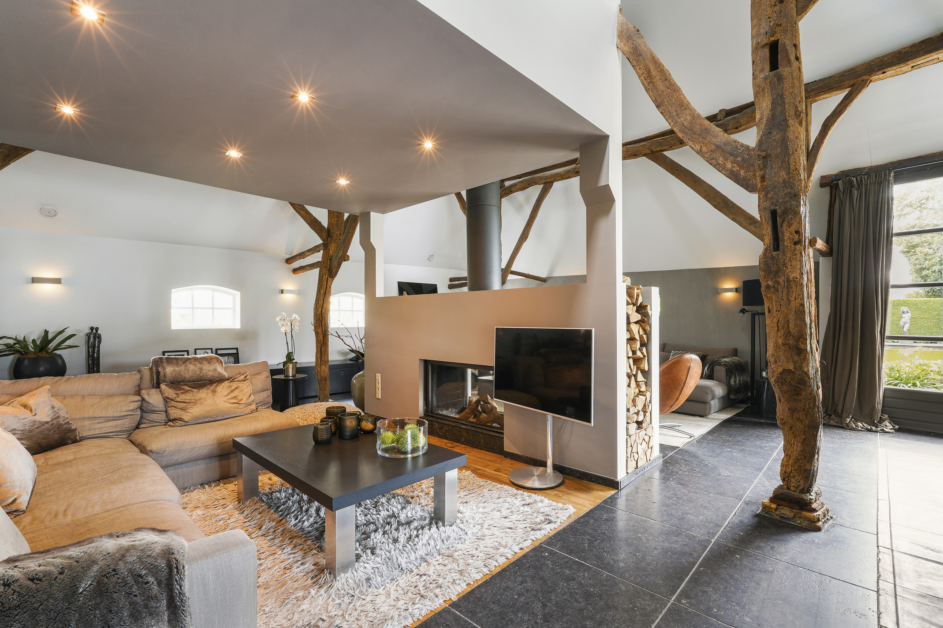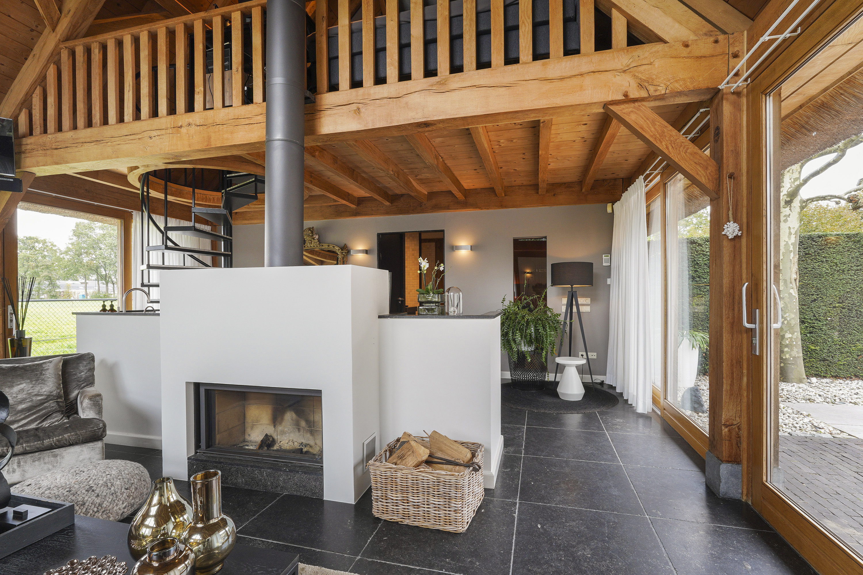 Living Room: A bright, open space with views of the garden, original beams, and a modern tunnel fireplace. The room connects to the mezzanine above, offering an airy feel and a sense of openness.