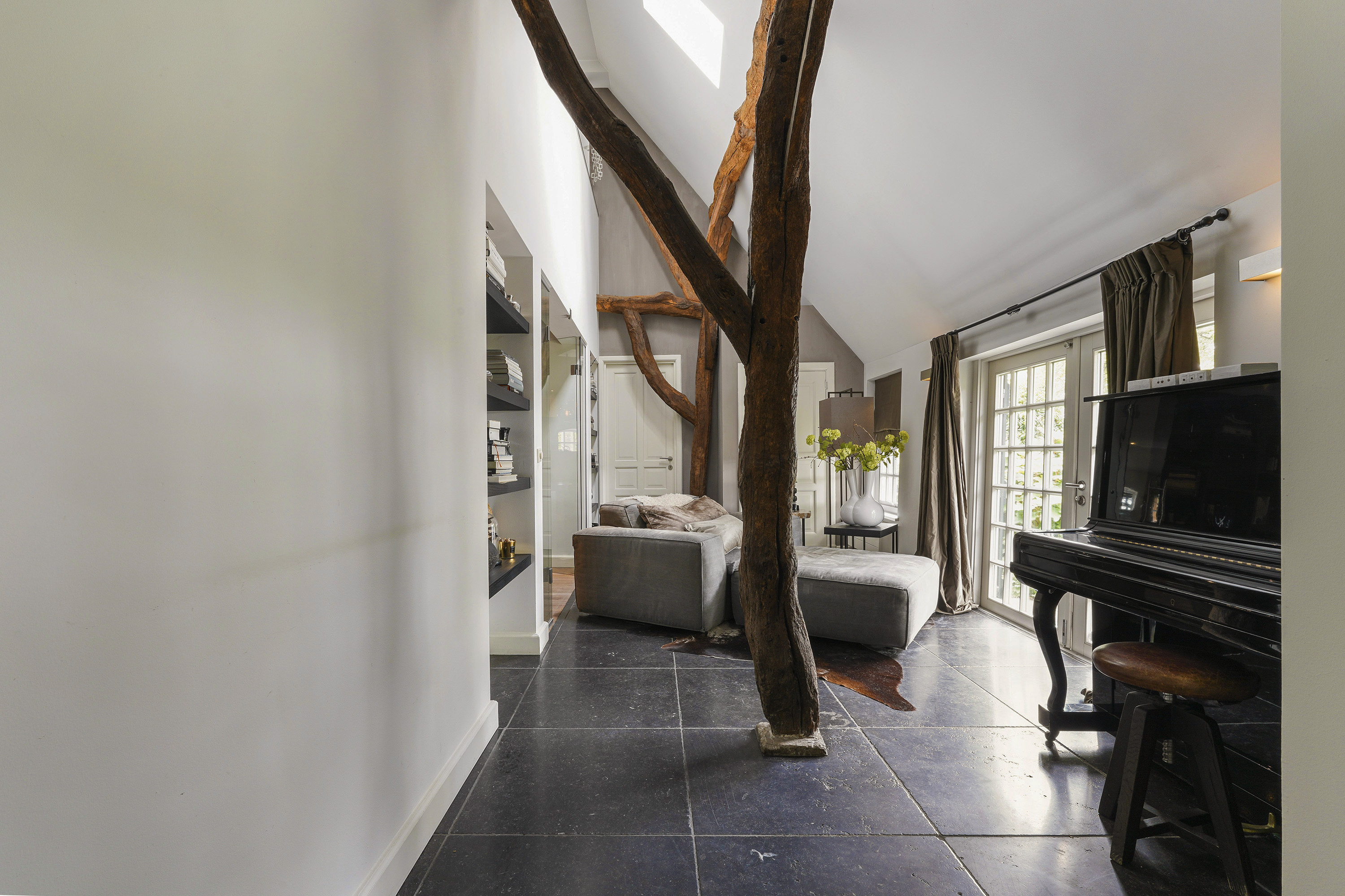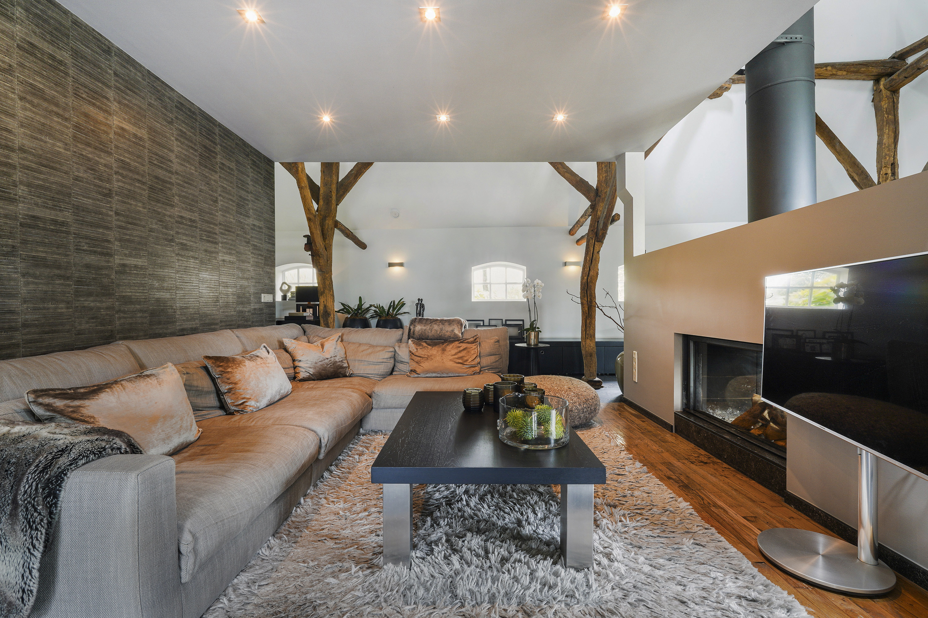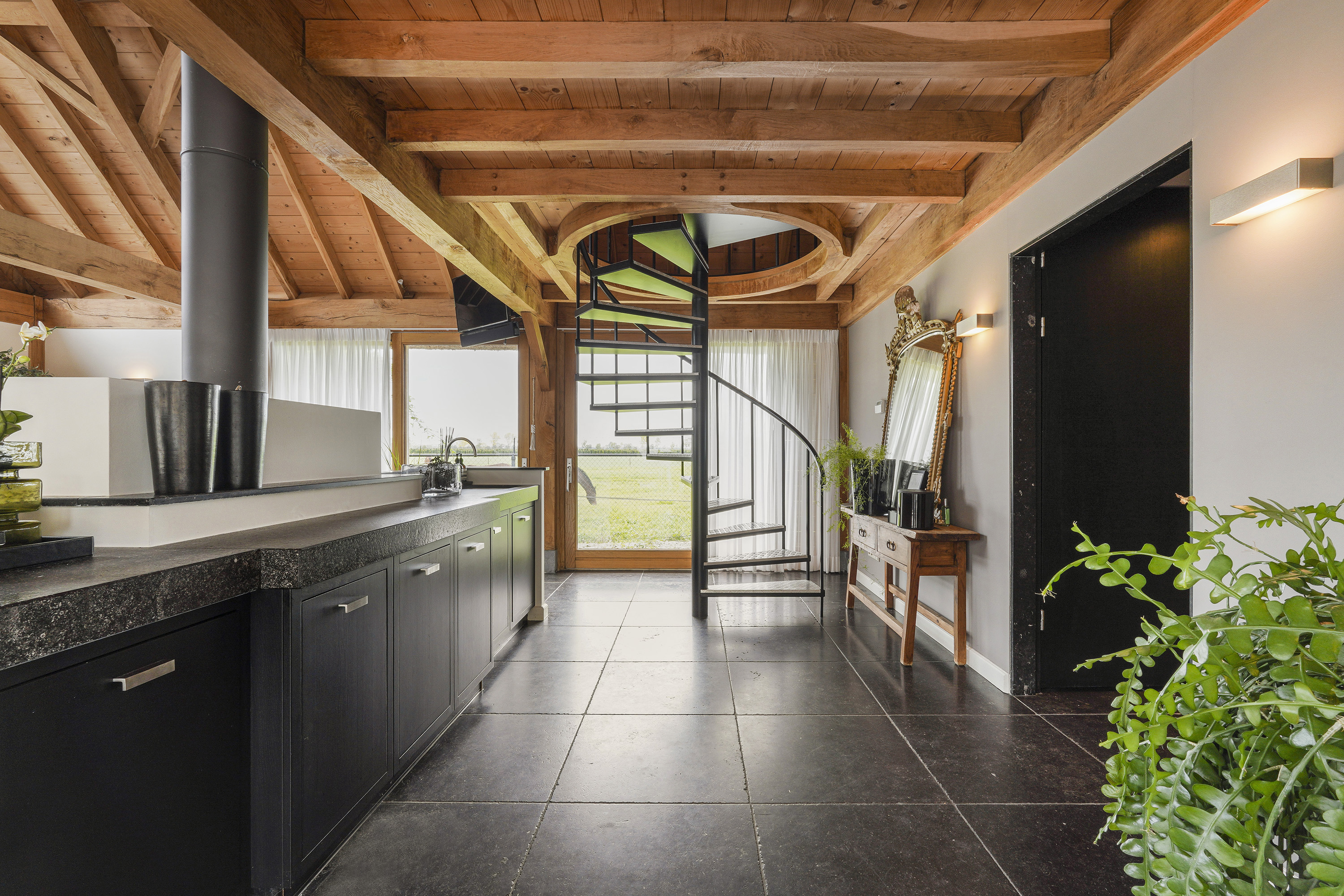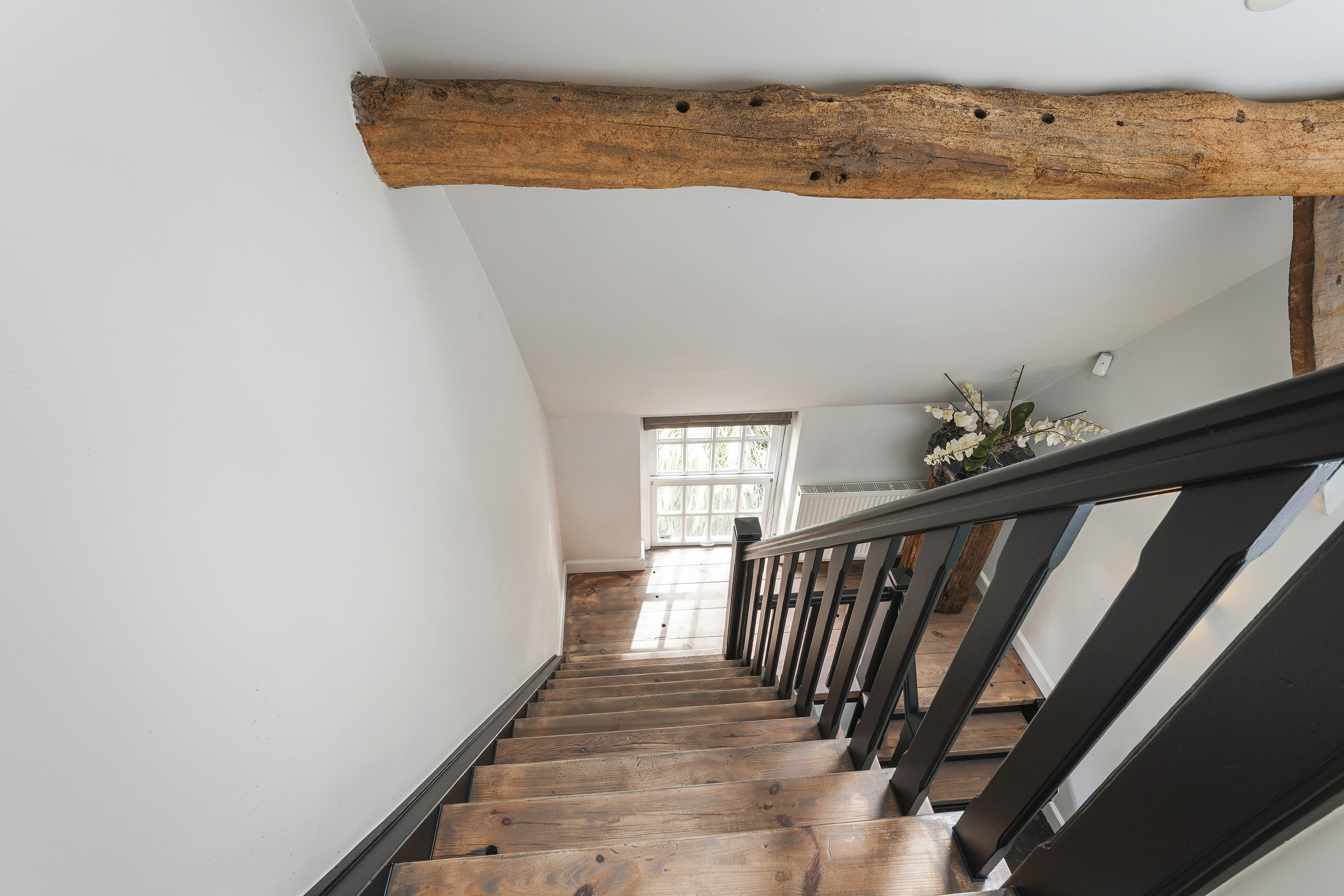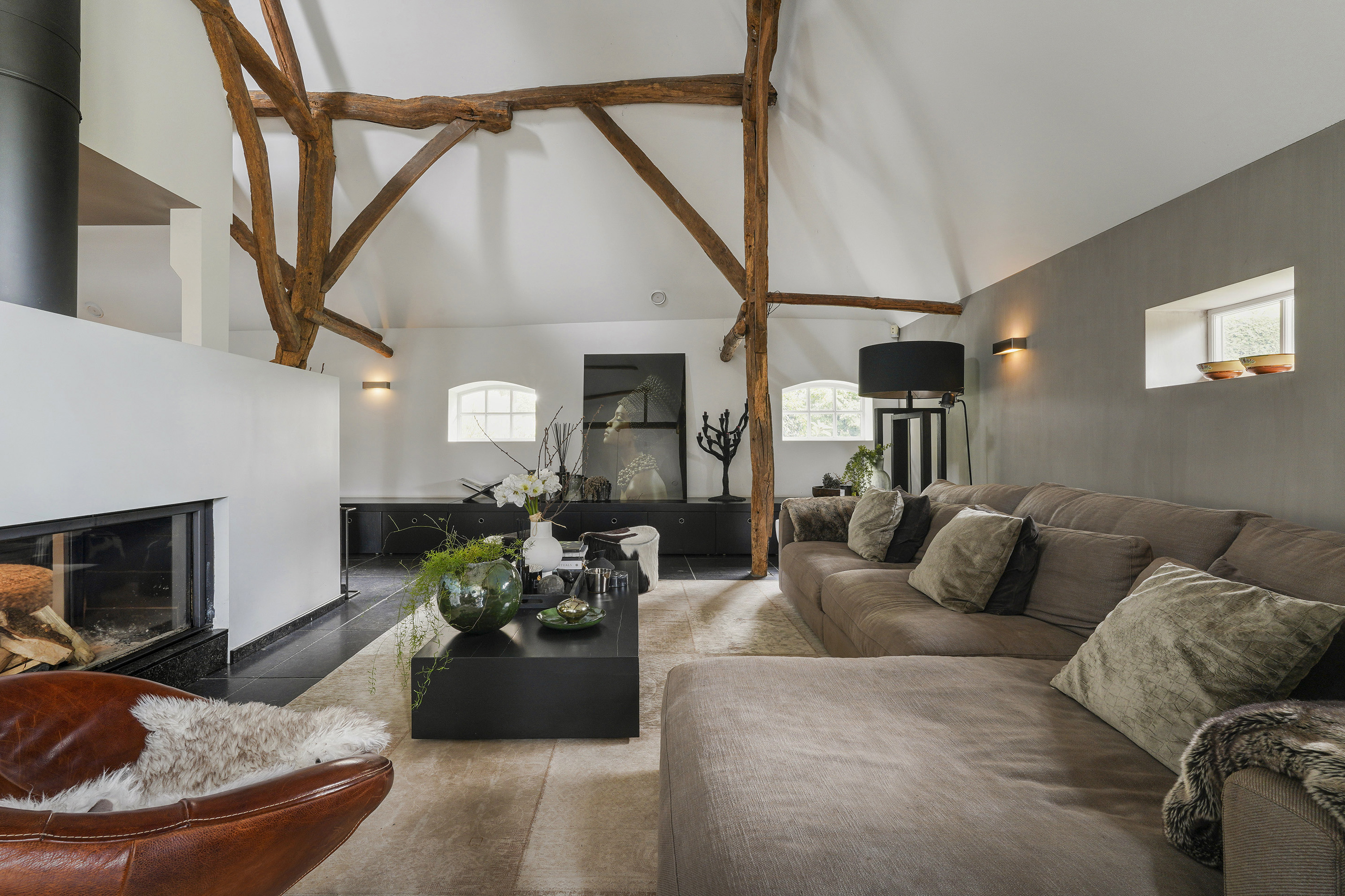 Living Room: A bright, open space with views of the garden, original beams, and a modern tunnel fireplace. The room connects to the mezzanine above, offering an airy feel and a sense of openness.