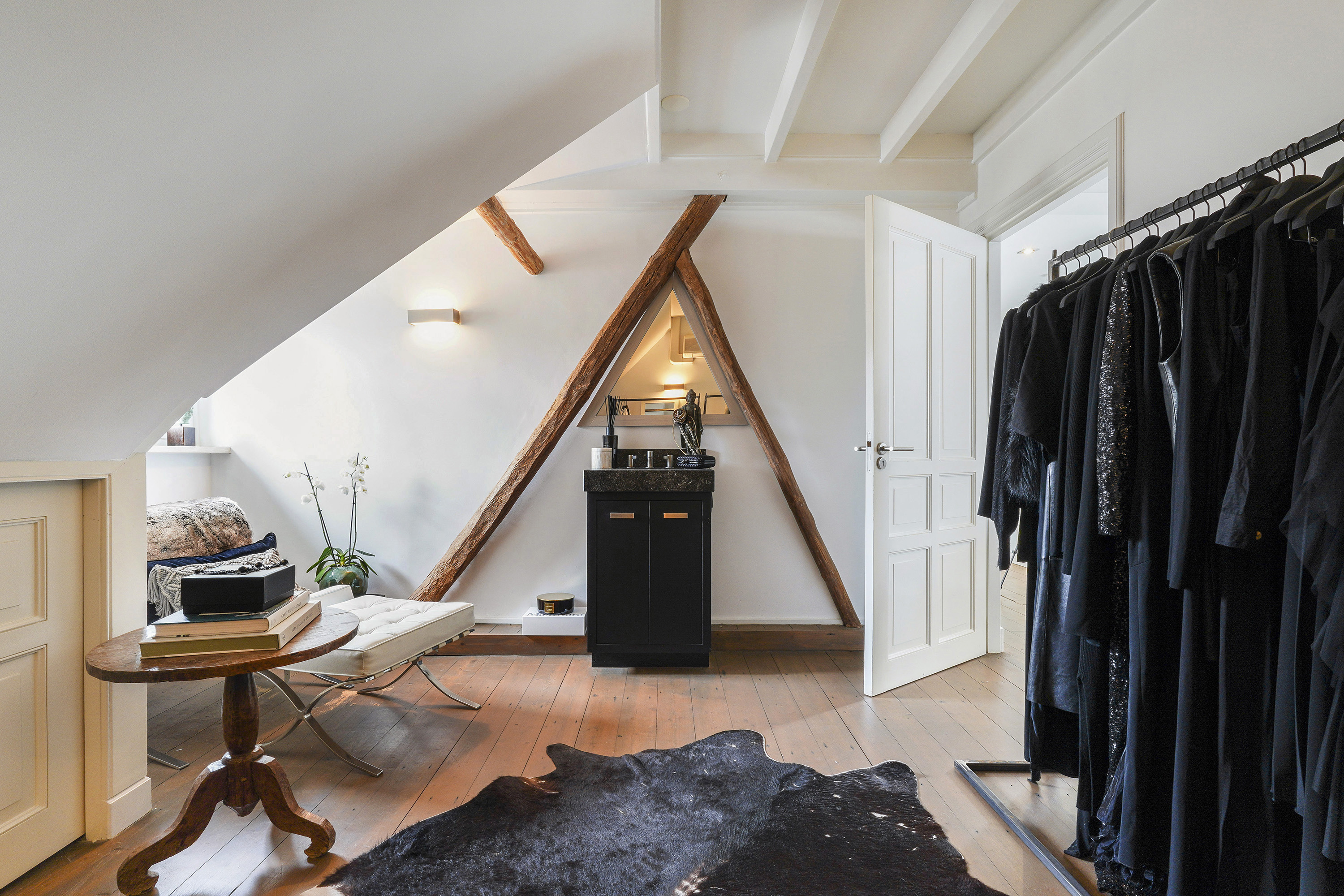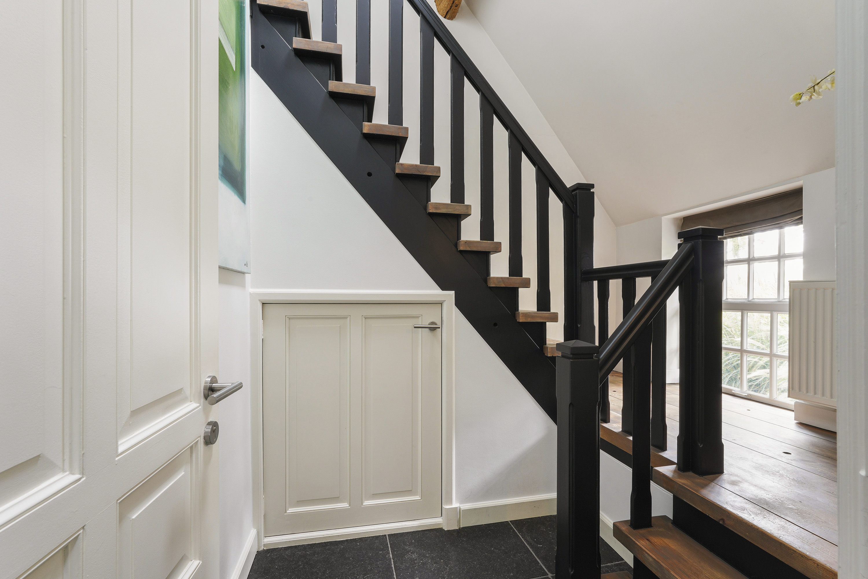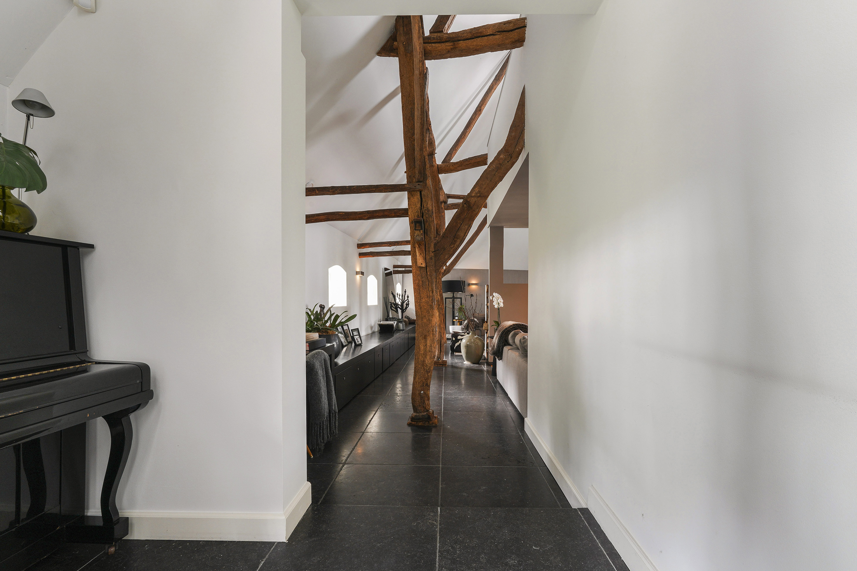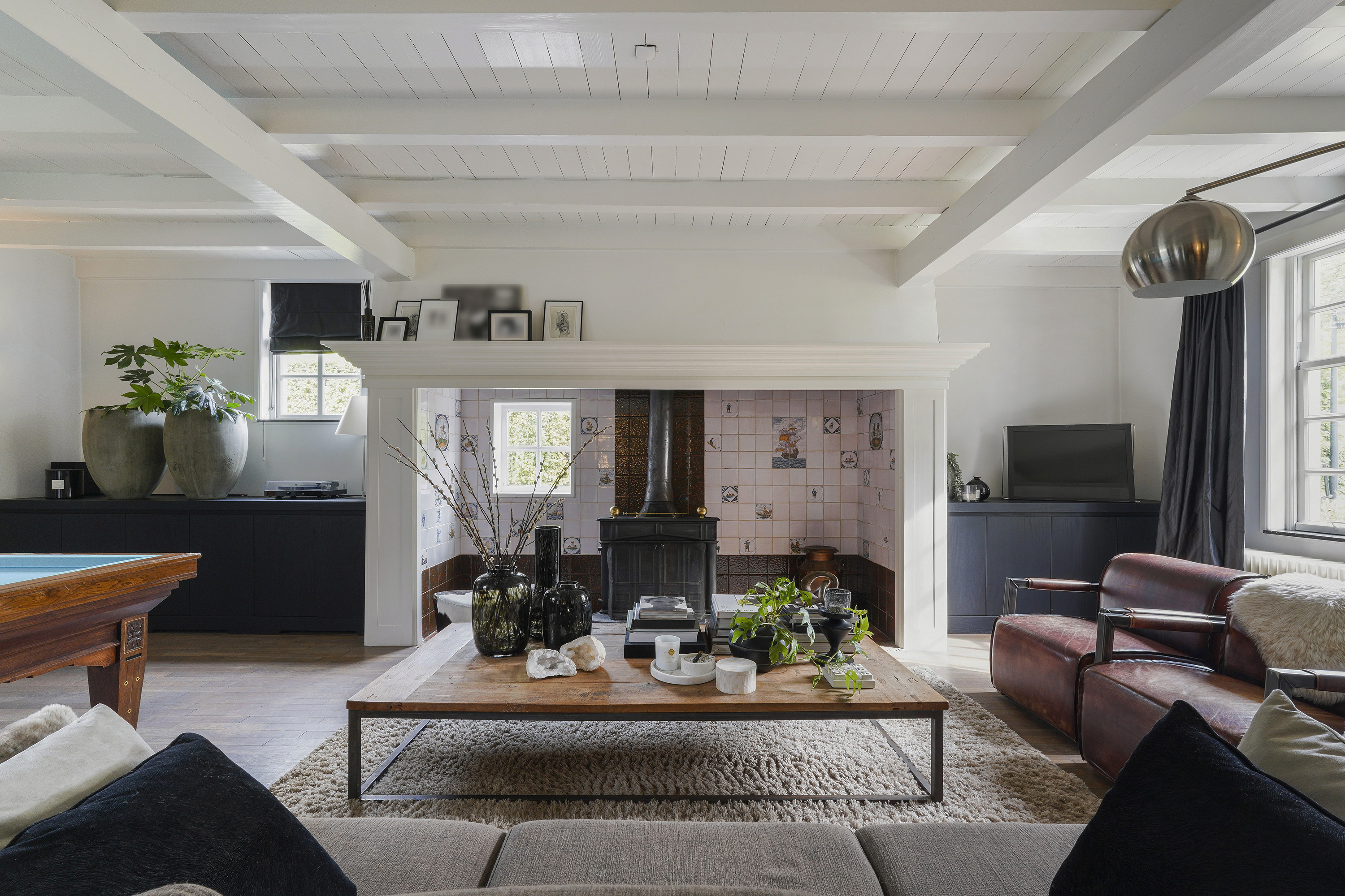 Living Room: A bright, open space with views of the garden, original beams, and a modern tunnel fireplace. The room connects to the mezzanine above, offering an airy feel and a sense of openness.