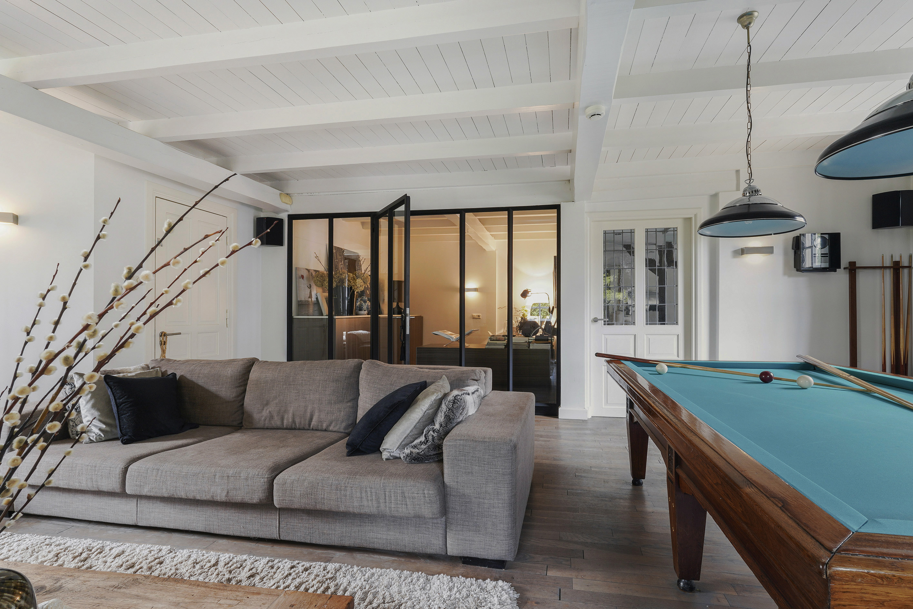Billiard Room: An elegant, original space with a fireplace and a restored oak floor, perfect for relaxation or entertaining.