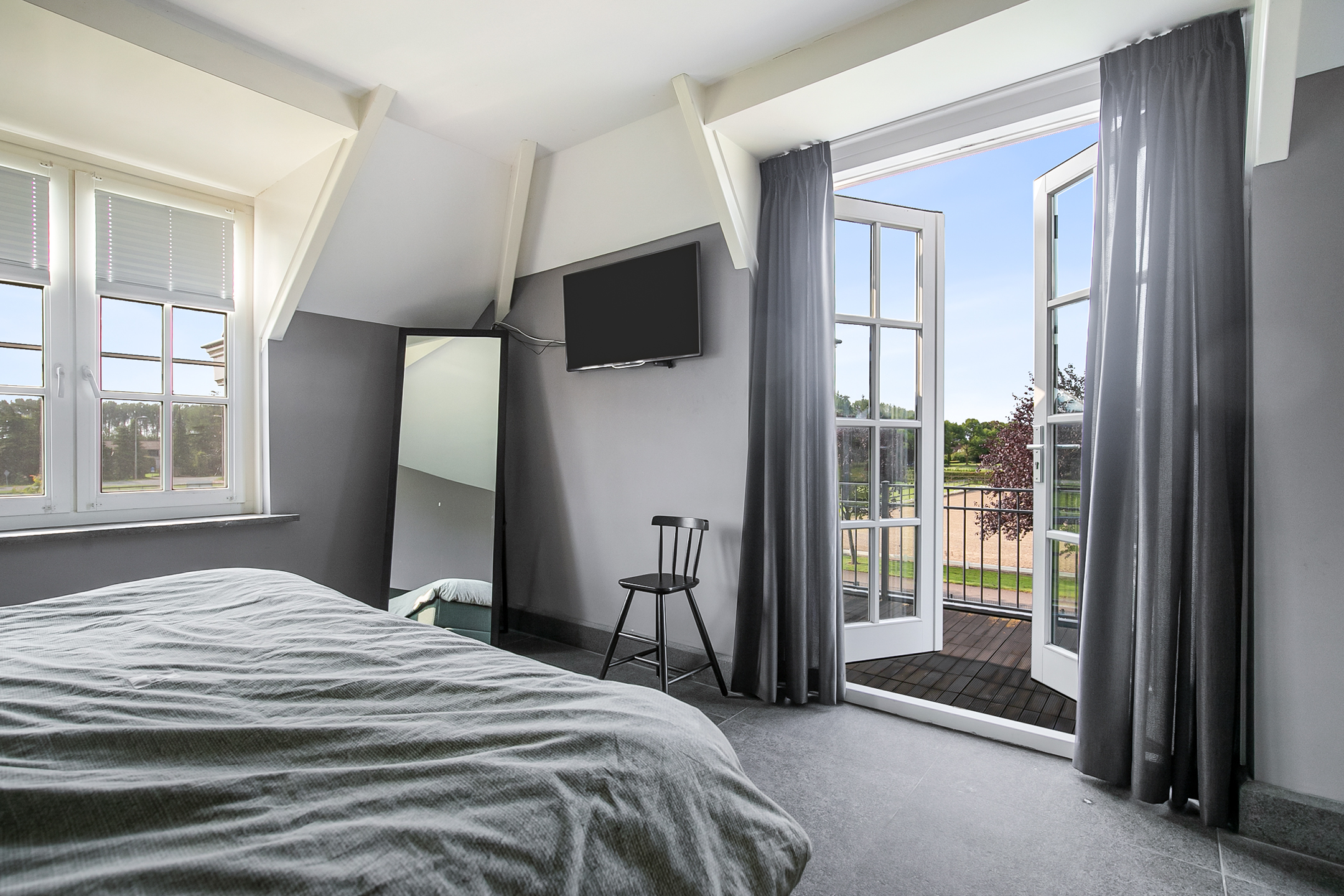 The spacious landing with loft provides access to 3 spacious bedrooms, the bathroom, toilet room and the attic. There is also access to a charming French balcony which offers nice views of the surrounding area. The landing and all bedrooms have the same finish, natural stone floor, stucco walls and a stucco ceiling.