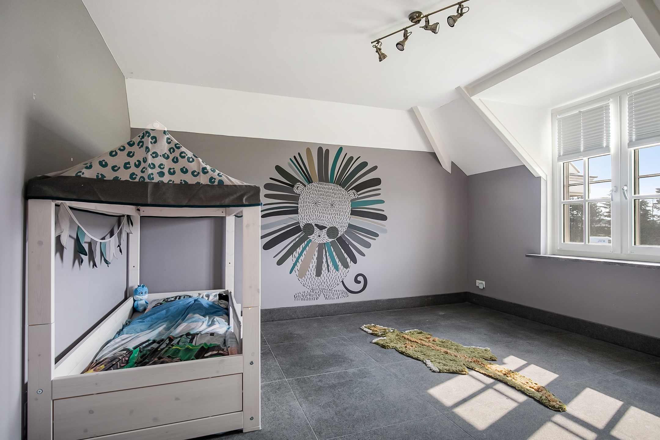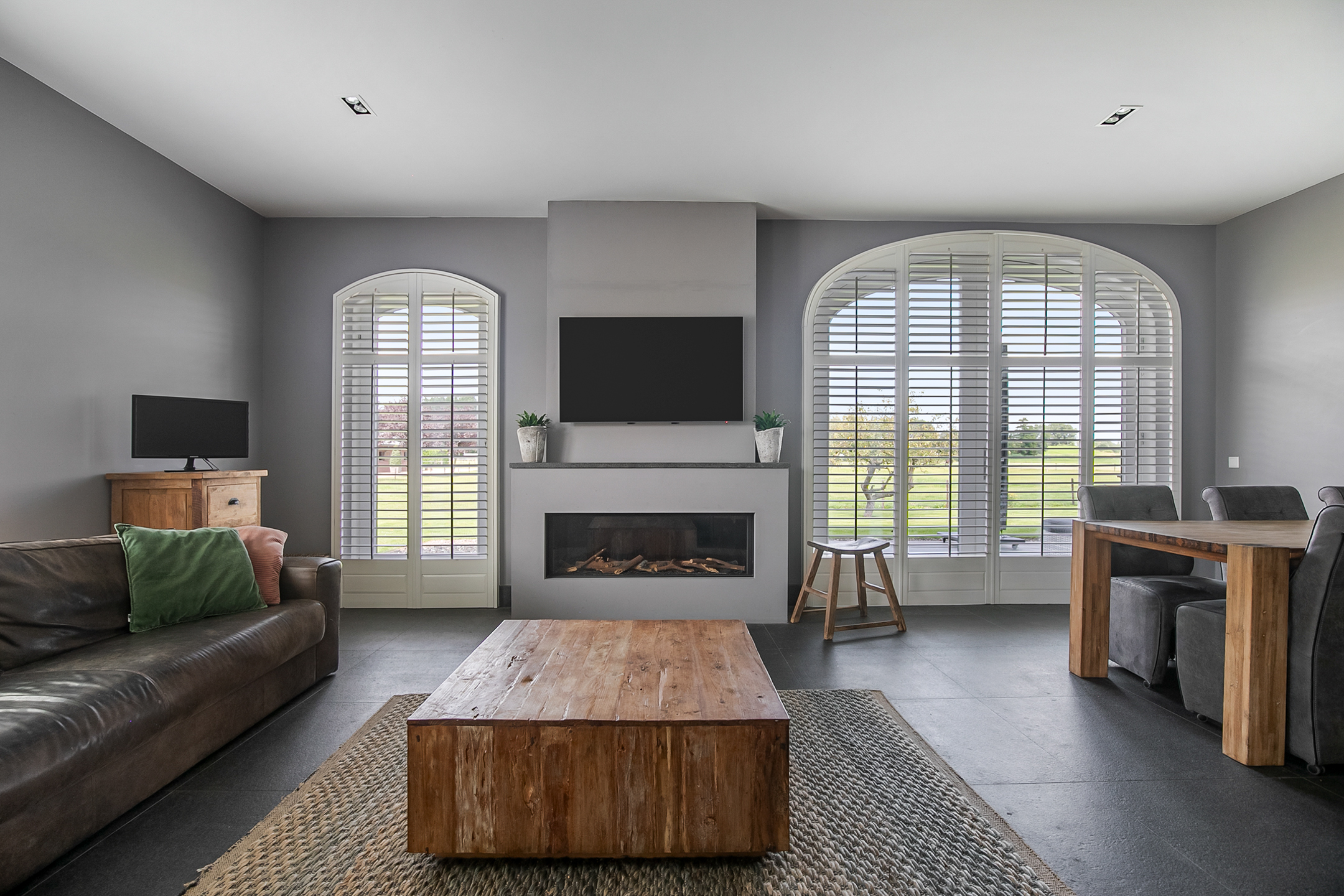 The covered entrance with a double sliding front door, gives this villa an attractive appearance. The spacious reception hall with imposing wooden staircase provides access to the living room and the 1st floor. The hall has a natural stone tiled floor, stucco walls and a stucco ceiling. The spacious living kitchen with dining area has a natural stone tiled floor, stucco walls and a stucco ceiling with recessed lighting. The kitchen features a wall-mounted unit with appliance wall and a cooking and rinsing island. The appliance wall is further equipped with an oven, coffee maker, steam oven and fridge. The island features a 5-burner gas hob with built-in extractor fan in the ceiling, a sink and a dishwasher. Various cupboards and drawers provide plenty of storage space. A large bay window/extension with French doors provide access to the garden. The many windows provide plenty of natural light. A fireplace adds atmosphere and warmth to the room. From the living room there is a nice view of the horse pastures. And here, too, large windows and double doors provide a sea of light. In addition, there is a beautiful, large fireplace with a gas fire that provides even more atmosphere and warmth in the room. Sliding doors close off the living room from the kitchen/dining area. Semi-circular French doors in the side wall of the house provide access to the front house. The spacious entrance hall provides access to the utility/laundry room, living room, toilet room and the meter cupboard. The utility/laundry room is equipped with a sink. Also located here are the connections for the washing equipment. From here, there is access to the office/workroom. The office space is a fine room which is obviously suitable for various purposes, such as a playroom or chill room.