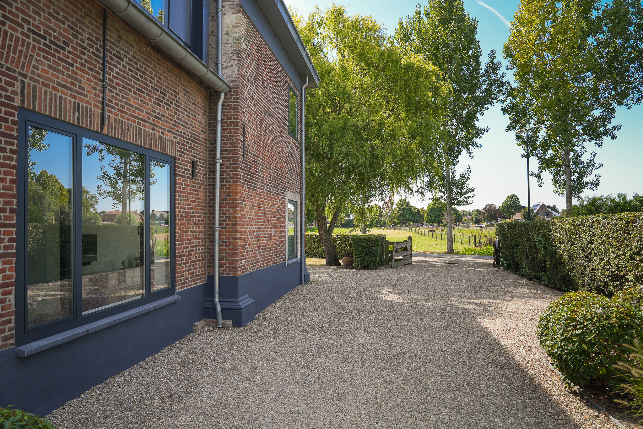 The entrance is centrally located behind the stately front door. The hallway, with its striking metal staircase, links the various rooms. To the left is the bright and atmospheric living room, with large windows, a modern poured floor and aluminium frames with HR++ glazing overlooking the driveway. A contemporary wood stove adds extra comfort on winter days. To the right is a second room, currently used as a playroom, but equally suitable as a study or fifth bedroom.