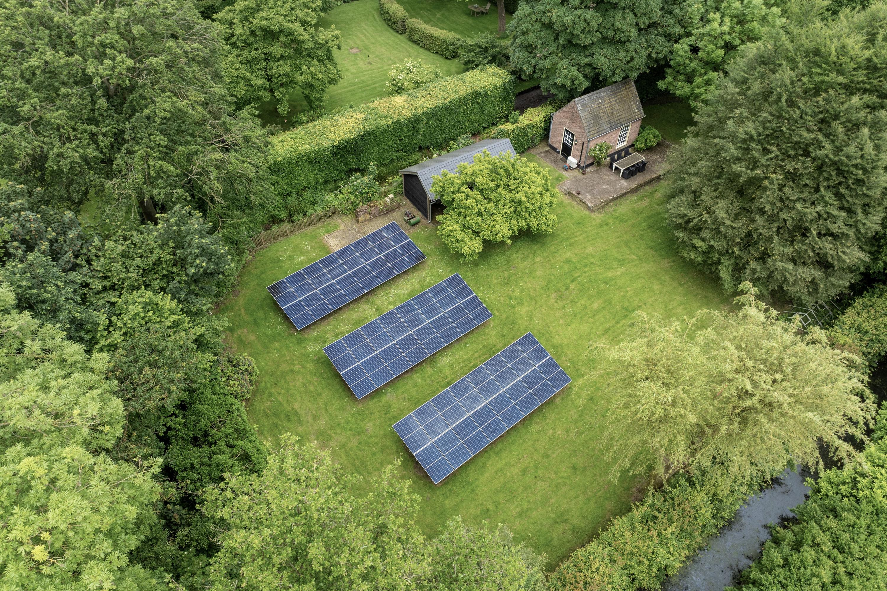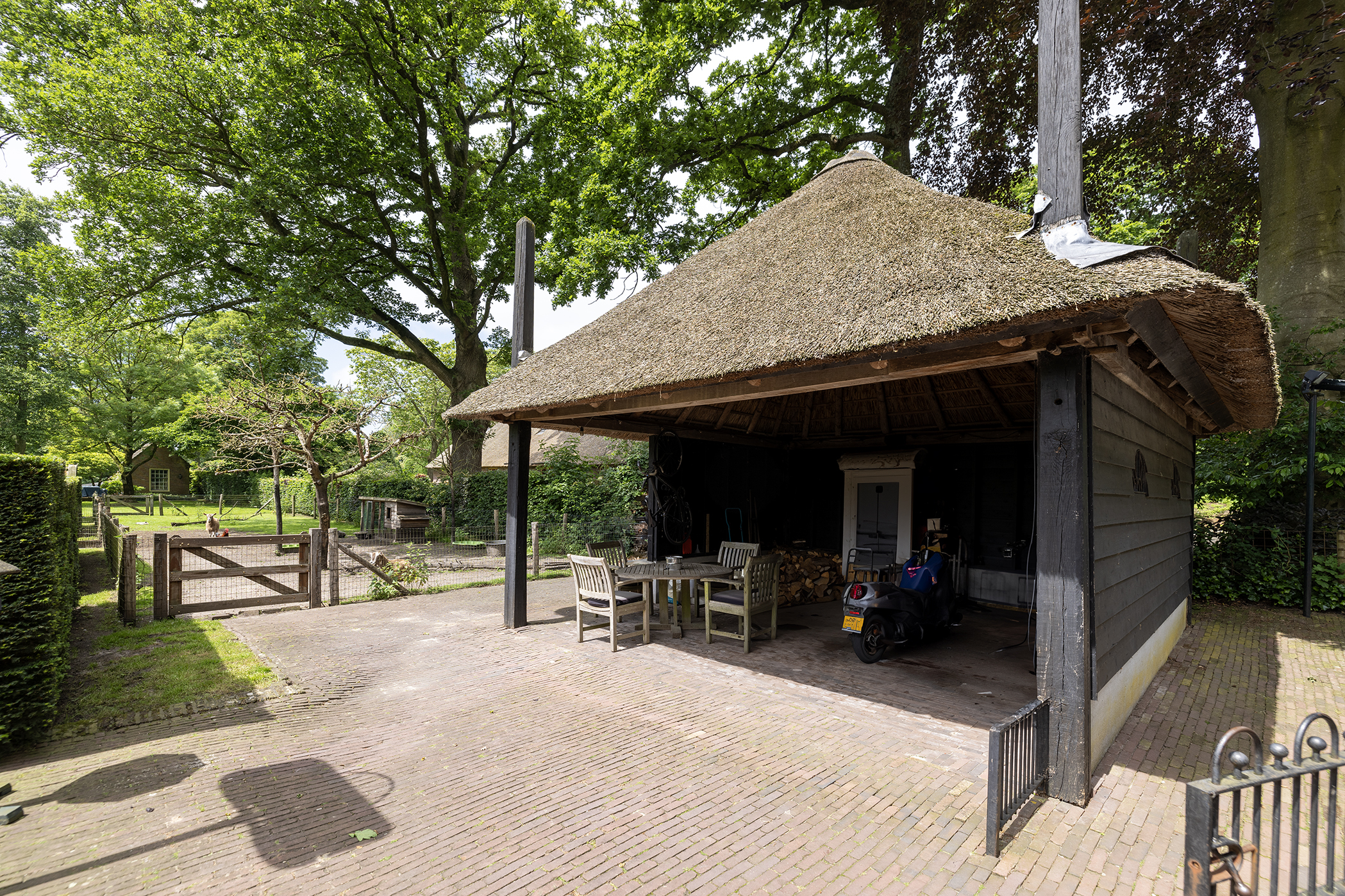 De hooiberg fungeert nu als overkapping voor fietsen, maar ook die ruimte is naar eigen smaak in te vullen. En de tuin? Die is niet alleen fraai aangelegd met mooie zichtlijnen, maar ligt ook perfect op de zon. Achterin vinden we de zonnepanelen en een houten schuur met overkapping – voor al uw tuinspullen en/of hobbyprojecten.