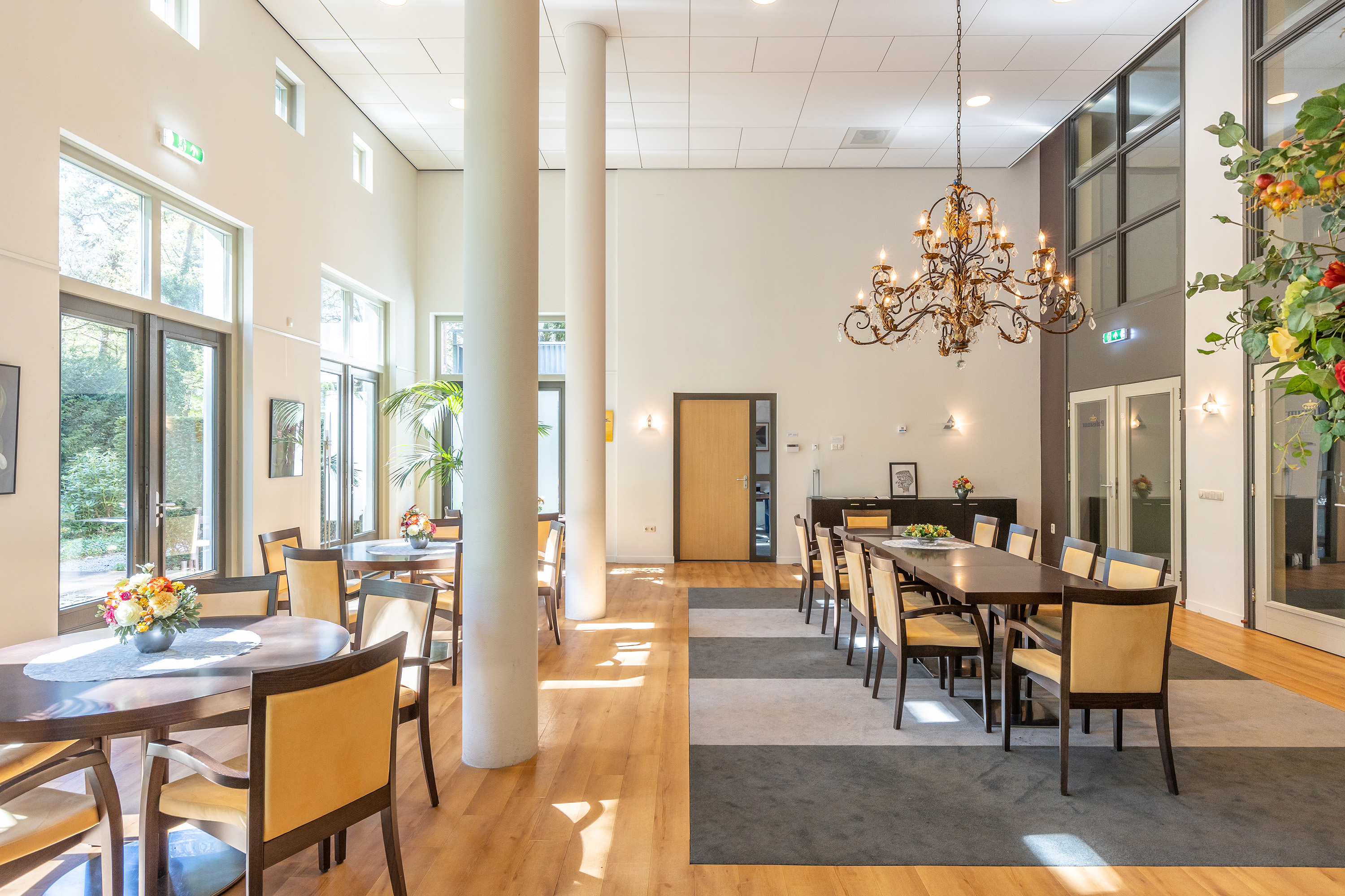 A caretaker is present on weekdays until 12 noon for maintenance work and minor services. The main building also features an inviting Grand Café with a terrace, ideal for dinners, receptions and various events. Cultural gatherings and concerts are regularly organised here. In addition, two guest rooms with private bathrooms are available for residents’ visitors.