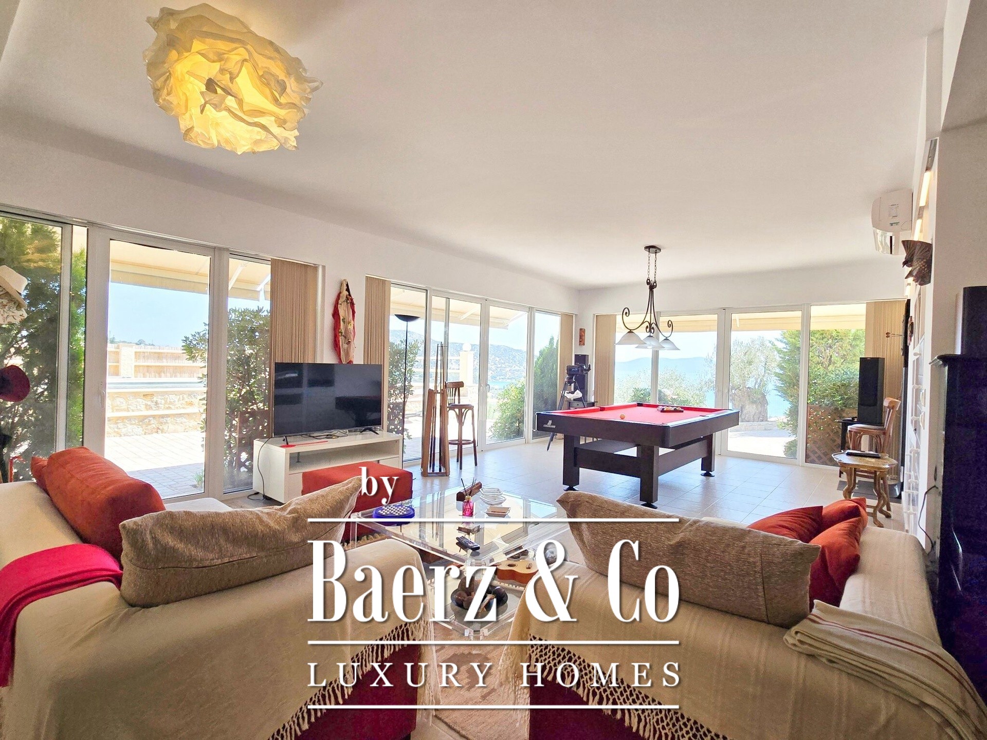Tranquility, luxury and unobstructed sea views are the elements that characterize this unique residence, which is located just 500 meters from the nearest beach in the area, in a quiet and well-kept neighborhood characterized mainly by luxurious holiday homes.
