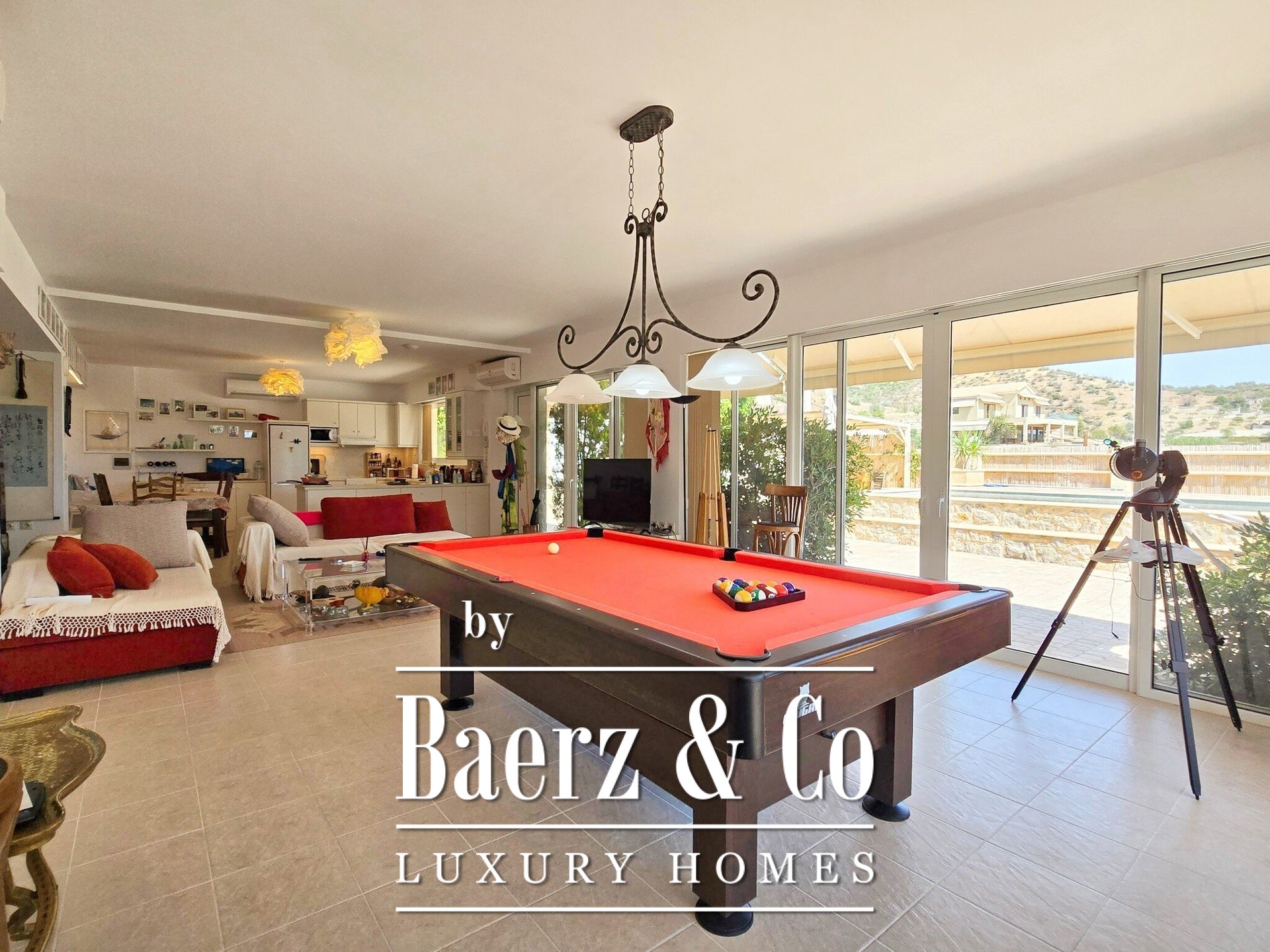 The residence, with a total area of 296 sq m. extends over 2 levels, is built within a beautifully landscaped and fully fenced plot of 2,000 sq m.