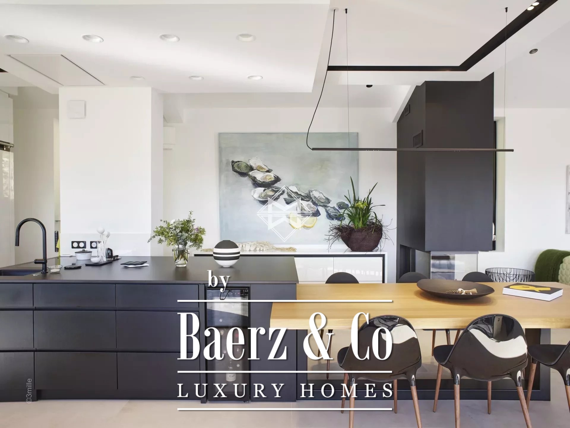 The main house covers approximately 400 square meters arranged over three levels, each connected by an elevator for ease and accessibility. This residence blends modern materials and authentic character, offering a spacious living and dining area with an open-plan kitchen, seamlessly joined to a shaded terrace and inviting summer kitchen beside the swimming pool. A study and generous laundry room complete the ground level, while the upper floor holds a master suite with dressing area and bathroom, two further bedrooms sharing a bathroom, and access to an elevated terrace. An artist’s studio provides potential for an additional bedroom with en suite. On the lower ground, a four-car garage and extensive storage ensure functional luxury.