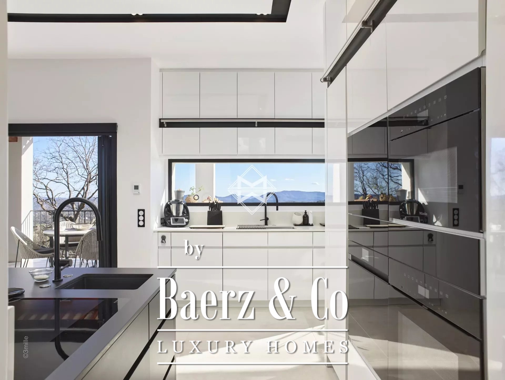 A separate 95-square-meter guest outbuilding includes its own living and dining space with kitchen, a large bedroom suite, and an artist’s studio, balancing privacy and hospitality. Throughout, amenities such as air-conditioning, fireplace, electric shutters, video security, and a connected thermostat enhance comfort.