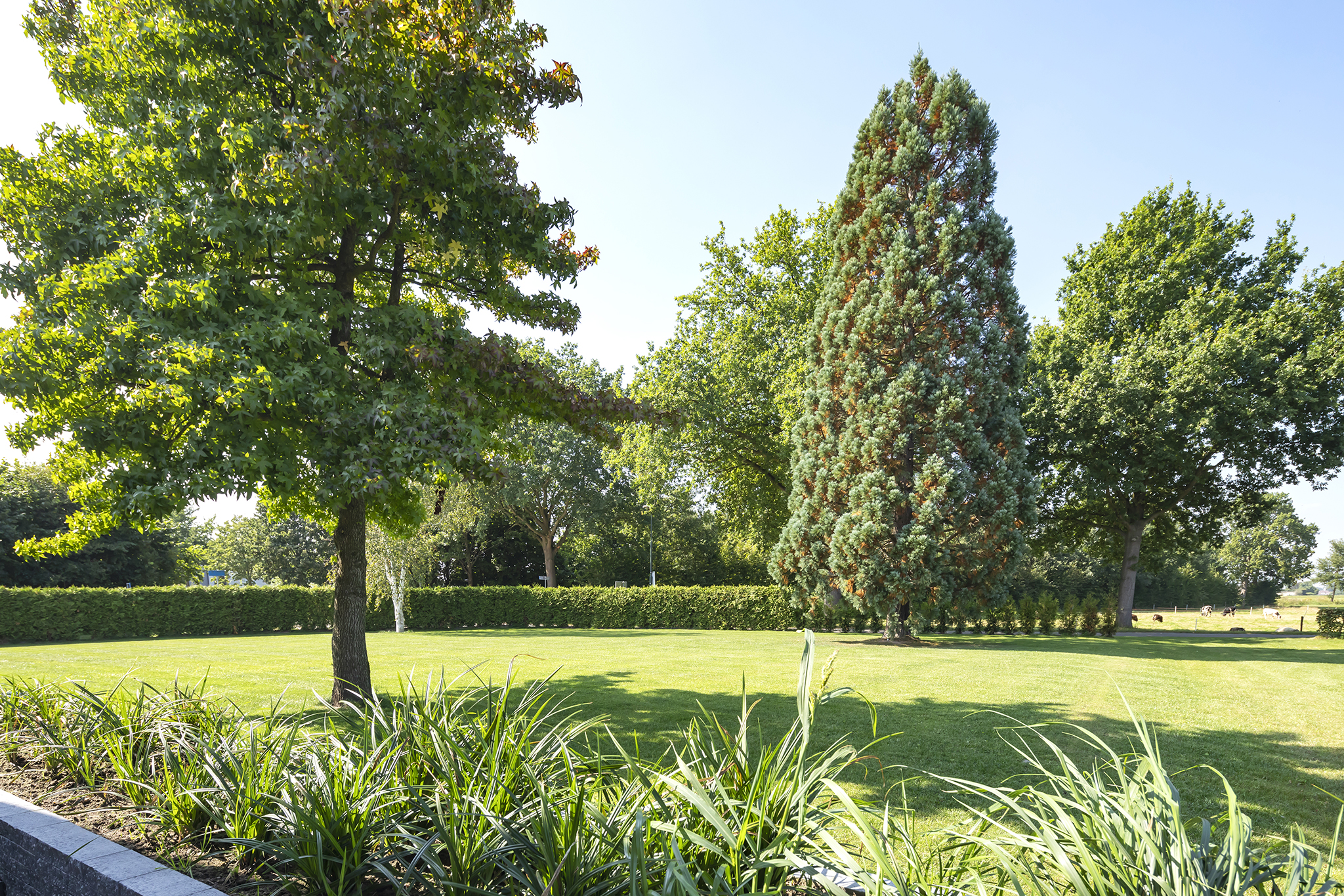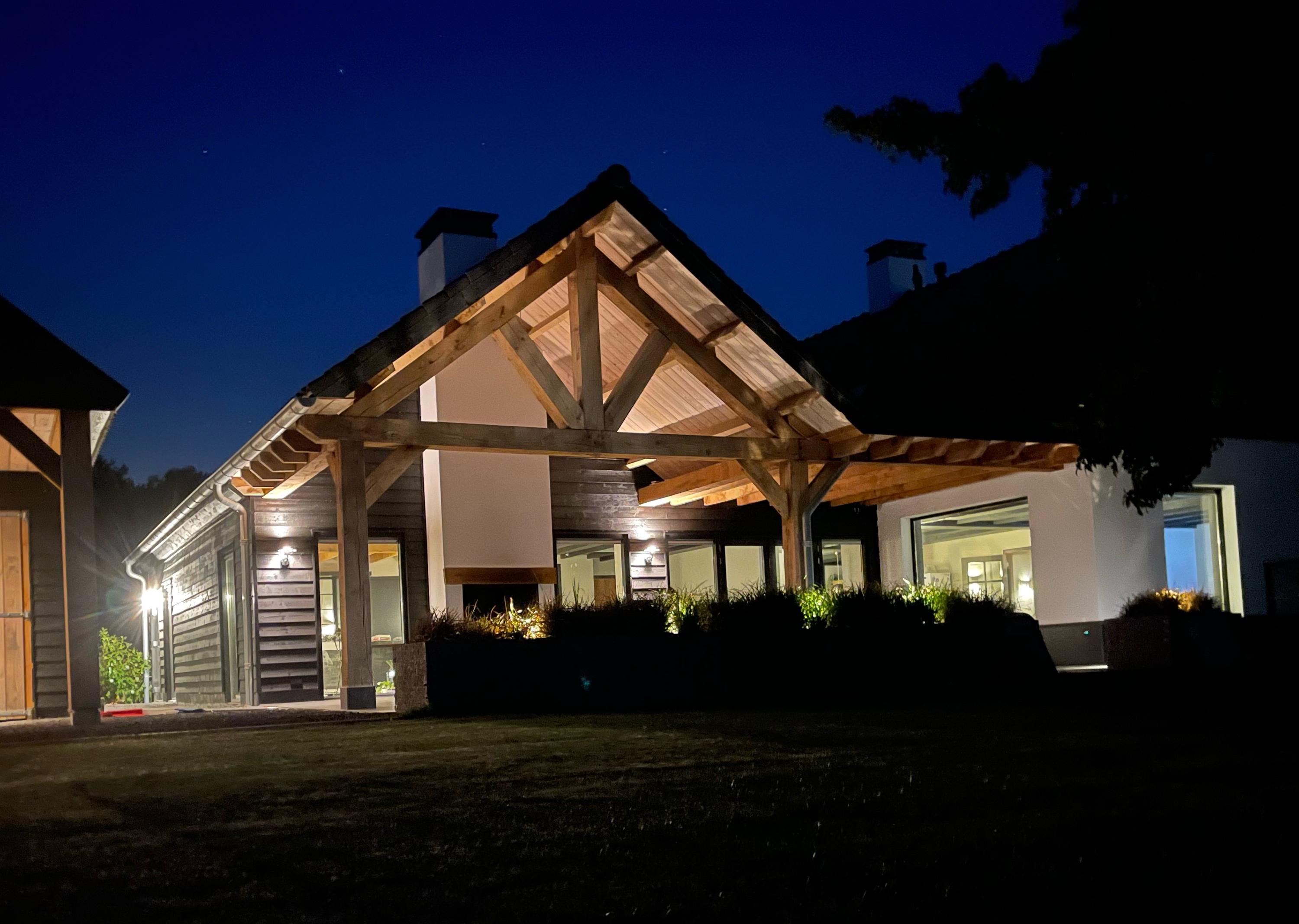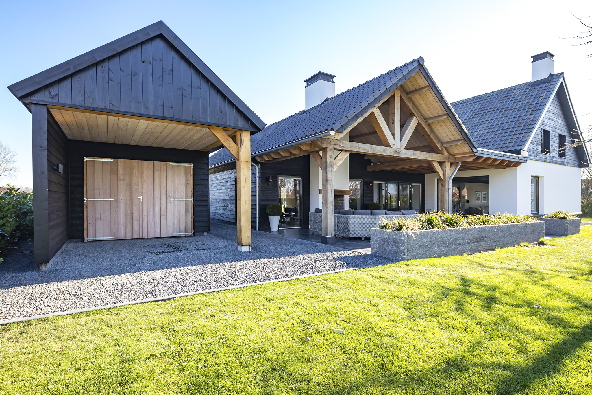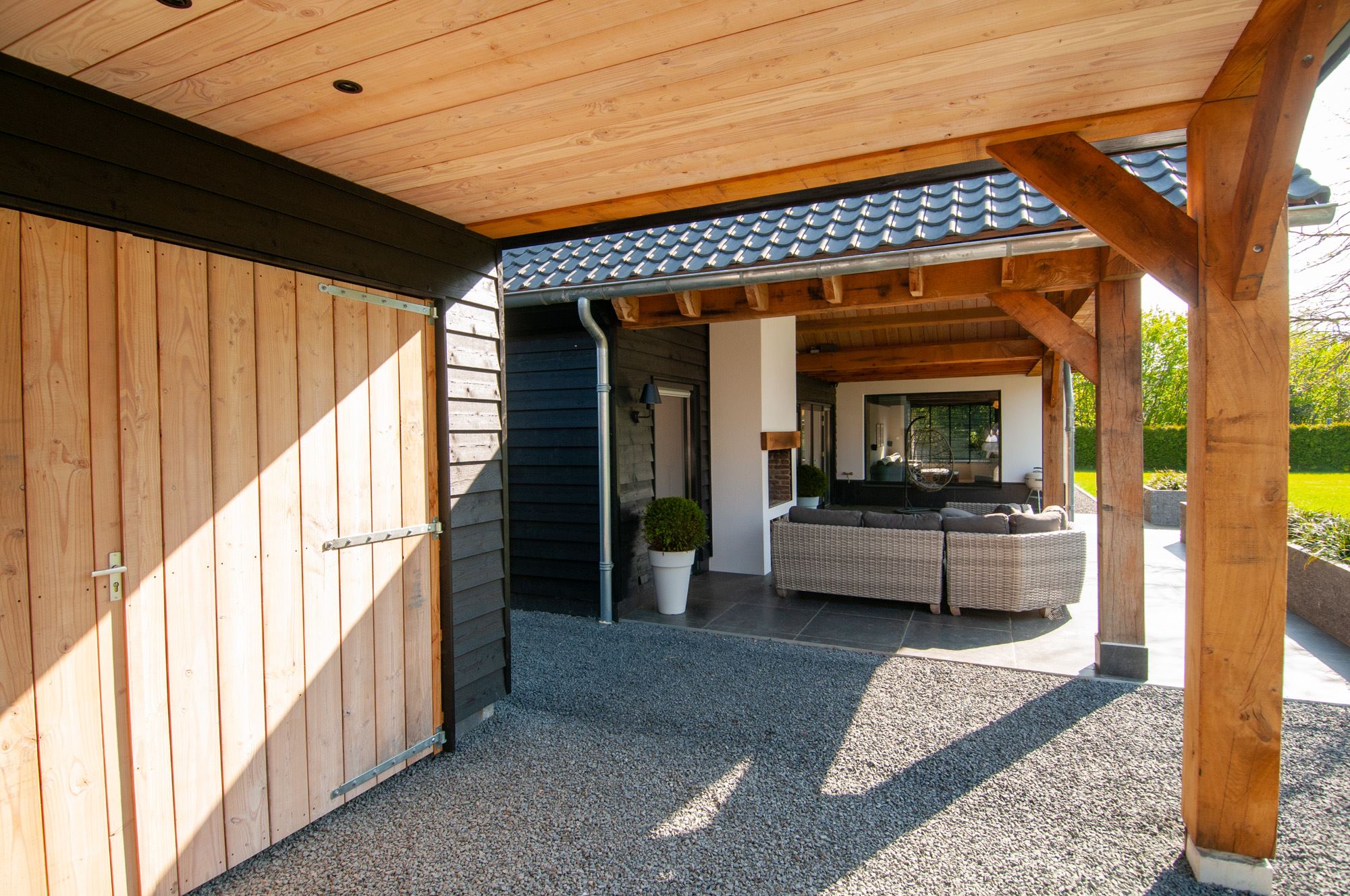 The surrounding garden with various mature trees and is neatly maintained, has a large lawn and a spacious covered terrace. This canopy made of Douglas fir and oak wood is a true eye-catcher! You can sit here with your family, friends or family. There is room for both a large garden table and a lounge set. The outdoor fireplace ensures that you are always comfortable here, even when it gets a little chilly outside.