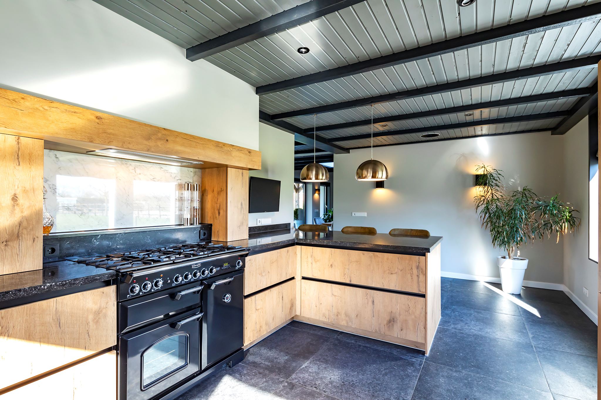 The living room has several attractive areas where you can sit. The fireplace provides even more atmosphere and extra warmth in the house. The entire floor is equipped with underfloor heating. There is room for a large dining table between the living room and the television area.