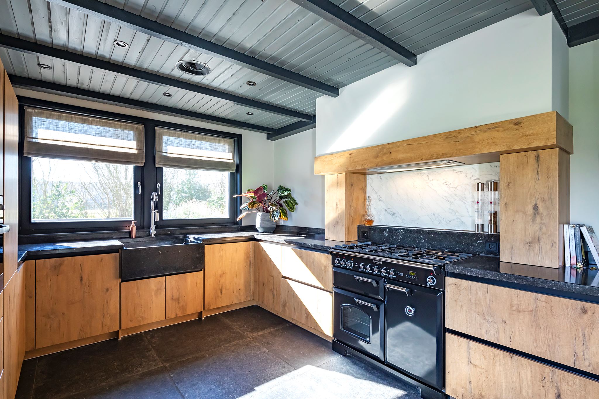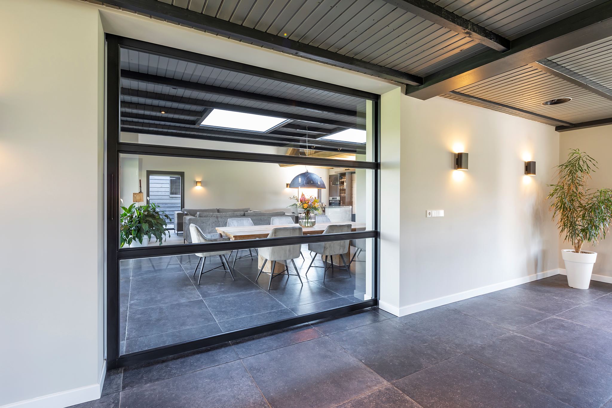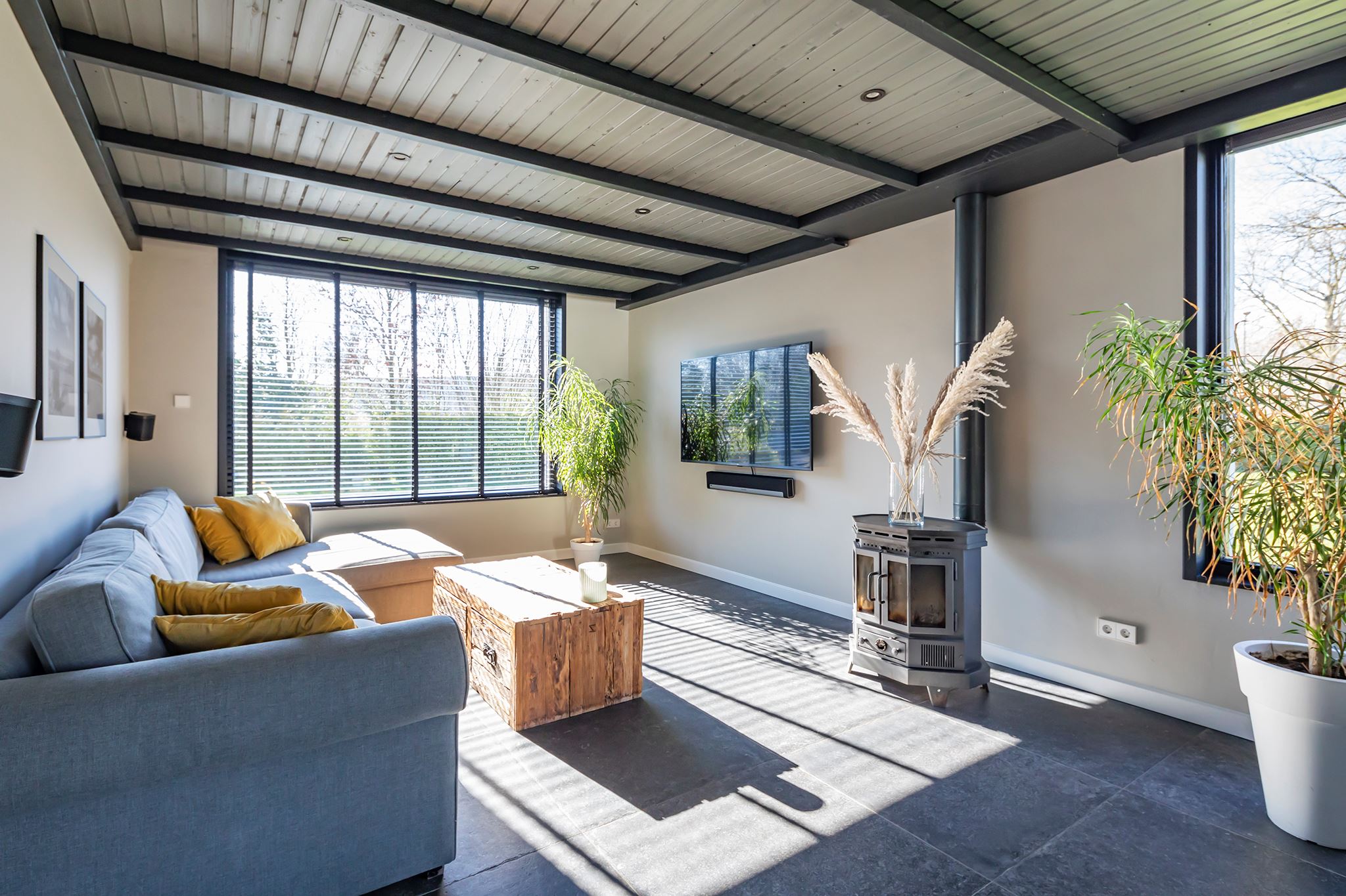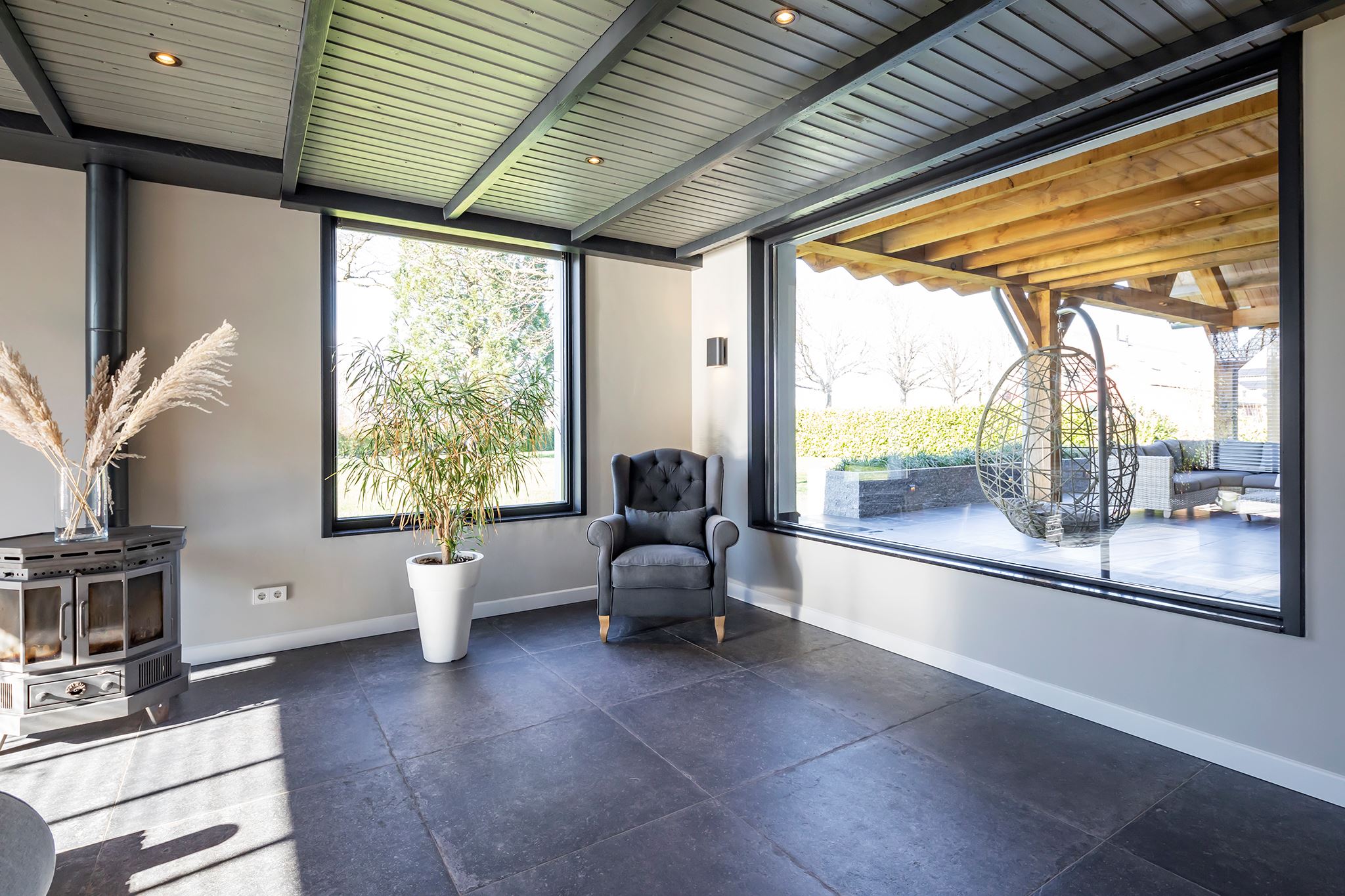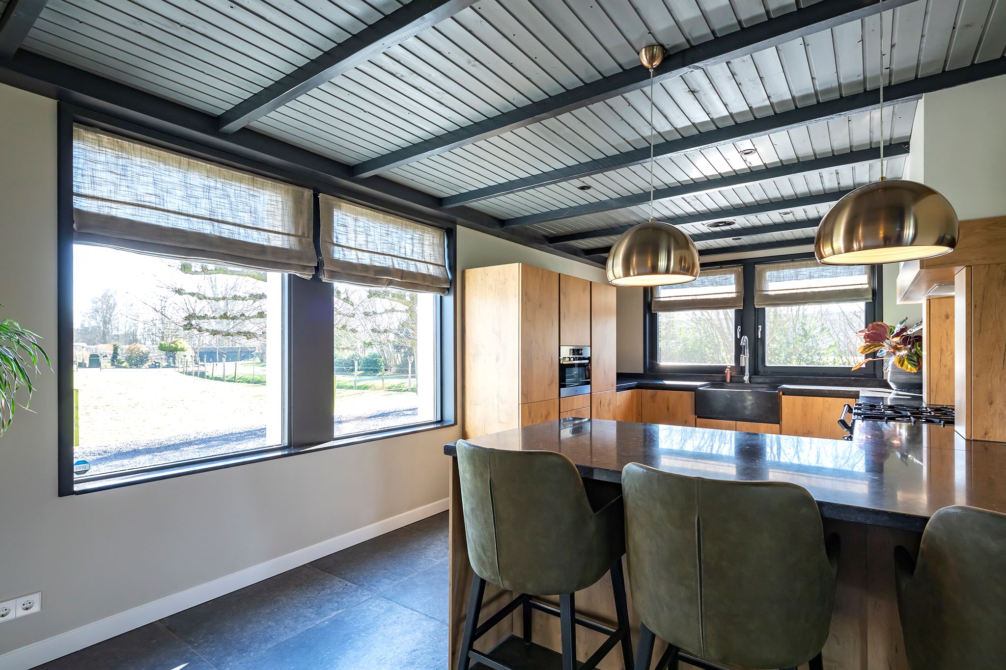 This house looks modern and neat at the front, but behind the front door lies an absolute gem! What a surprising home, you rarely come across one like this. Atmosphere and character, very contemporary, especially due to the special heights, the large windows and the beautiful light everywhere in the house.