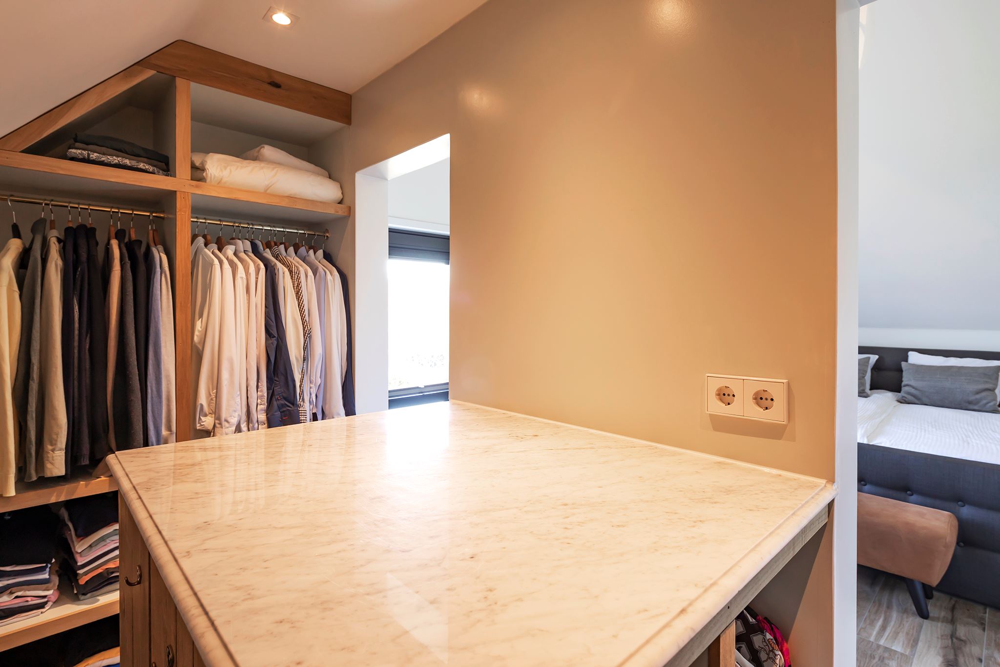 You can place the washing machine and dryer in the designated laundry room. This room has custom-made fitted wardrobes and a large skylight.