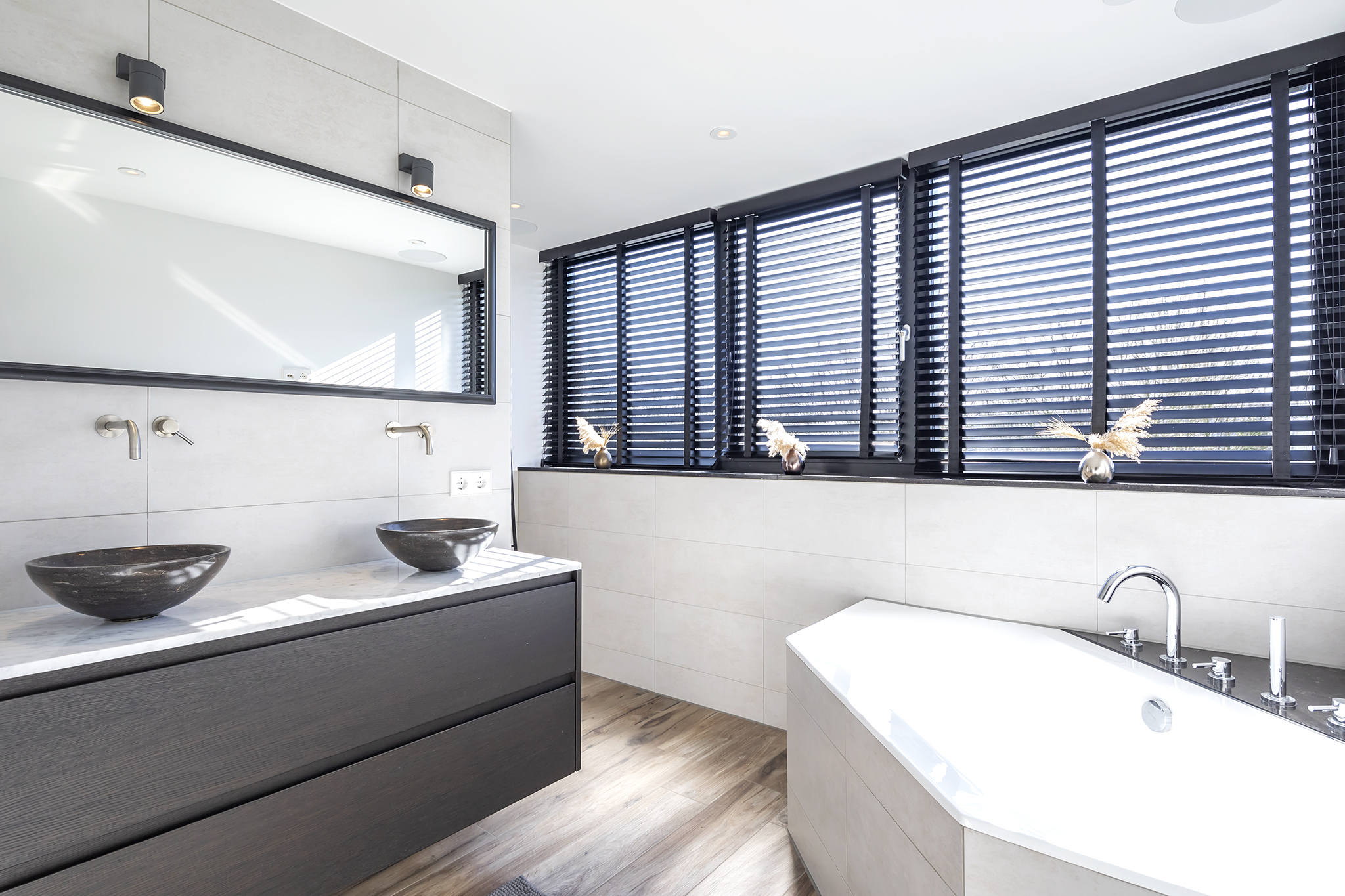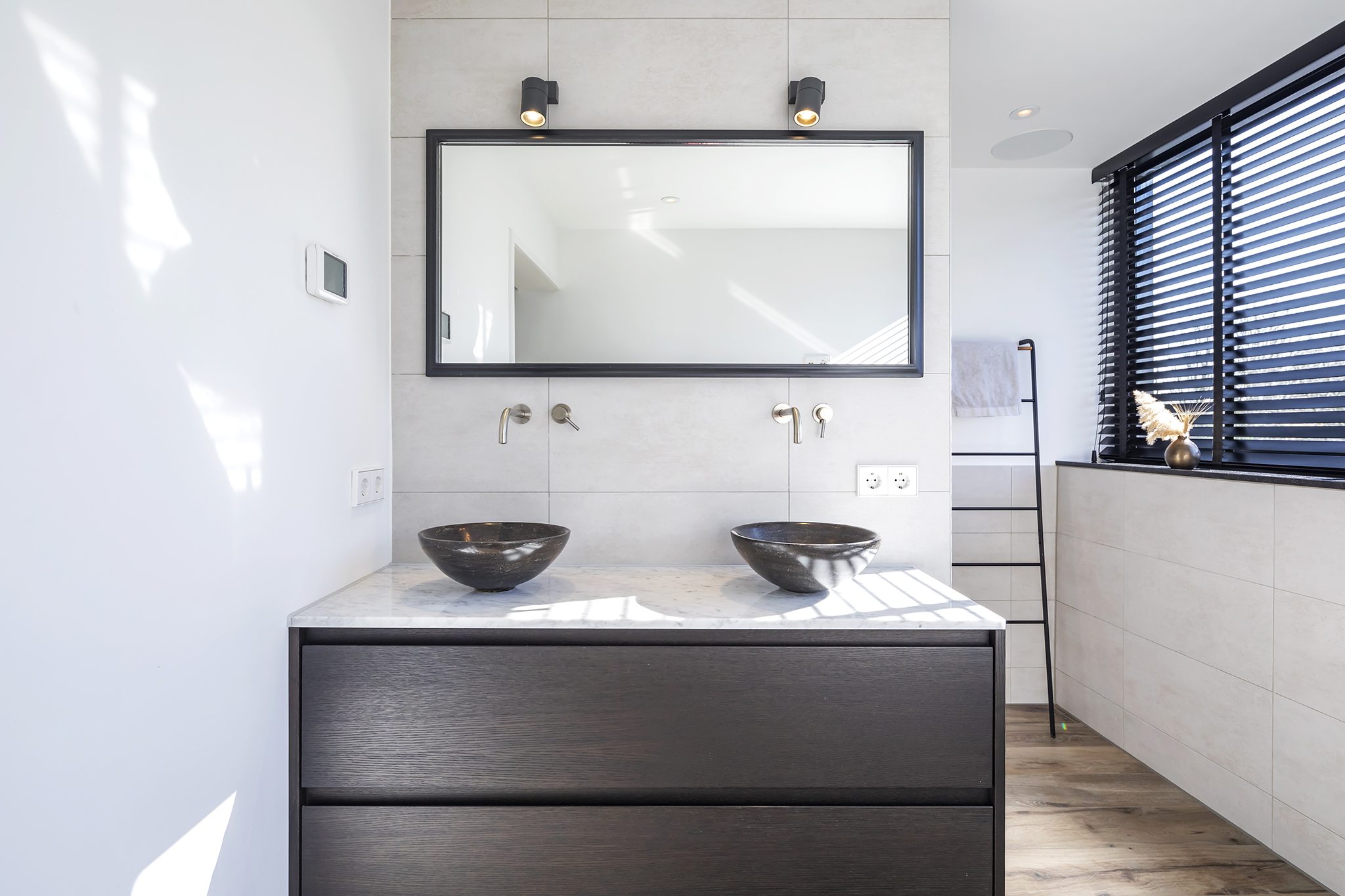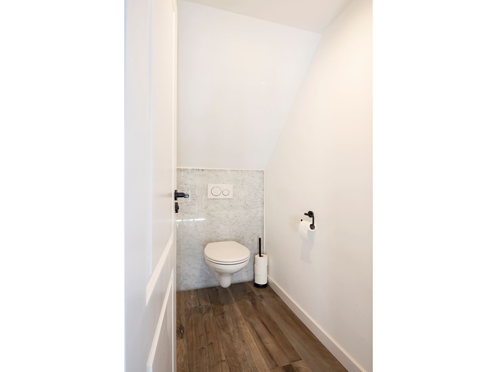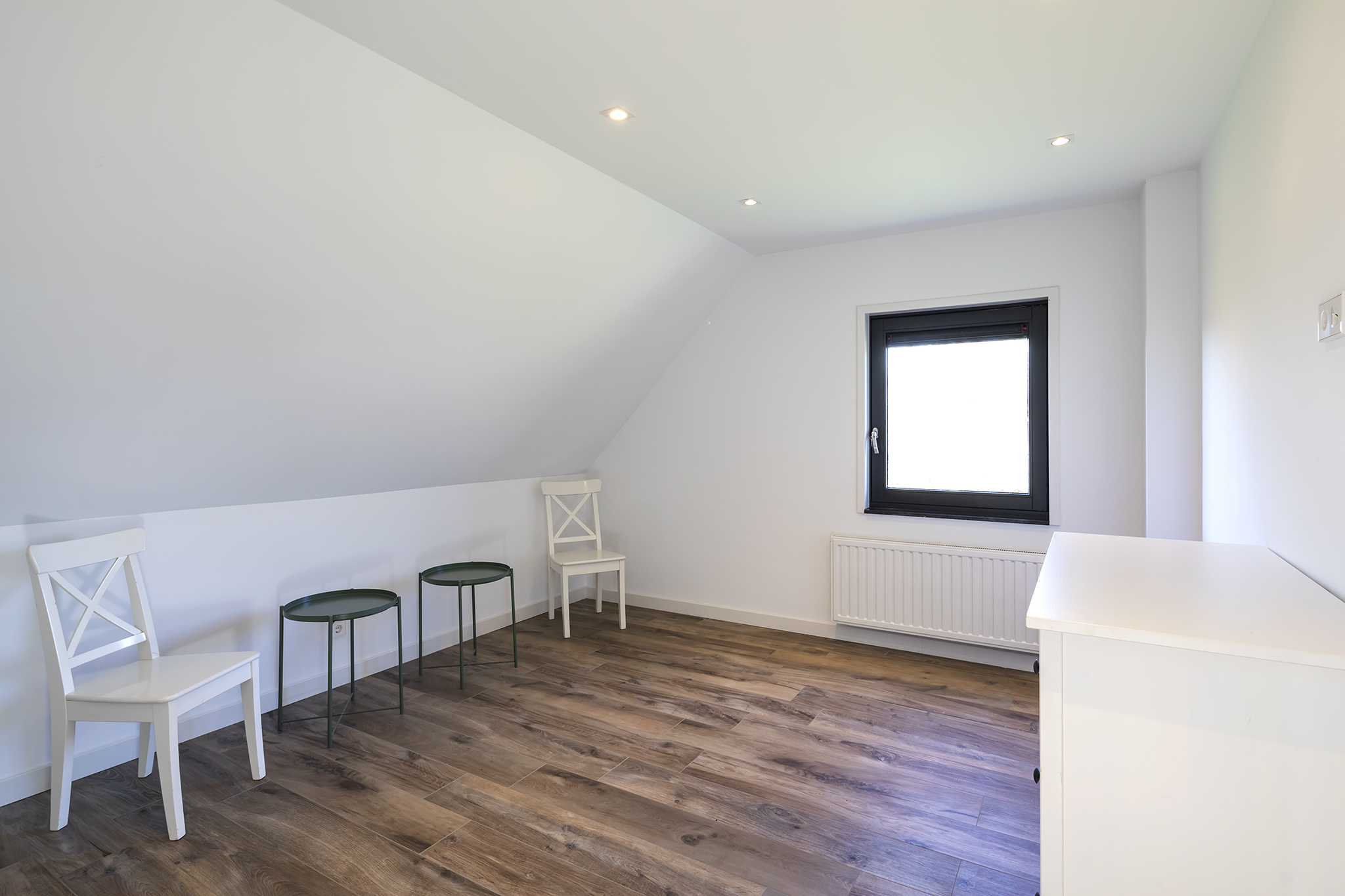 The beautiful bathroom is fully equipped, a corner bath, a walk-in shower with hand and rain shower and a wall unit with double sink. Thanks to the large dormer window, the bathroom has nice natural daylight and you can ventilate the room naturally as well as mechanically. The bathroom floor has underfloor heating. The toilet is located in a separate room on the landing.
