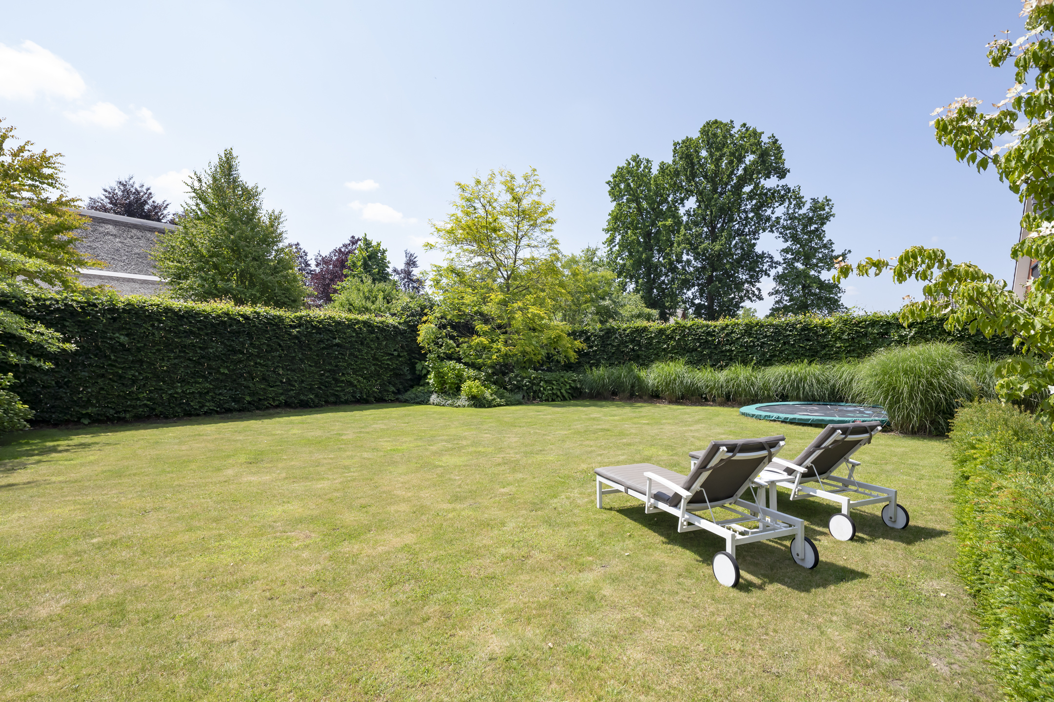 The garden is fantastic, offering wonderful privacy. The beautiful garden is bordered by green hedges, ensuring minimal views. A lovely lawn with a spacious sun terrace provides ample space for playing. In addition to the sun terrace, there is also a beautiful, spacious covered terrace adjacent to the rear of the house. The covered area has a large skylight, ensuring optimal daylight penetration into the living room. And then there's the unique sauna in the garden, where you can relax after a hard day's work. The front garden is also neatly landscaped and has a spacious driveway with space for 4 to 6 cars.