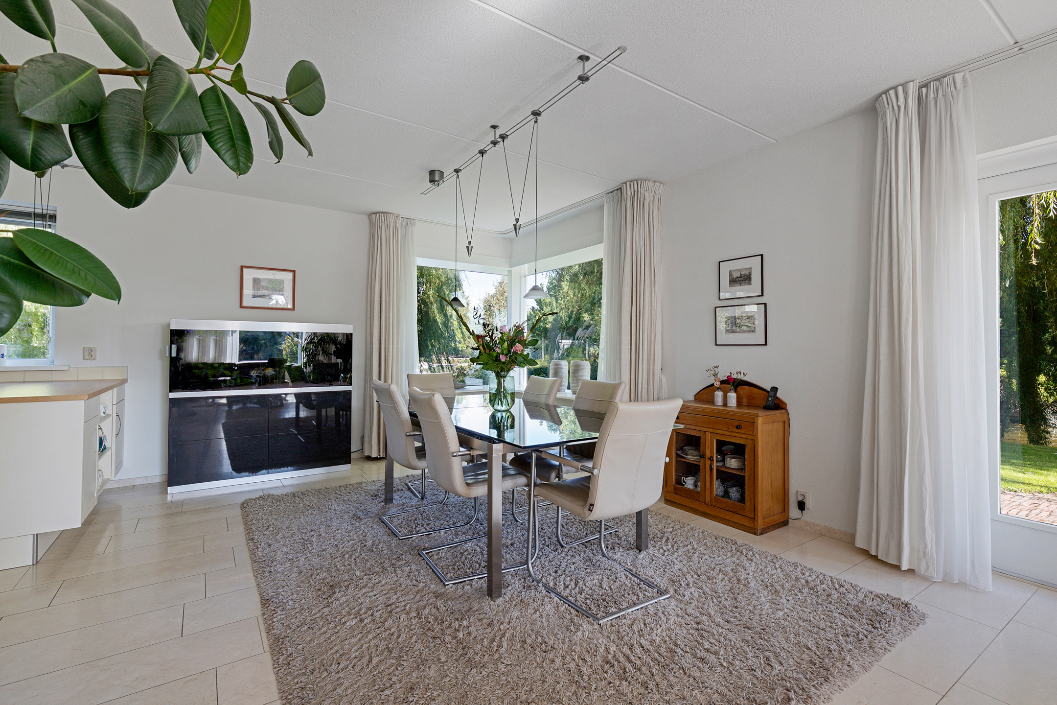 The beautifully landscaped garden with mature trees, shrubs, borders, and terraces ensures privacy and offers both sunny and shaded spots throughout the day. A sunken south-east facing terrace directly on the water, complete with a private swimming ladder, is the perfect place to enjoy your morning coffee or relax all day while watching boats pass by. The waterway is a branch of the famous *Bolswardervaart*, part of the historic Eleven Cities Route, and is accessible by boat.