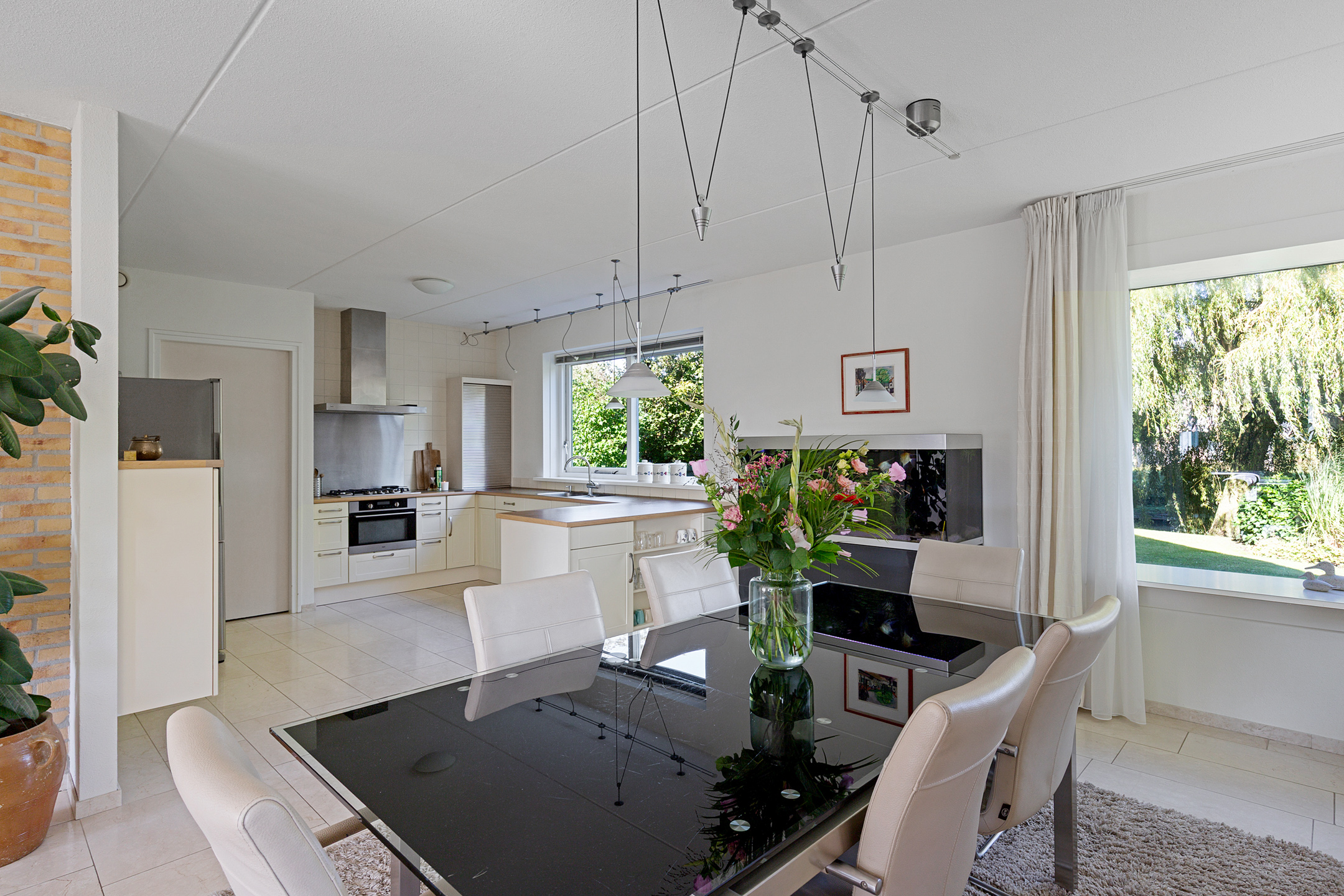 From the living room, the eye is immediately drawn to the sweeping water views and the landscaped garden. The abundance of windows floods the room with natural light, while the stately weeping willows along the water’s edge ensure privacy. The house sits on a corner plot at the end of a cul-de-sac, enhancing the sense of space and tranquillity.
