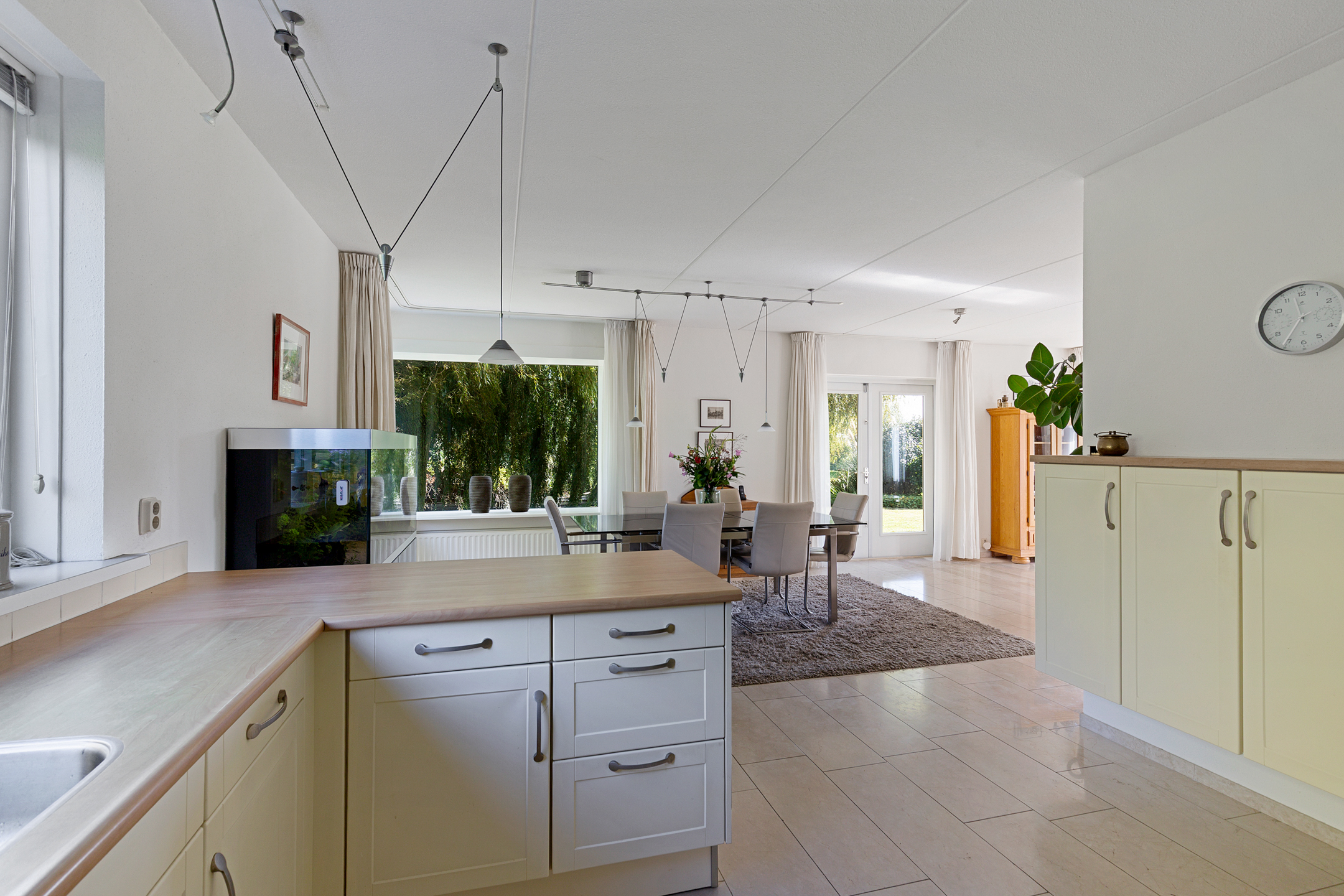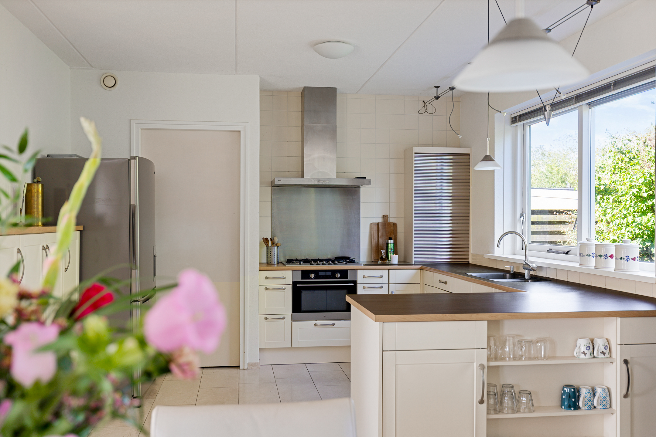 The L-shaped living room extends across the full width of the property and offers many possibilities for arranging seating, dining, and lounge areas to personal taste. French doors open onto the garden. The kitchen is fitted with built-in appliances, and although no fireplace is currently in place, the home does feature a flue connection.