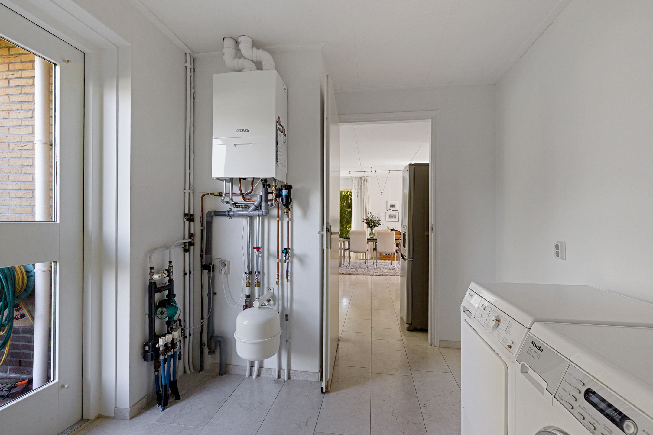 The adjacent utility room provides space for laundry appliances and has direct access to both the garden and garage. The entire ground floor is finished with a natural stone floor and underfloor heating.