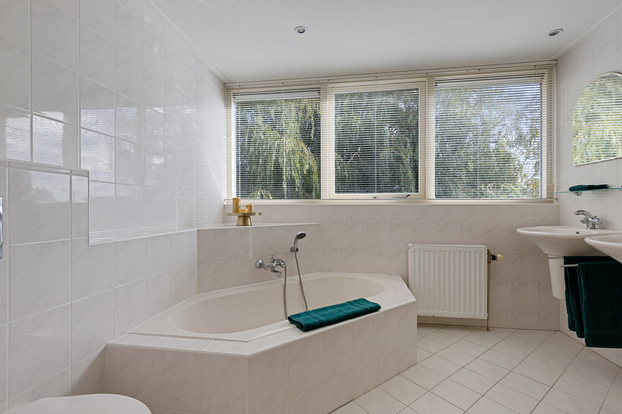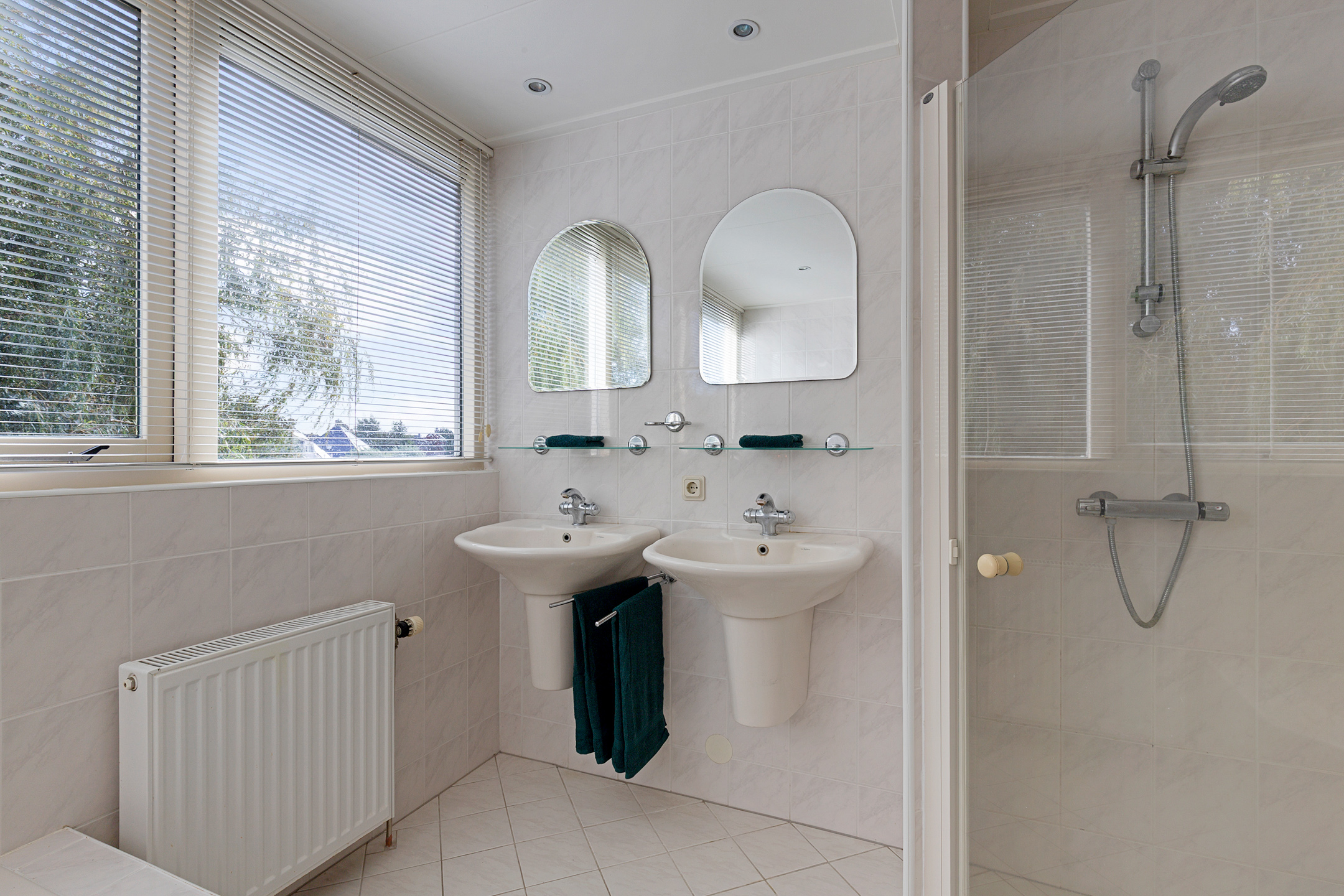 The bathroom, in a neutral colour scheme, is enhanced by a large dormer window, and offers a bathtub, shower, toilet, and double washbasins. The large windows here also provide beautiful garden and water views.