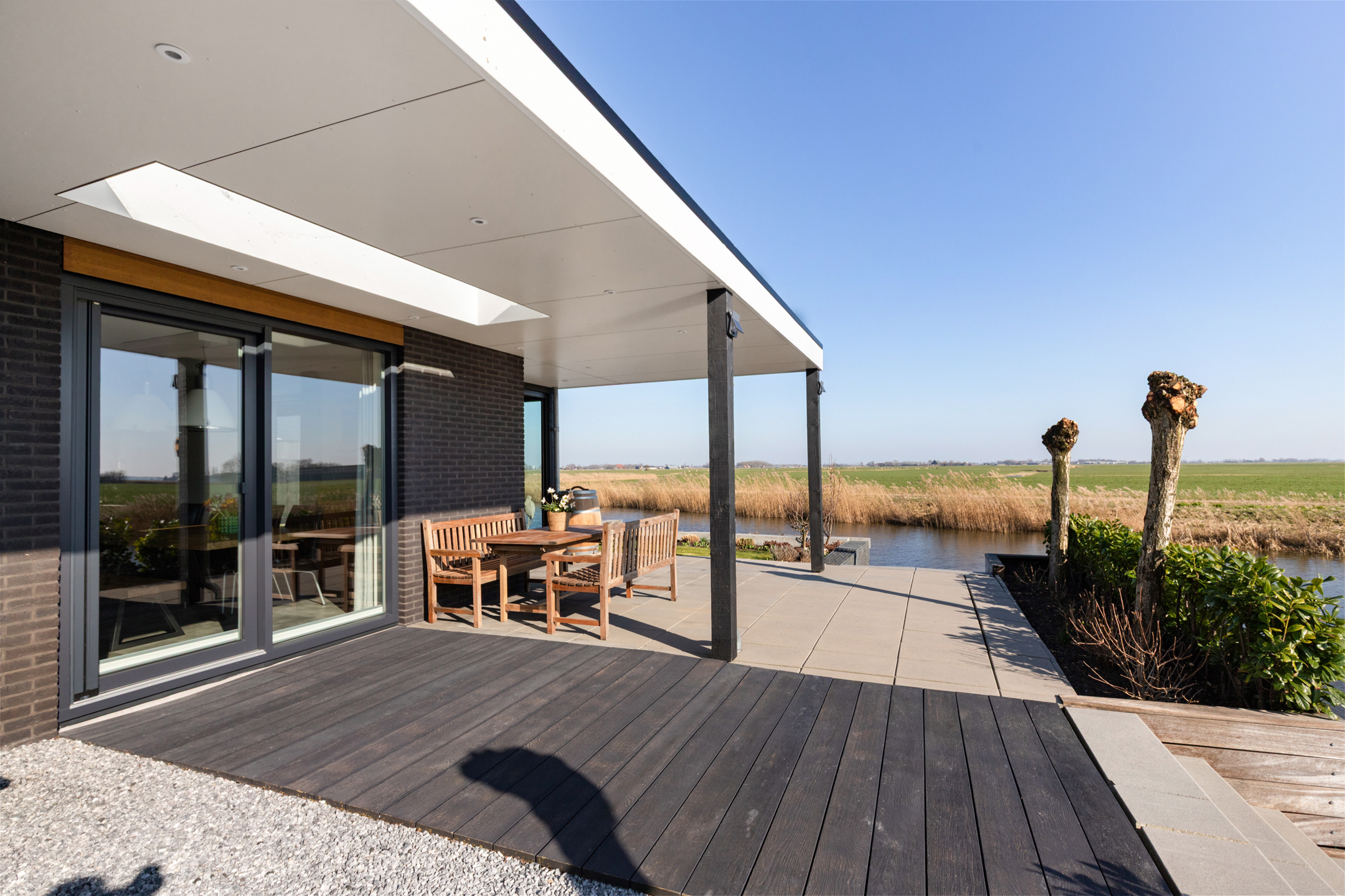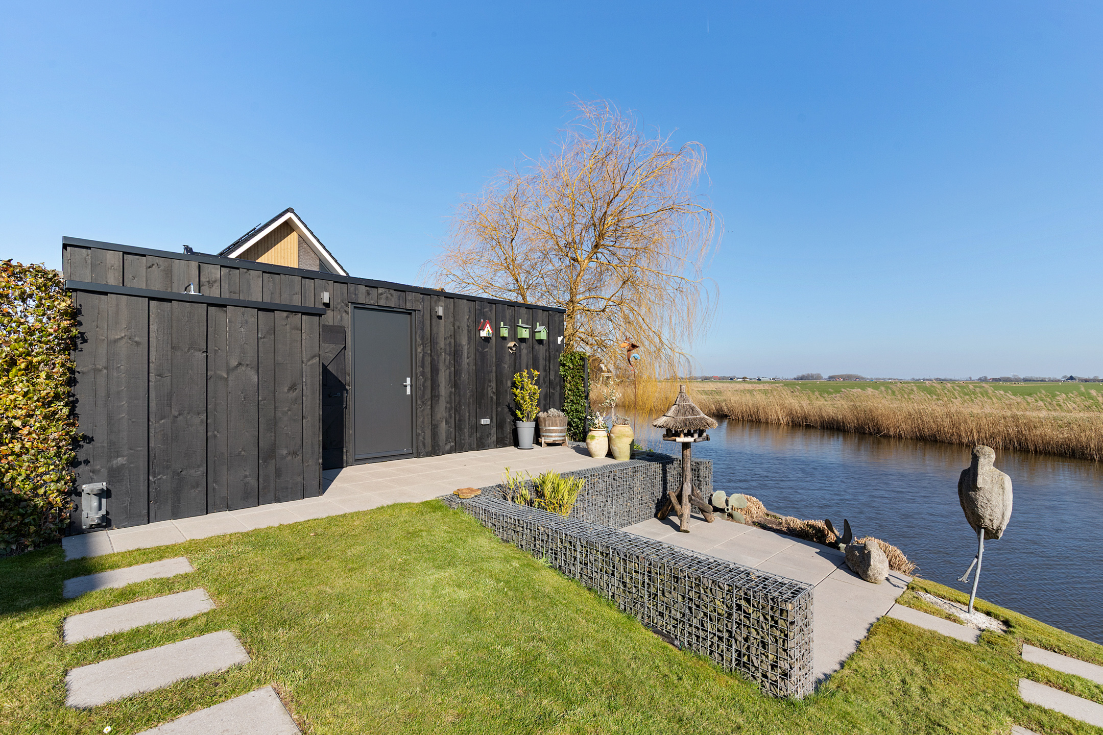 Thanks to the corner location on the water, the property enjoys a generous sun deck flanked by two luxury mooring docks, one with a swimming ladder. The enclosed stylish outdoor shower is a welcome addition for swimmers. The water in front of the property is calm, partly private, and connects directly to the Bolswardervaart.