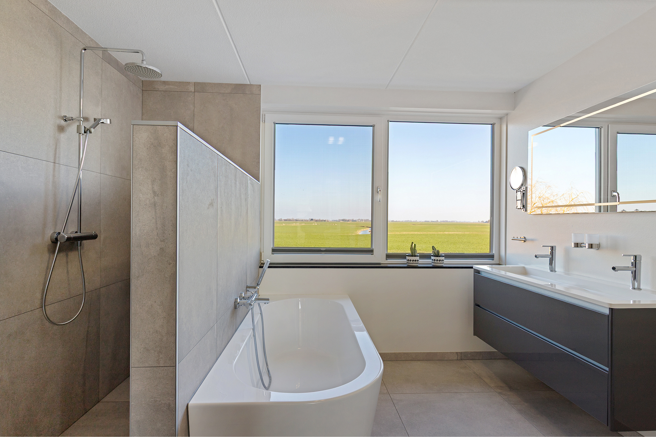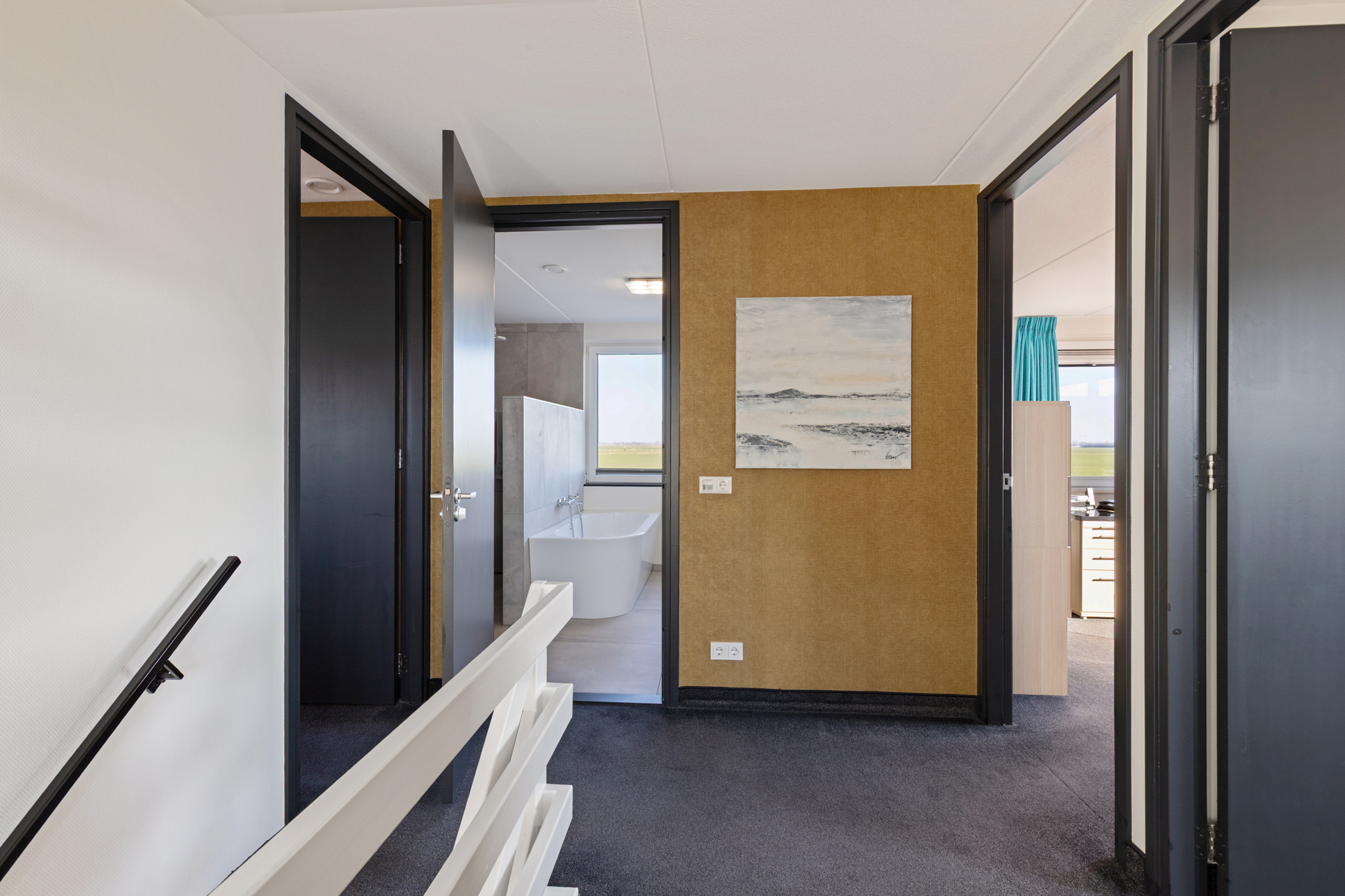 Through the covered entrance, you enter a spacious hall with staircase, guest toilet, and meter cupboard. A glass pivot door provides a beautiful sightline through the living room to the water and open fields.