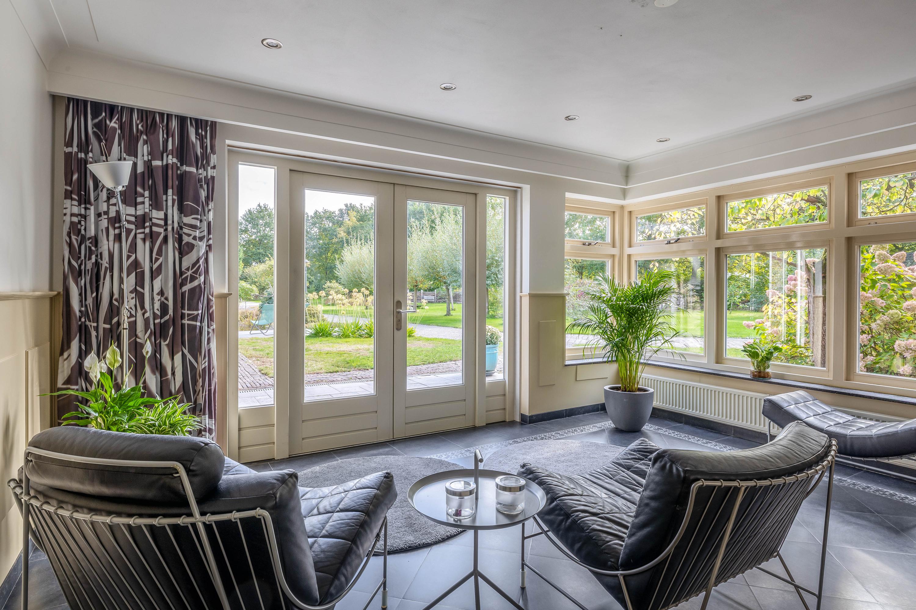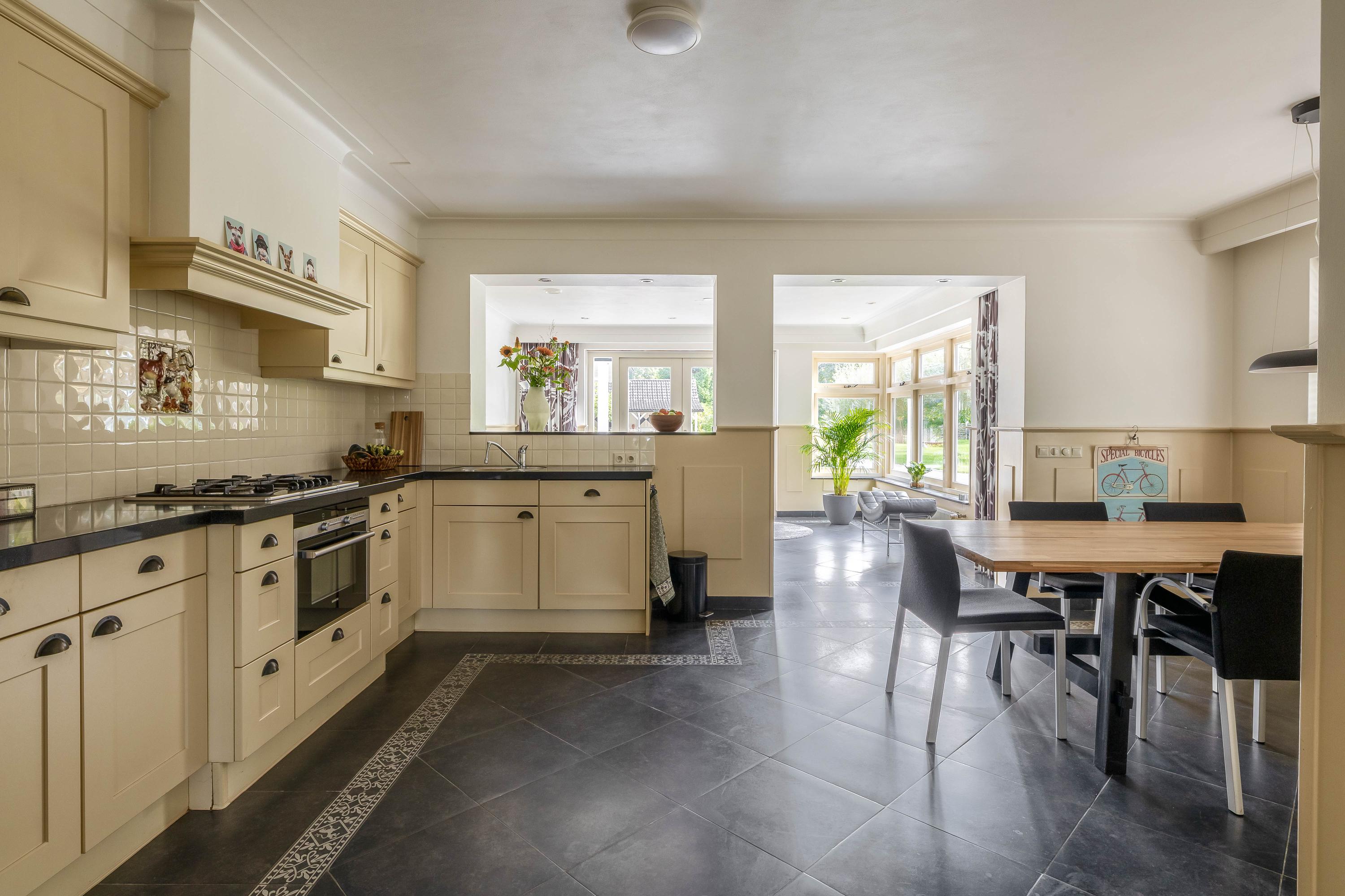 window provides access to the living room. The living room has a marble tiled floor with underfloor heating, stucco walls and a stucco ceiling with decorative mouldings. Thanks to the many windows and a large bay window, the room enjoys plenty of natural light, creating a spacious effect. Adjacent to the living room is a versatile space, ideal for an inspiring workspace or a cosy play area. The space can be closed off with a sliding door with stained glass. The kitchen has a corner layout and is equipped with a 5-burner gas hob, combination microwave/oven, sink, American fridge and dishwasher. Various base and wall cabinets provide storage space. There is enough space to place a dining table. The kitchen has a tiled floor with bis. The walls are partly finished with sleek stucco and partly with wooden panelling. The ceiling has stucco with decorative mouldings. The kitchen is open to the adjoining garden room. Here too, large windows provide a sea of light and a beautiful view of the surrounding garden. A wonderful place to relax! The walls are partly finished with sleek stucco and partly with wooden panelling. The ceiling is also finished with stucco and decorative mouldings. French doors provide access to the garden. There is also access to the utility room from here. The utility room is a practical space, equipped with a sink, a storage cupboard and a fixed cupboard wall with sliding doors. There is also a toilet. A door provides access to the garden. You can also reach the rear of the house from this room.
