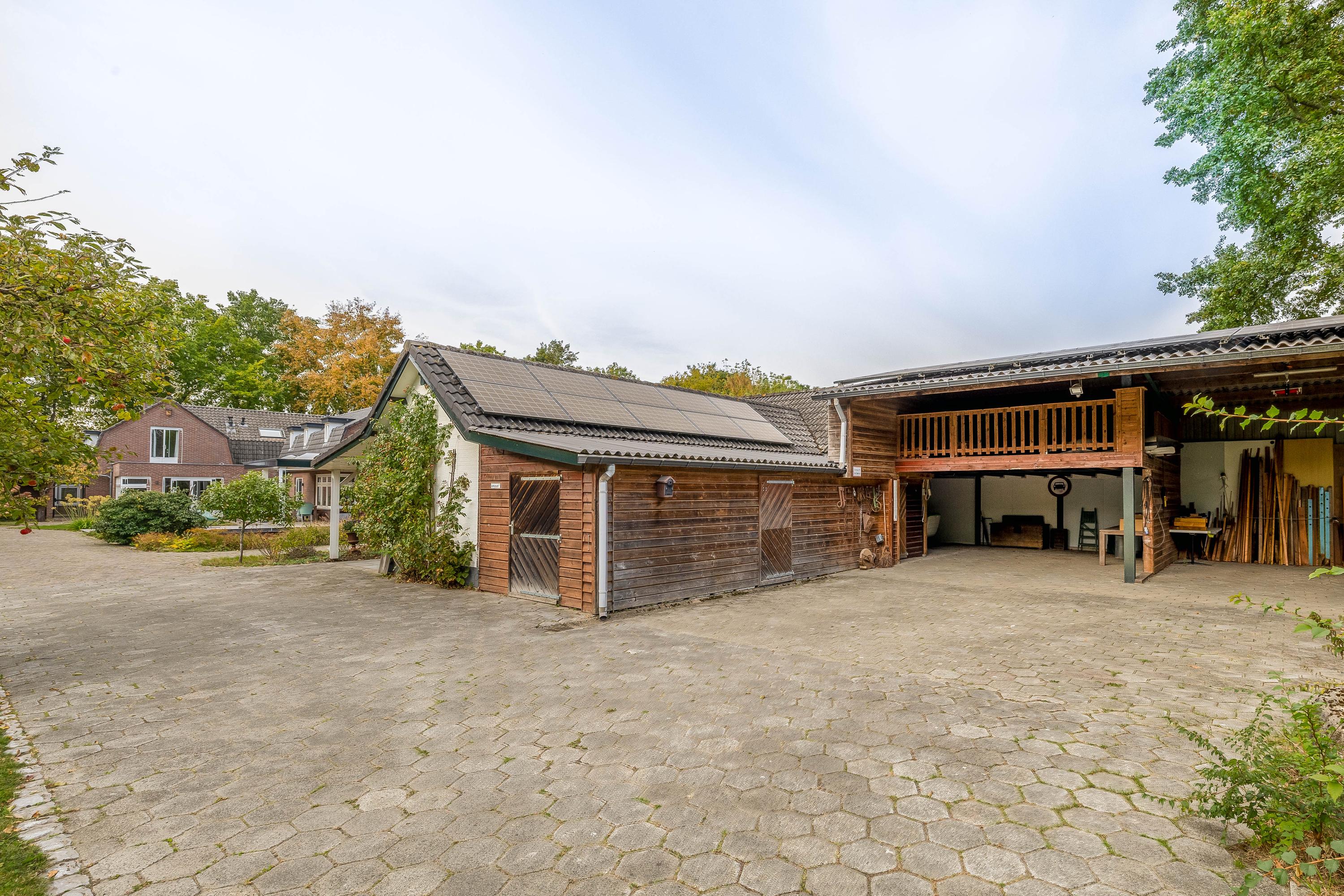 The outbuilding is constructed of brickwork and the roof is insulated and covered with roof tiles. French doors in the front façade provide access from the garden to a pleasant space finished with a tiled floor, stucco walls and a sanded ceiling with recessed lighting. This space is ideal for use as a hobby or chill-out room. In addition, the outbuilding also has its own central heating boiler and shower room, which is equipped with a walk-in shower, toilet and washbasin. A loft ladder provides access to the storage attic. The space is currently used as a hobby room, but is of course also very suitable for various other purposes. On the right-hand side of the building are three former horse stalls. These stalls are equipped with divisible doors with an overhang at the front. The stalls are currently used as storage spaces. One of the stalls houses the inverter for the solar panels. There is a sink. The overhang at the front is spacious and can serve as a covered terrace, a wonderful place to sit. At the rear is a shed with wooden walls and a corrugated iron roof. This