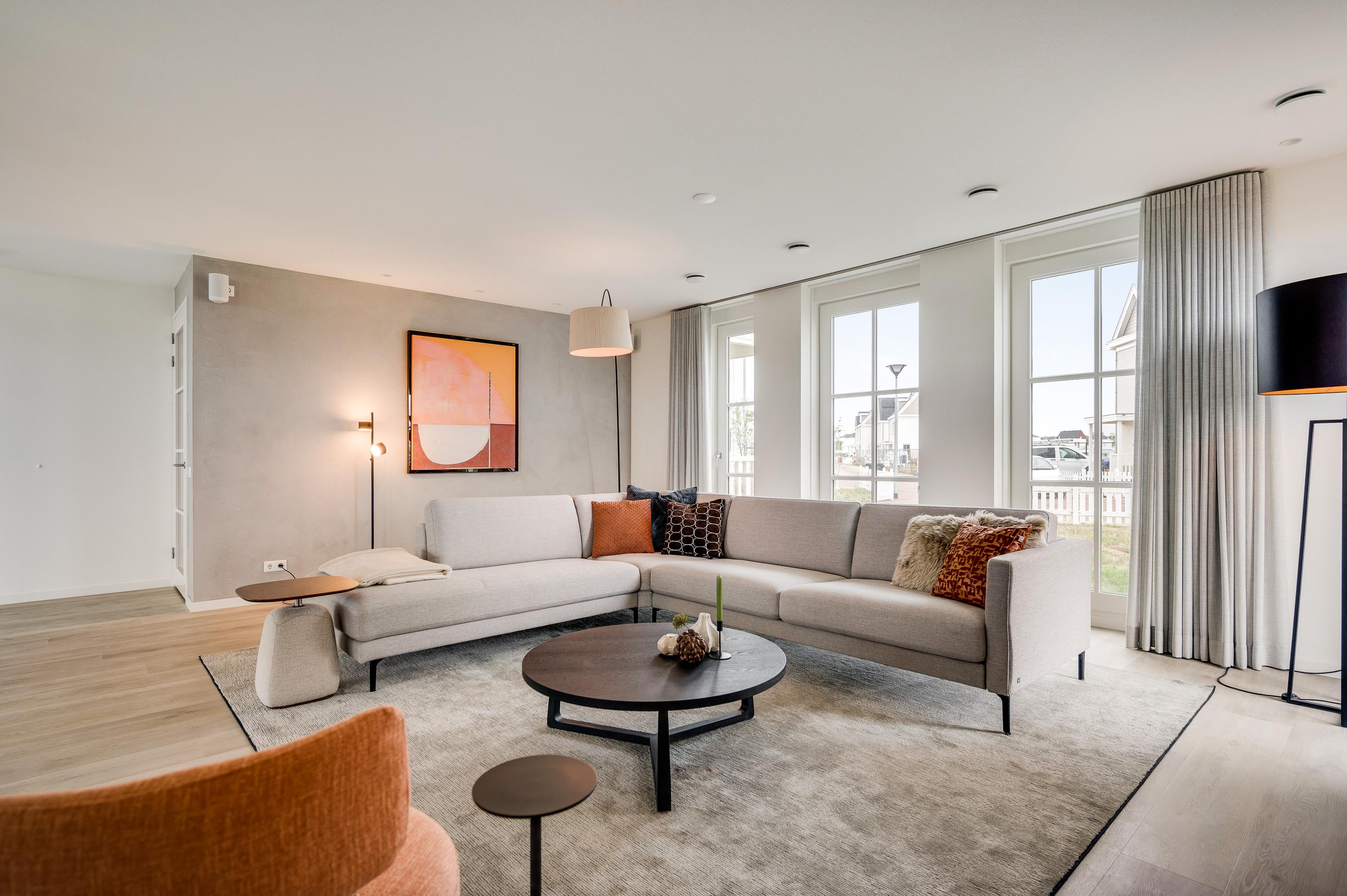 The living room is located at the front of the house. Due to the deep front garden and the large distance to the street, you can also sit here wonderfully quiet and free. A sea of ??light enters through the large windows at both the front and back of the house.