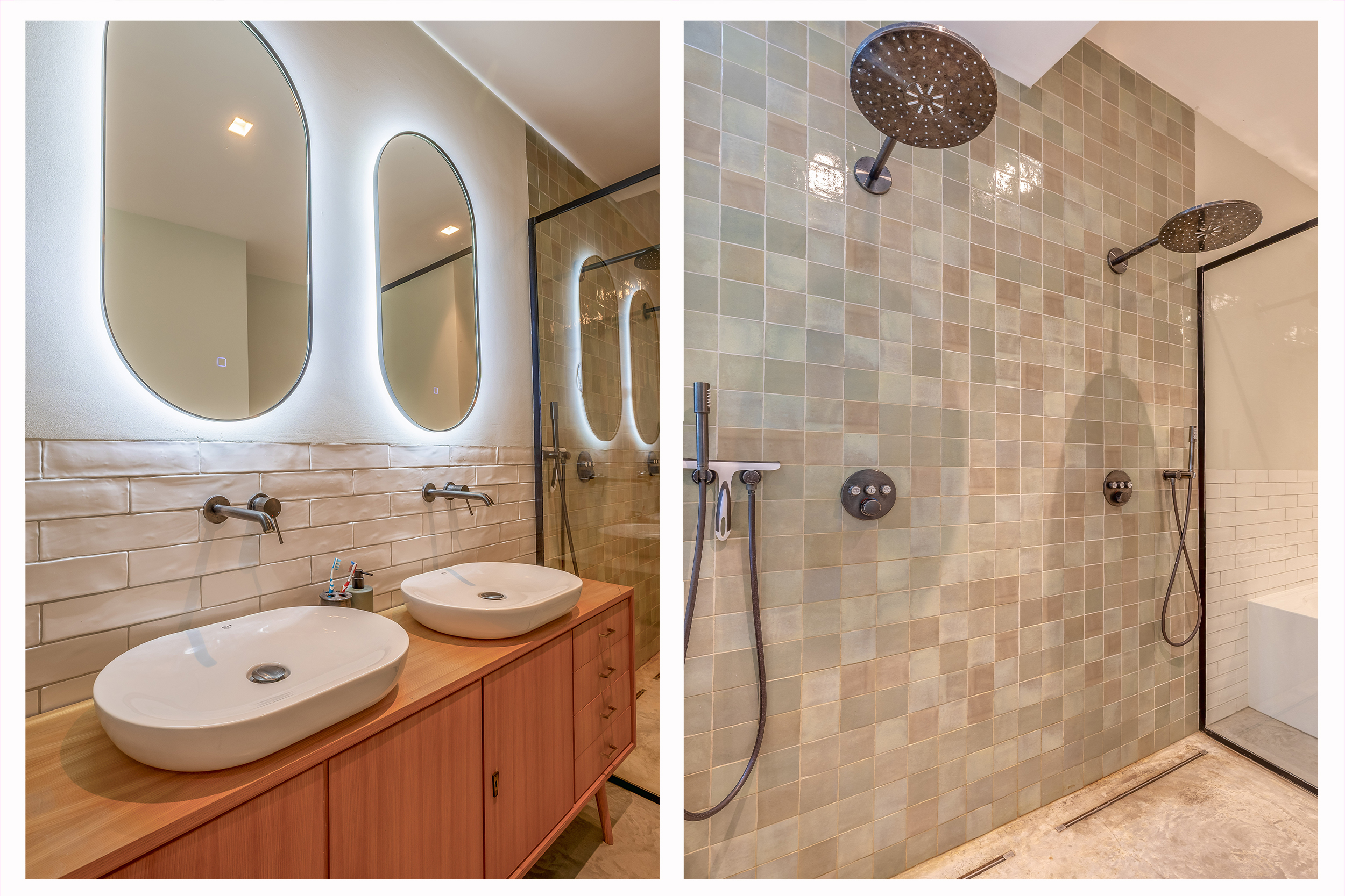Het toilet is voorzien van een fonteintje. De grote en langwerpige badkamer is bereikbaar vanuit beide hallen. De badkamer is uitgerust met een ligbad, een grote, dubbele inloopdouche, een dubbel wastafelmeubel en nog een losse wastafel.