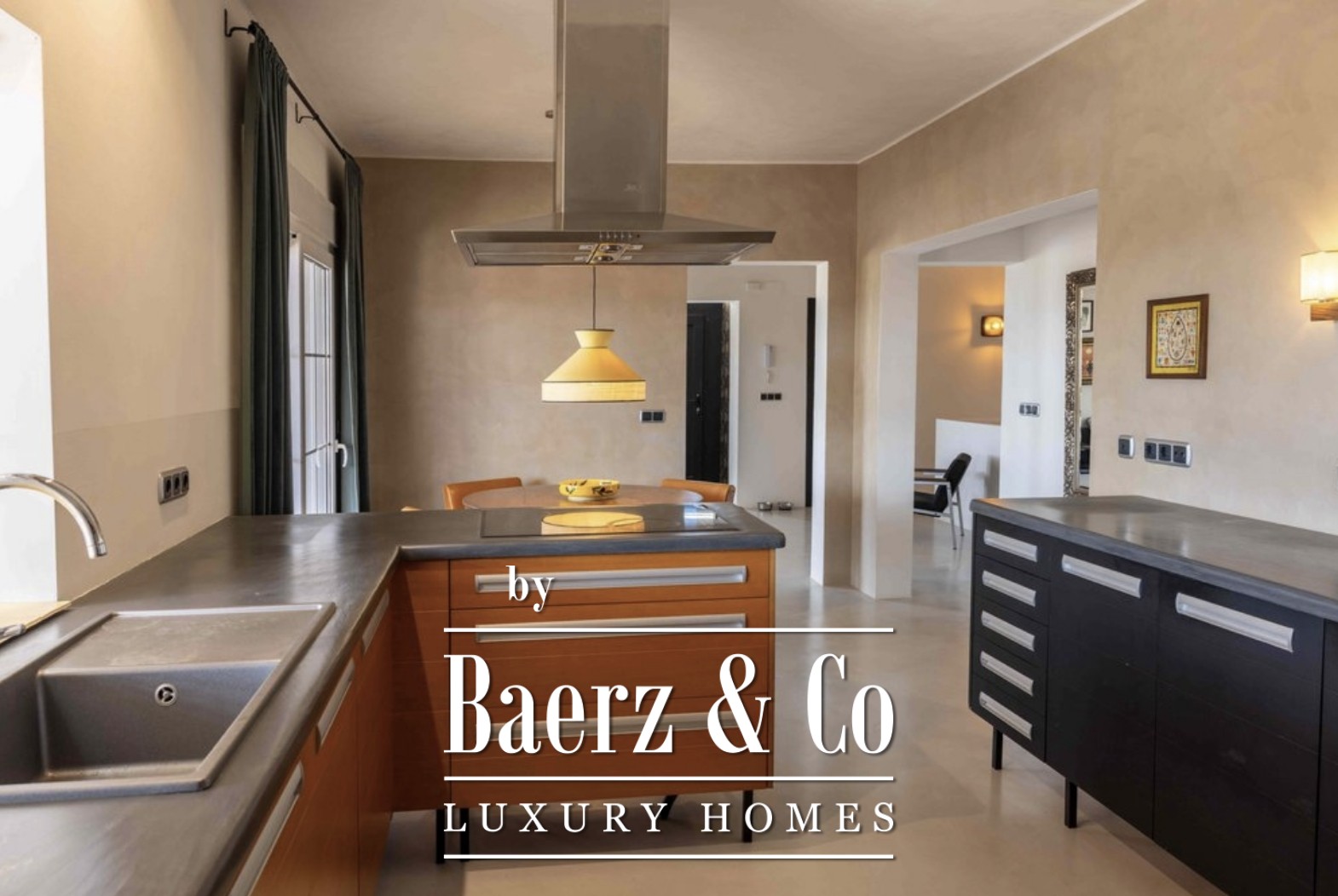 The spacious living room features expansive views of the Montgó, while the large, practical kitchen includes a walk-in pantry and separate utility room. Both the kitchen and living room open directly onto several covered terraces that surround a spectacular 10 x 5 metre swimming pool.