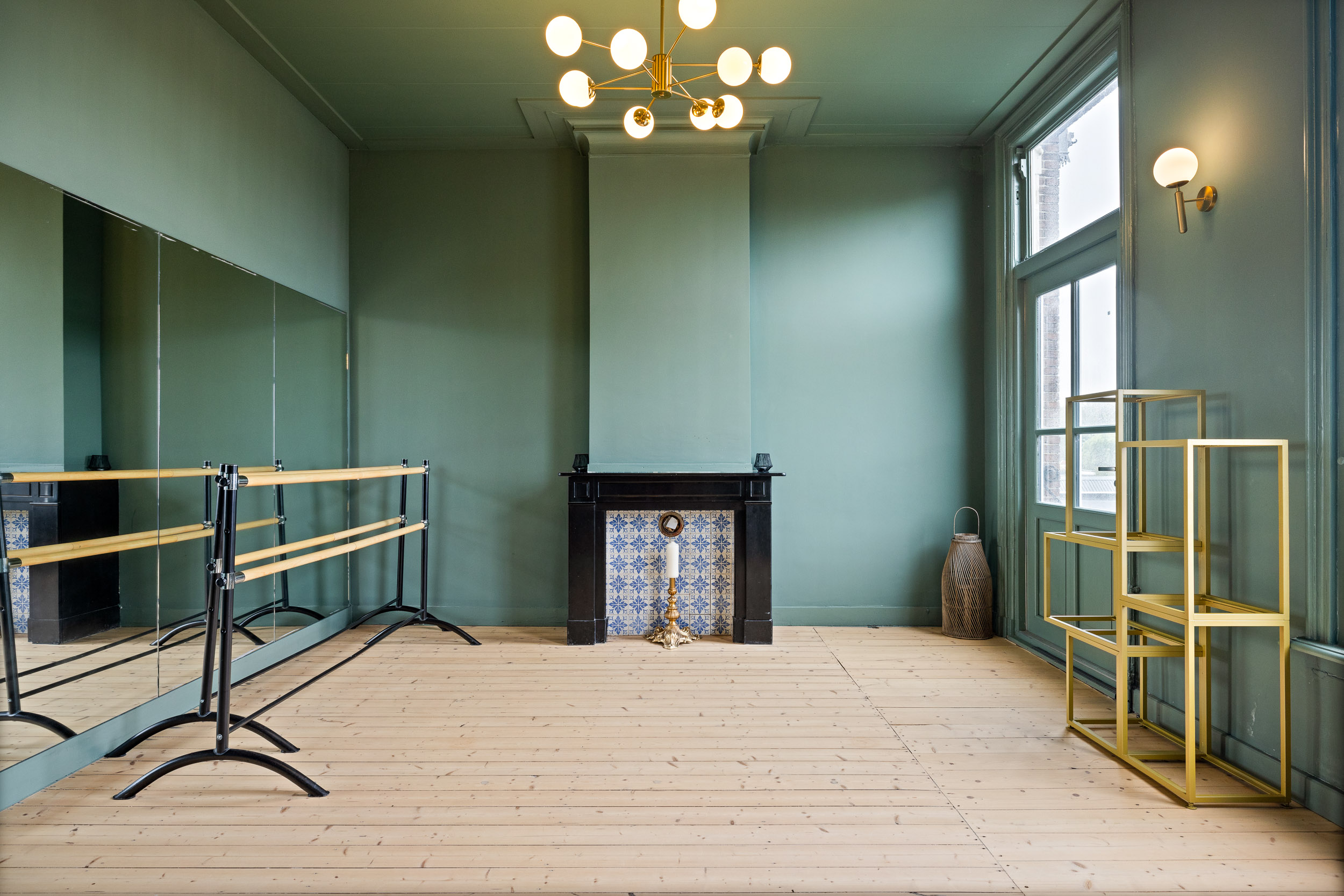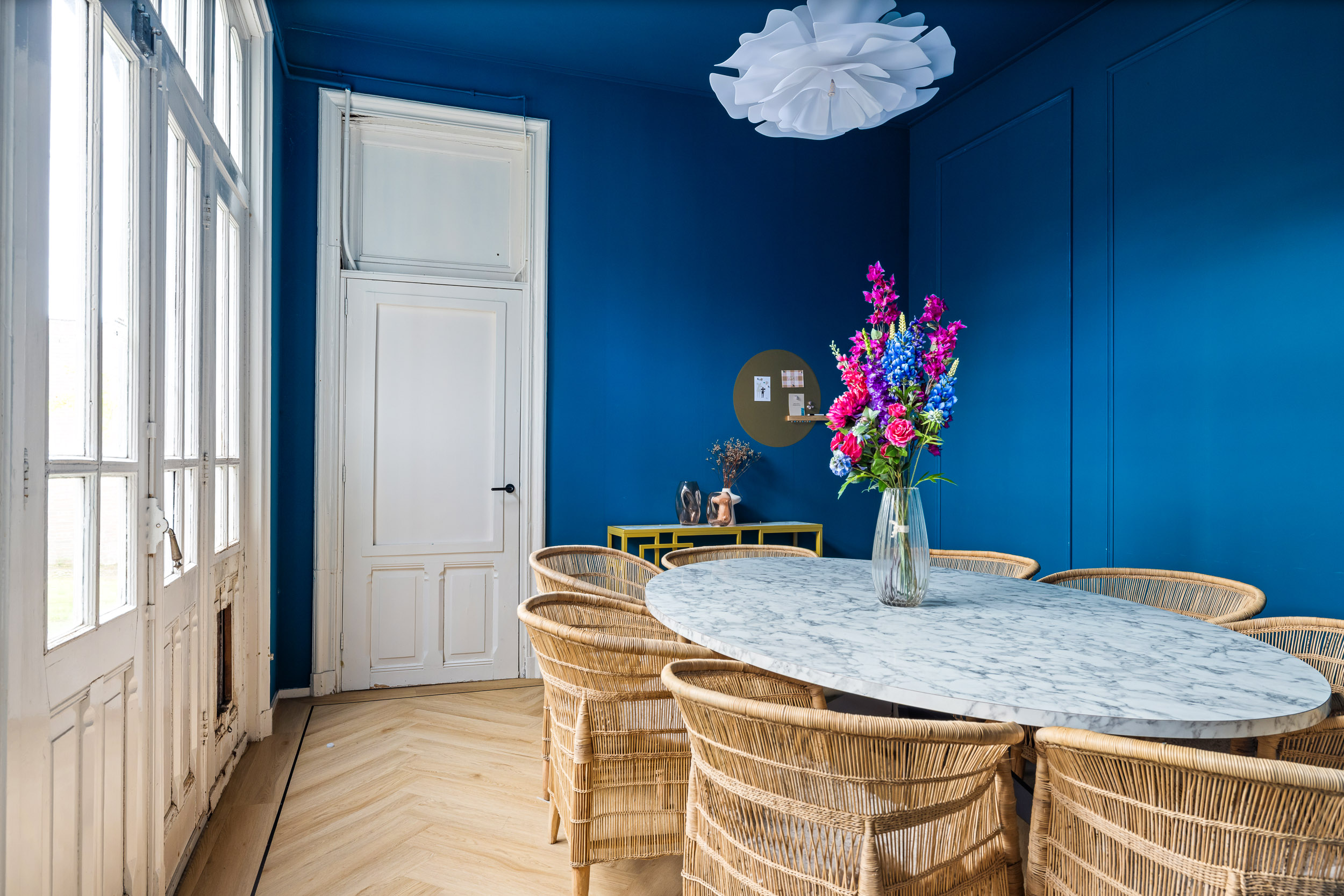 The monumental natural stone staircase with cast-iron balusters leads to the first floor, which has largely retained its original layout. From the landing, an ornate wooden door opens into the tiled hallway. To the right are the rooms en suite with sliding doors featuring brass fittings from Joure’s historic brass foundry. Original details, geometric ceiling mouldings, rosettes, parquet floors and a black marble fireplace, have been beautifully preserved.
