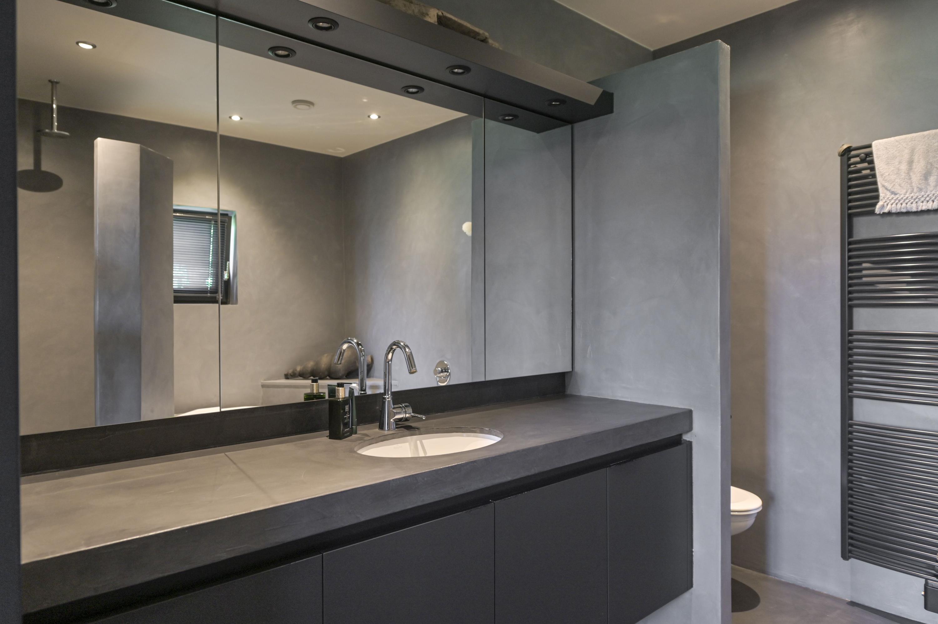 The master bedroom features a wooden floor, fitted wardrobes, and access to the en-suite bathroom through a glass sliding door. This bathroom has been fully renovated with a beton ciré floor and includes a walk-in shower with built-in taps, whirlpool bath, toilet, washbasin with vanity, and natural ventilation through a window.
