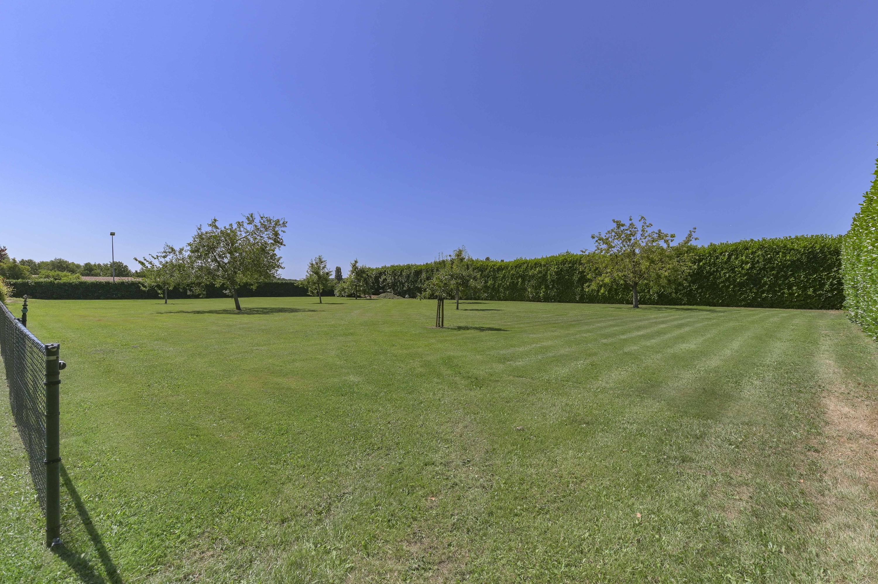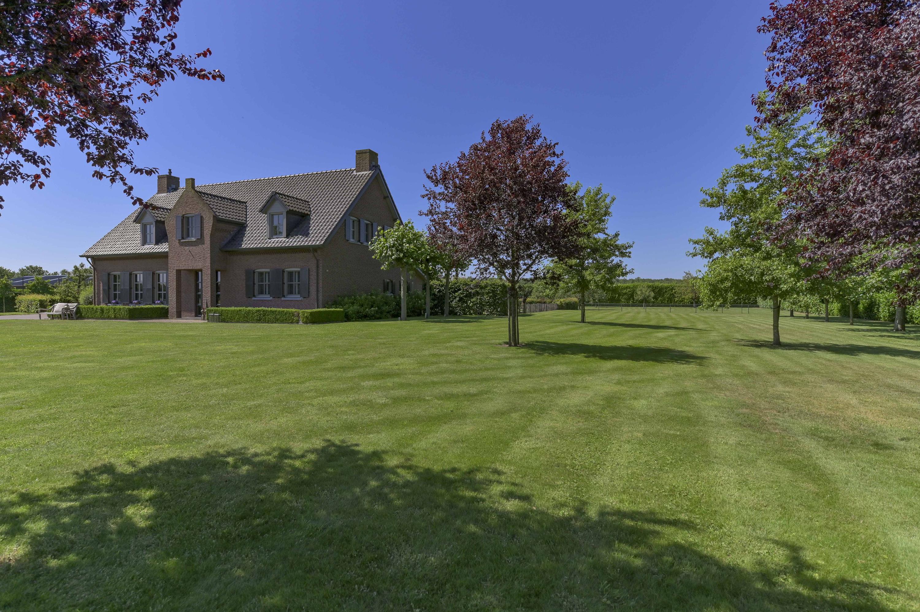 The villa sits on a large plot of 8,832 m² with a beautifully landscaped garden surrounding the house. Expansive lawns, fruit trees and mature plantings create a lush, green setting. At the front, the view stretches across meadows and the river.